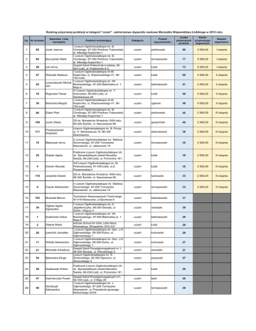 Ranking przyznanej punktacji w kategorii "uczeń" - jednorazowe stypendia naukowe Marszałka Województwa Łódzkiego w 2015 roku Lp. Nr wniosku Nazwisko i imię kandydata Podmiot wnioskujący I Liceum Ogólnokształcące im. B. Chrobrego ,97-300 Piotrkow Trybunalski, al. Mikołaja Kopernika 1 I Liceum Ogólnokształcące im. B. Burczyński Rafał Chrobrego ,97-300 Piotrkow Trybunalski, al. Mikołaja Kopernika 1 Zespół Szkół Politechniki Łódzkiej, 90Łeń Anna 924 Łódź, al. Politechniki 6 A I Liceum Ogólnokształcące im M. Walczak Mateusz Kopernika, ul. Więckowskiego 41, 90734 Łódź I Liceum Ogólnokształcące im. Wł. Lewandowski Michał Broniewskiego, 97-400 Bełchatów,ul. 1 Jan Maja 6 III Liceum Ogólnokształcące im. T. Rogowski Paweł Kościuszki, 90-009 Łódź, ul. Sienkiewicza 46 I Liceum Ogólnokształcące im M. Barańska Magda Kopernika, ul. Więckowskiego 41, 90734 Łódź I Liceum Ogólnokształcące im. B. Żuber Piotr Chrobrego ,97-300 Piotrkow Trybunalski, al. Mikołaja Kopernika 1 1 85 Jurek Joanna 2 84 3 28 4 27 5 45 6 18 7 36 8 86 9 109 Jurek Oliwia 10 111 11 Kategoria Powiat (wg.zamieszk.) Liczba przyznanych punktów Kwota przyznanego stypendium Stopień stypendium uczeń piotrkowski 80 5 000,00 I stopnia uczeń tomaszowski 77 5 000,00 I stopnia uczeń Łódź 73 5 000,00 I stopnia uczeń Łódź 65 4 000,00 II stopnia uczeń bełchatowski 51 4 000,00 II stopnia uczeń Łódź 49 4 000,00 II stopnia uczeń zgierski 49 4 000,00 II stopnia uczeń piotrkowski 45 2 500,00 III stopnia ZS im. Bohaterów Września 1939 roku, 99-320 Żychlin, ul. Narutowicza 88 uczeń gostyniński 40 2 500,00 III stopnia Przybyszewski Wojciech Liceum Ogólnokształcące im. B. Prusa, ul. H. Sienkiewicza 10, 96-100 Skierniewice uczeń skierniewicki 38 2 500,00 III stopnia 15 Błaszczyk Anna II Liceum Ogólnokształcące im. Stefana Żeromskiego, 97-200 Tomaszów Mazowiecki, ul. Jałowcowa 10 uczeń tomaszowski 35 2 500,00 III stopnia 12 25 Dubiak Agata Publiczne Liceum Ogólnokształcące UŁ im. Sprawiedliwych wśród Narodów Świata, 90-236 Łódź, ul. Pomorska 161 uczeń Łódź 35 2 500,00 III stopnia 13 4 Koman Klaudia XIII Liceum Ogólnokształcące im. M. Piotrowiczowej, 91-430 Łódź, ul.Z. Pacanowskiej 4 uczeń Łódź 35 2 500,00 III stopnia 14 110 Justyński Dawid ZS im. Bohaterów Września 1939 roku, 99-320 Żychlin, ul. Narutowicza 88 uczeń kutnowski 33 2 500,00 III stopnia 15 6 Fesiuk Aleksandra II Liceum Ogólnokształcące im. Stefana Żeromskiego, 97-200 Tomaszów Mazowiecki, ul. Jałowcowa 10 uczeń tomaszowski 33 2 500,00 III stopnia 16 103 Muskała Marcin Technikum Nowoczesnych Technologii, 97-410 Kleszczów, ul.Sportowa 8 uczeń bełchatowski 31 17 39 Ogłoza Agata Agnieszka uczeń sieradzki 30 18 1 Szafrański Oskar uczeń bełchatowski 29 19 2 Olejnik Maria uczeń Łódź 29 20 20 Ławnicki Jarosław uczeń kutnowski 29 21 11 Wiklak Aleksandra uczeń kutnowski 27 22 21 Michalak Arkadiusz uczeń sieradzki 27 23 54 Bykowska Kinga uczeń przysuski 27 24 26 Szadowiak Wiktor uczeń Łódź 26 25 47 Kaźmierczak Paweł uczeń łaski 26 26 56 Góralczyk Aleksandra uczeń tomaszowski 26 I Liceum Ogólnokształcące im. K. Jagiellończyka, 98-200 Sieradz, ul. Żwirki i Wigury 3 I Liceum Ogólnokształcące im. Wł. Broniewskiego, 97-400 Bełchatów,ul. 1 Maja 6 Adcote School for Girls, Little Ness, Shrewsbury, Shropshire, SY4 2JY I Liceum Ogólnokształcące im. Gen. J.H. Dąbrowskiego, 99-300 Kutno, ul. Dąbrowskiego 1 I Liceum Ogólnokształcące im. Gen. J.H. Dąbrowskiego, 99-300 Kutno, ul. Dąbrowskiego 1 Zespół Szkół Ponadgimnazjalnych nr 1, 98-200 Sieradz, ul. Piłsudskiego 5 Liceum Ogólnokształcące im. S. Żeromskiego, 26-300 Opoczno, ul. Żeromskiego 3 Publiczne Liceum Ogólnokształcące UŁ im. Sprawiedliwych wśród Narodów Świata, 90-236 Łódź, ul. Pomorska 161 Zespół Szkół Ponadgimnazjalnych nr1, 98-100 Łask, ul. 9 Maja 28 I Liceum Ogólnokształcące im. J. Dąbrowskiego, 97-200 Tomaszów Mazowiecki, ul. Prezydenta Ignacego Mościckiego 22/24 I Liceum Ogólnoksztalcące im. Kazimierza Wielkiego, 98-220 Zduńska Wola, ul. Dabrowskiego 6 I Liceum Ogólnokształcące im. J. Dąbrowskiego, 97-200 Tomaszów Młynarczyk Łukasz Mazowiecki, ul. Prezydenta Ignacego Mościckiego 22/24 I Liceum Ogólnokształcące im. Nowaczyk Katarzyna Tadeusza Kościuszki , 98-300 Wieluń, ul. Nadodrzańska 4 I Liceum Ogólnokształcące im. Bryś Martyna Tadeusza Kościuszki , 98-300 Wieluń, ul. Nadodrzańska 4 I Liceum Ogólnokształcące im. Gen. J.H. Smoliński Hubert Dąbrowskiego, 99-300 Kutno, ul. Dąbrowskiego 1 I Liceum Ogólnokształcące im. K. Janas Adrianna Jagiellończyka, 98-200 Sieradz, ul. Żwirki i Wigury 3 27 114 Golec Kamil uczeń zduńskowolski 26 28 57 uczeń tomaszowski 24 29 8 uczeń wieluński 23 30 10 uczeń wieluński 23 31 12 uczeń kutnowski 23 32 40 uczeń sieradzki 23 33 108 Bilska Natalia ZS im. Bohaterów Września 1939 roku, 99-320 Żychlin, ul. Narutowicza 88 uczeń kutnowski 22 34 38 Konopka Łukasz I Liceum Ogólnokształcące im. K. Jagiellończyka, 98-200 Sieradz, ul. Żwirki i Wigury 3 uczeń zduńskowolski 19 35 7 Kocik Krzysztof II Liceum Ogólnokształcące im. Stefana Żeromskiego, 97-200 Tomaszów Mazowiecki, ul. Jałowcowa 10 uczeń tomaszowski 18 36 23 Górnik Jakub uczeń pajęczański 18 37 29 uczeń Łódź 18 38 46 uczeń opoczyński 18 39 89 uczeń zduńskowolski 18 40 116 uczeń Łódź 18 41 33 uczeń sieradzki 16 42 51 uczeń łaski 15 43 53 uczeń Łódź 15 44 37 uczeń zduńskowolski 14 45 115 uczeń zduńskowolski 14 46 117 uczeń łódzki wschodni 14 47 5 uczeń łowicki 13 48 9 uczeń wieluński 13 49 100 uczeń łaski 13 50 14 uczeń piotrkowski 12 51 30 uczeń radomszczański 12 52 55 uczeń tomaszowski 12 53 17 uczeń Łódź 11 54 19 uczeń Łódź 11 55 22 uczeń pajęczański 11 Zespół Szkół im. Marii Skłodowskiej Curie, 98-355 Działoszyn, ul. Grota Roweckiego 5 Zespół Szkół 