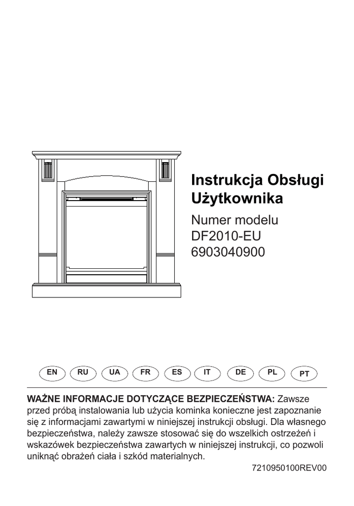 Instrukcja Obsługi Użytkownika Numer modelu DF2010-EU 6903040900 EN RU UA FR ES IT DE PL PT WAŻNE INFORMACJE DOTYCZĄCE BEZPIECZEŃSTWA: Zawsze przed próbą instalowania lub użycia kominka konieczne jest zapoznanie się z informacjami zawartymi w niniejszej instrukcji obsługi. Dla własnego bezpieczeństwa, należy zawsze stosować się do wszelkich ostrzeżeń i wskazówek bezpieczeństwa zawartych w niniejszej instrukcji, co pozwoli uniknąć obrażeń ciała i szkód materialnych. 7210950100REV00 Spis treści Witamy i Gratulacje . . . . . . . . . . . . . . . . . 3 WAŻNE ZALECENIA . . . . . . . . . . . . . . . 4 Montaż kominka . . . . . . . . . . . . . . . . . . 6 Obsługa urządzenia . . . . . . . . . . . . . . . . 8 Utrzymanie i konserwacja . . . . . . . . . . 11 Gwarancja . . . . . . . . . . . . . . . . . . . . . . 12 Zawsze używaj wykwalifikowanego technika lub usługi agencji do naprawy tego kominka. 2 ! WAŻNA INFORMACJA: Czynności i zabiegi uważane za ważne na tyle, że wymagają podkreślenia. UWAGA: Czynności i zabiegi, których nieprzestrzeganie spowoduje uszkodzenie urządzenia. OSTRZEŻENIE: Czynności i zabiegi, których nieprzestrzeganie narazi użytkownika urządzenia na zagrożenie pożarowe, poważne obrażenie ciała, chorobę, lub śmierć. www.dimplex.com Witamy i Gratulacje Dziękujemy za wybór naszego produktu i gratulujemy zakupu kominka elektrycznego firmy Dimplex, światowego lidera w branży kominków elektrycznych. Prosimy o dokładne przeczytanie i zachowanie niniejszych zaleceń. Prosimy zanotować poniżej numer modelu oraz numer seryjny urządzenia, do wykorzystania w czasie jego użytkowania. Numer modelu i seryjny znajdują się na etykiecie z numerem modelu i seryjnym kominka. UWAGA: Wszystkie zalecenia i ostrzeżenia należy przeczytać przed rozpoczęciem instalowania urządzenia. Niedostosowanie się do niniejszych zaleceń może prowadzić do porażenia prądem i zagrożeń pożarowych oraz unieważni gwarację. RYSUNEK 1 Numer modelu Numer seryjny 3 WAŻNE ZALECENIA ① Zapoznać się dokładnie z niniejszą instrukcją przed użyciem urządzenia. ② Wiedzieć, że kominek jest gorący w czasie jego użytkowania. Aby uniknąć poparzenia nie należy dotykać jego elementów gołą skórą. Obudowa wokół wylotu kominka nagrzewa się w czasie pracy grzejnika. Przedmioty łatwoplane, takie jak meble, poduszki, pościel, papier, ubrania, czy firany powinny znajdować się w odległości co najmniej 0,9 m (3 stopy) od urządzenia. ③ Szczególną ostrożność należy zachować, kiedy w pobliżu grzejnika znajdują się dzieci, lub osoby niepełnosprawne, czy też w przypadku pozostawienia włączonego urządzenia bez żadnego nadzoru. ④ Małym dzieciom nie powinno pozwalać się na bawienie się urządzeniem. ⑤ Urządzenie nie jest przewidziane do użycia przez dzieci lub osoby zniedołężniałe bez nadzoru. ⑥ Ustawienie urządzenia musi umożliwiać dostęp do jego wtyczki. ⑦ Urządzenie należy zawsze wyłączać z prądu, gdy nie jest w użyciu. ⑧ Jeśli przewód zasilający urządzenia zostanie uszkodzony, należy skontaktować się z 4 producentem urządzenia, jego przedstawicielem, lub wykwalifikowanym elektrykiem w celu jego wymiany, co zapewni uniknięcie niebezpiecznych sytuacji. ⑨ Nie należy używać urządzenia z zepsutym przewodem zasilającym, wtyczką, jeśli grzejnik wcześniej nie działał, lub kiedy kominek elektryczny został upuszczony, lub uszkodzony w jakimkolwiek zakresie. Grzejnik należy wtedy zanieść do punktu naprawy w celu jego sprawdzenia, regulacji elektrycznej lub mechanicznej, albo naprawy. ⑩ Do użytku w pomieszczeniach zamkniętych. ⑪ Nie należy używać urządzenia w pobliżu łazienki, kabiny prysznicowej, lub basenu. ⑫ Nie należy montować urządzenia bezpośrednio na wykładzinie, lub temu podobnej powierzchni, która może ograniczyć dostęp powietrza pod urządzeniem. ⑬ Nie należy przekładać przewodu zasilającego pod wykładziną. Na przewodzie nie należy również kłaść dywaników, bieżników i tym podobnych. Przewód powinien być tak umiejscowiony, żeby nie przeszkadzał osobom przechodzącym i nie stanowił zagrożenia potknięcia się o niego. ⑭ Urządzenia nie należy montować bezpośrednio pod gniazdkiem w www.dimplex.com WAŻNE ZALECENIA ścianie. ⑮ Urządzenia nie należy montować bezpośrednio przed gniazdkiem w ścianie. ⑯ Aby odłączyć urządzenie, należy wyłączyć przyciski, a następnie wyciągnąć wtyczkę z gniazdka. ⑰ Nie należy dopuścić do tego, aby w otworach wylotowych czy wentylacyjnych urządzenia znajdowały się jakieś przedmioty, ponieważ mogą one spowodować porażenie prądem, pożar, lub uszkodzić urządzenie. ⑱ Aby zapobiec ewentualności pożaru, nie należy w żaden sposób blokować wlotów i wylotów powietrza. Nie należy używać na podłożach miękkich, jak na przykład łóżko, które mogą spowodować zablokowanie otwarć urządzenia. ⑲ Wszystkie urządzenia elektryczne posiadają wewnątrz gorące elementy łukowe lub iskrowe. Urządzenie nie może być używane w pomieszczeniach, gdzie przechowuje się paliwo, farby lub łatwopalne płyny, albo w miejscach, gdzie możliwy jest jego kontakt z oparami łatwopalnymi. ⑳ Kominek elektryczny nie powinien być przerabiany. Należy go używać zgodnie z zaleceniami zawartymi w niniejszej instrukcji. Eksploatacja urządzenia niezgodna z zaleceniami producenta może spowodować pożar, porażenie prądem, lub obrażenia ciała. ㉑ Należy unikać stosowania przedłużacza. Przedłużacz może ulec przegrzaniu i stanowić zagrożenie pożarowe. Jeśli użycie przedłużacza jest konieczne, powinien to być przedłużacz posiadający 3 gniazda z bolcem, przeznaczony do natężeń prądu co najmniej 13 Amp. ㉒ W kominku elektrycznym nie należy spalać drewna lub innych materiałów. ㉓ Nie należy uderzać szyby kominka. ㉔ Do instalowania nowych