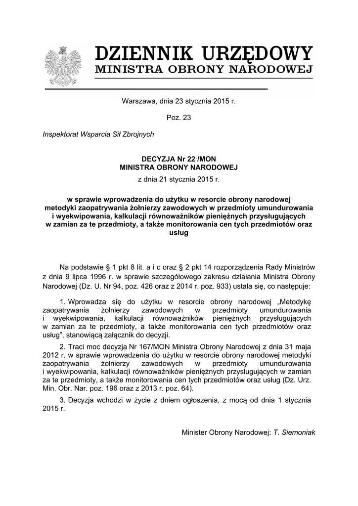 Decyzja Nr 22 MON z dnia 21 stycznia 2015 r. w