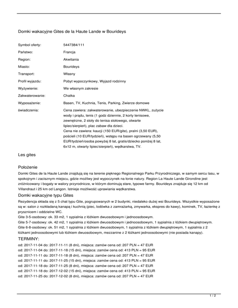 Domki wakacyjne Gites de la Haute Lande w Bourideys Symbol oferty: 5447384/111 Państwo: Francja Region: Akwitania Miasto: Bourideys Transport: Własny Profil wyjazdu: Pobyt wypoczynkowy, Wyjazd rodzinny Wyżywienie: We własnym zakresie Zakwaterowanie: Chatka Wyposażenie: Basen, TV, Kuchnia, Tenis, Parking, Zwierze domowe świadczenia: Cena zawiera: zakwaterowanie, ubezpieczenie NWKL, zużycie wody i prądu, tenis (1 godz dziennie, 2 korty tenisowe, zewnętrzne, 2 stoły do tenisa stołowego, otwarte lipiec/sierpień), plac zabaw dla dzieci. Cena nie zawiera: kaucji (150 EUR/gite), pralni (3,50 EUR), pościeli (10 EUR/tydzień), wstępu na basen ogrzewany (5,50 EUR/tydzień/osoba powyżej 8 lat, gratis/dziecko poniżej 8 lat, 6x12 m, otwarty lipiec/sierpień), wędkarstwa, TV. Les gites Położenie Domki Gites de la Haute Lande znajdują się na terenie pięknego Regionalnego Parku Przyrodniczego, w samym sercu lasu, w spokojnym i zacisznym miejscu, gdzie możliwy jest wypoczynek na łonie natury. Region La Haute Lande Girondine jest zróżnicowany i bogaty w walory przyrodnicze, w którym dominują stare, typowe farmy. Bourideys znajduje się 12 km od Villandraut i 25 km od Langon. Istnieje możliwość uprawiania wędkarstwa. Domki wakacyjne typu Gites Rezydencja składa się z 5 chat typu Gite, pogrupowanych w 2 budynki, niedaleko dużej wsi Bourideys. Wszystkie wyposażone są w: salon z rozkładaną kanapą i kuchnią (piec, lodówka z zamrażarką, zmywarka, ekspres do kawy), kominek, TV, łazienkę z prysznicem i oddzielne WC. Gite 3-5-osobowy: ok. 33 m2, 1 sypialnia z łóżkiem dwuosobowym i jednoosobowym. Gite 5-7-osobowy: ok. 42 m2, 1 sypialnia z łóżkiem dwuosobowym i jednoosobowym, 1 sypialnia z łóżkiem dwupiętrowym. Gite 6-8-osobowy: ok. 51 m2, 1 sypialnia z łóżkiem dwuosobowym, 1 sypialnia z łóżkiem dwupiętrowym, 1 sypialnia z 2 łóżkami jednoosobowymi lub łóżkiem dwuosobowym, mezzanine z 2 łóżkami jednoosobowymi (nie posiada kanapy). TERMINY: od: 2017-11-04 do: 2017-11-11 (8 dni), miejsca: zamów cena od: 207 PLN = 47 EUR od: 2017-11-04 do: 2017-11-18 (15 dni), miejsca: zamów cena od: 413 PLN = 95 EUR od: 2017-11-11 do: 2017-11-18 (8 dni), miejsca: zamów cena od: 207 PLN = 47 EUR od: 2017-11-11 do: 2017-11-25 (15 dni), miejsca: zamów cena od: 413 PLN = 95 EUR od: 2017-11-18 do: 2017-11-25 (8 dni), miejsca: zamów cena od: 207 PLN = 47 EUR od: 2017-11-18 do: 2017-12-02 (15 dni), miejsca: zamów cena od: 413 PLN = 95 EUR od: 2017-11-25 do: 2017-12-02 (8 dni), miejsca: zamów cena od: 207 PLN = 47 EUR 1/2 od: 2017-11-25 do: 2017-12-09 (15 dni), miejsca: zamów cena od: 413 PLN = 95 EUR od: 2017-12-02 do: 2017-12-09 (8 dni), miejsca: zamów cena od: 207 PLN = 47 EUR od: 2017-12-02 do: 2017-12-18 (17 dni), miejsca: zamów cena od: 413 PLN = 95 EUR od: 2017-12-09 do: 2017-12-18 (10 dni), miejsca: zamów cena od: 207 PLN = 47 EUR CENNIK: Długość pobytu: 15 dni 8 dni 17 dni 10 dni Grupa cenowa: A A A A 450 225 404 202 494 247 7 14 7 2.4 % 2.4 % 2.4 % Pobyt w obiekcie (do wyboru) domek typu Gite 5-7-osobowy standardowo dla osób: 7 minimalnie: 5 450 225 (*) Domek typu Gite 3-5-osobowa standardowo dla osób: 5 minimalnie: 3 404 202 domek typu Gite 6-8-osobowy standardowo dla osób: 8 minimalnie: 6 494 247 Ubezpieczenie (do wyboru) (*) ubezpieczenie NWKLSKI Ubezpieczenie (opcjonalne) 14 ubezpieczenie od kosztów rezygnacji 2.4 % Waluta: EUR Aktualne ceny z systemu S.A.R.T. (-) - cena usługi, podatku kalkulowana przy osobie lub gratis (*) - kwota wliczona w cenę standardową 2/2