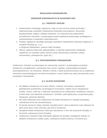 REGULAMIN MIESZKAŃCÓW MIESZKAŃ KOMUNALNYCH W GŁOGOWIE MŁP. § 1. PRZEPISY OGÓLNE 1. Postanowienia niniejszego regulaminu mają na celu ochronę mienia gminnego i własnościowego wszystkich mieszkańców budynków komunalnych; utrzymanie bezpieczeństwa, higieny i estetyki budynków i ich otoczenia oraz zapewnienie prawidłowych warunków i przestrzegania zasad współżycia społecznego wynikających z zamieszkiwania w budynkach wielorodzinnych. 2. Przepisy regulaminu określają obowiązki wszystkich mieszkańców budynków będących w zarządzie EkoGłog sp. z o.o. w Głogowie Małopolskim, zwanym dalej Zarządcą. 3. Główny najemca lokalu jest odpowiedzialny w zakresie postanowień niniejszego regulaminu za wszystkie osoby, których prawa reprezentuje (członków rodziny, domowników, podnajemców, gości itp.). § 2. POSTANOWIENIA PORZĄDKOWE Użytkownicy mieszkań są zobowiązani do zachowania czystości i przestrzegania przepisów sanitarnych, porządkowych, zachowania ciszy nocnej i spokoju, przestrzegania przepisów przeciwpożarowych, nie niszczenia i dbania o mienie, a także powstrzymywania się od uciążliwych zachowań uniemożliwiających normalne korzystanie z innych lokali oraz całej nieruchomości przez pozostałych mieszkańców. § 3. KLATKI SCHODOWE 1. Na klatkach schodowych nie wolno śmiecić, rozlewać nieczystości, pozostawiać jakichkolwiek przedmiotów utrudniających korzystanie z klatek innym mieszkańcom (meble, rowery, wózki itp.), blokować automatycznych wyłączników oświetlenia, niszczyć i brudzić ścian oraz balustrad schodowych i schodów, palić papierosów, przyjmować gości, hałasować, spożywać alkoholu. 2. Nie wolno blokować drzwi wejściowych do klatek schodowych w sposób powodujący uszkodzenia drzwi lub samozamykaczy. 3. W okresie zimowym należy zamykać wszystkie drzwi i okna (wietrzenie może odbywać sie tylko przez okna i tylko wówczas, gdy jest to konieczne). 4. Sprzątanie klatek schodowych wykonuje zatrudniony w tym celu pracownik Zarządcy w terminach wskazanych przez Zarządcę. 5. Użytkownicy mieszkań maja obowiązek zgłaszać do Zarządcy wystąpienie usterek na klatkach schodowych (wybite szyby, uszkodzona stolarka okienna i drzwiowa itp.). 6. Wynajem części klatki schodowej lub wykorzystanie jej w innym celu niż dojście do mieszkań może być dokonane tylko za zgodą Zarządcy i przy pozytywnej opinii pozostałych mieszkańców budynku. 7. Nie wolno naprawiać we własnym zakresie bezpieczników poza obrębem mieszkania oraz manipulować przy instalacji elektrycznej. W przypadku uszkodzenia instalacji elektrycznej lub gazowej należy w miarę możliwości ją zabezpieczyć i natychmiast powiadomić Zarządcę. § 4. PIWNICE I KORYTARZE PIWNICZNE 1. Każdemu użytkownikowi mieszkania przysługuje jedna piwnica jako pomieszczenie przynależne do mieszkania. Na wyłączne korzystanie z innych pomieszczeń piwnicznych musi być zawarta umowa najmu z Zarządcą, po uprzednim wyrażeniu zgody pozostałych użytkowników mieszkań w budynku. 2. Drzwi wejściowe do piwnic powinny być zamykane na klucz. Na żądanie mieszkańców Zarządca dokonuje wymiany zamka w drzwiach piwnicznych i dostarcza (odpłatnie) klucze. 3. W piwnicach nie wolno przechowywać materiałów łatwopalnych (benzyny, oleju napędowego, gazu itp.) oraz środków wydzielających nieprzyjemny zapach (środki ochrony roślin, kiszona beczkowana kapusta itp.). 4. Zabronione jest przetrzymywanie w piwnicy motocykli, motorowerów, pił spalinowych, kosiarek itp. 5. Użytkownik mieszkania może w piwnicy za zgoda Zarządcy, na własny koszt wykonać instalacje elektryczna wyłącznie w celu oświetlenia pomieszczenia. Wykonaną instalację należy zgłosić do odbioru Zarządcy. 6. Zabrania sie używania wszelkich urządzeń elektrycznych (poza oświetleniem) w piwnicach. 7. Zabronione jest palenie papierosów i używanie otwartego ognia, a także składowanie śmieci w piwnicach oraz korytarzach piwnicznych. 8. Zabronione jest bezpodstawne przebywanie w piwnicach wszelkich osób niebędących mieszkańcami budynku. 9. Użytkownik mieszkania ma obowiązek udostępnić osobie uprawnionej dojście do wodomierzy głównych, zaworów wodociągowych oraz rewizji kanalizacyjnych znajdujących sie w jego piwnicy, w razie nagłej potrzeby, w przypadku zagrożenia bezpieczeństwa, także w godzinach nocnych 10. Wszystkie pomieszczenia piwniczne powinny być wykorzystywane zgodnie z ich przeznaczeniem. W szczególności zabrania sie: przechowywania w nich zbędnych przedmiotów oraz urządzania klubów, palenia papierosów i picia alkoholu. § 5. TRZEPANIE 1. Trzepanie można wykonywać wyłącznie na trzepakach w godz. od 8.00 do 20.00 (z wyjątkiem niedziel i świat). 2. Nie wolno trzepać na balkonach, oknach, loggiach i klatkach schodowych. 3. Zabronione jest wykonywania na trzepakach innych czynności poza trzepaniem oraz przetrzymywania na nich rzeczy przez dłuższy czas (wietrzenie, suszenie dywanów, pościeli itp.). § 6. ZACHOWANIE CZYSTOŚCI, CISZY I SPOKOJU 1. Śmieci i odpadki stałe należy wynosić i składać w pojemnikach i workach do tego przeznaczonych. 2. Stare meble i sprzęty należy wywozić do wyznaczonego przez Urząd Miejski w Głogowie Młp. Punku Selektywnej Zbiórki Odpadów 3. Zabronione jest wyrzucanie śmieci do wystawionych na terenie osiedla koszy na śmieci, wyrzucanie śmieci z balkonów, loggii i okien oraz zaśmiecanie trawników i pomieszczeń wspólnego użytku a także gromadzenie śmieci w mieszkaniach i piwnicach. 4. Zabrania sie hodowli i przetrzymywania drobiu, królików, gołębi i innych zwierząt w pomieszczeniach piwnicznych, na balkonach oraz loggiach. 5. Kwiaty w oknach na balkonach i loggiach winny być zabezpieczone przed wypadnięciem. Podlewanie kwiatów winno odbywać sie tak, aby woda nie przeciekała, ani nie przelewała się na niższe pietra i nie niszczyła elewacji. 6. Niedozwolone jes