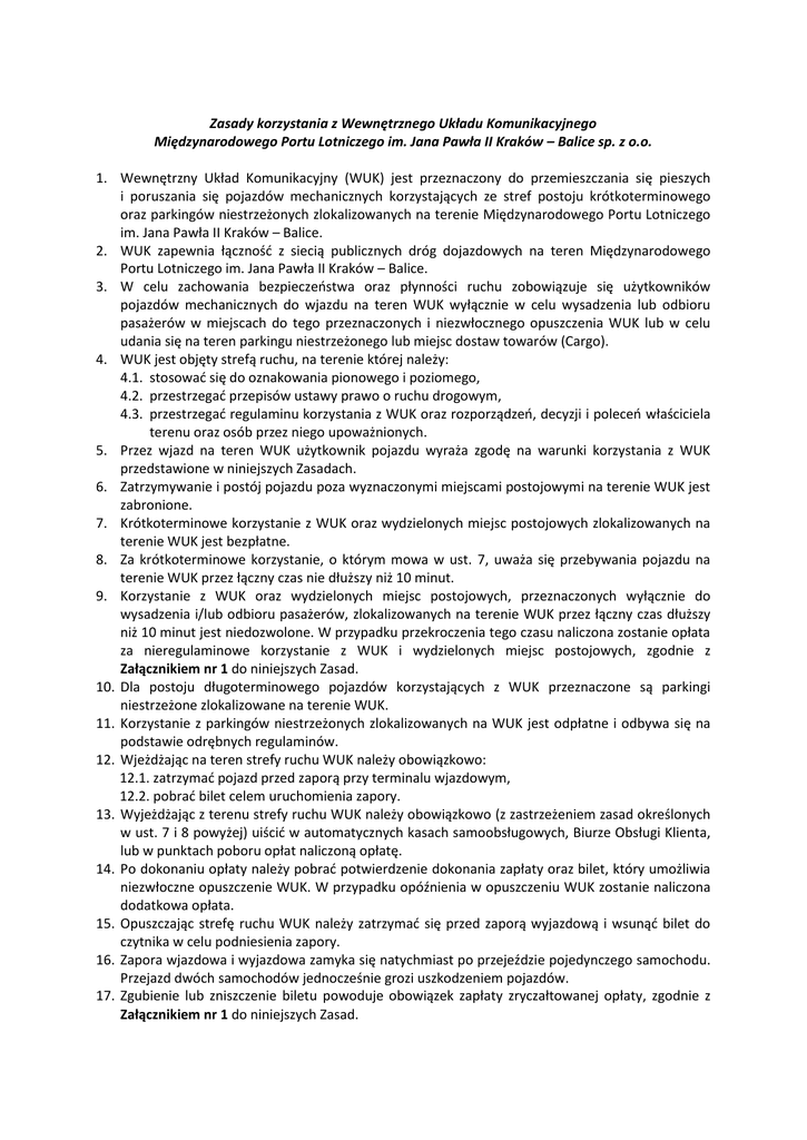 Zasady korzystania z Wewnętrznego Układu Komunikacyjnego Międzynarodowego Portu Lotniczego im. Jana Pawła II Kraków – Balice sp. z o.o. 1. Wewnętrzny Układ Komunikacyjny (WUK) jest przeznaczony do przemieszczania się pieszych i poruszania się pojazdów mechanicznych korzystających ze stref postoju krótkoterminowego oraz parkingów niestrzeżonych zlokalizowanych na terenie Międzynarodowego Portu Lotniczego im. Jana Pawła II Kraków – Balice. 2. WUK zapewnia łączność z siecią publicznych dróg dojazdowych na teren Międzynarodowego Portu Lotniczego im. Jana Pawła II Kraków – Balice. 3. W celu zachowania bezpieczeństwa oraz płynności ruchu zobowiązuje się użytkowników pojazdów mechanicznych do wjazdu na teren WUK wyłącznie w celu wysadzenia lub odbioru pasażerów w miejscach do tego przeznaczonych i niezwłocznego opuszczenia WUK lub w celu udania się na teren parkingu niestrzeżonego lub miejsc dostaw towarów (Cargo). 4. WUK jest objęty strefą ruchu, na terenie której należy: 4.1. stosować się do oznakowania pionowego i poziomego, 4.2. przestrzegać przepisów ustawy prawo o ruchu drogowym, 4.3. przestrzegać regulaminu korzystania z WUK oraz rozporządzeń, decyzji i poleceń właściciela terenu oraz osób przez niego upoważnionych. 5. Przez wjazd na teren WUK użytkownik pojazdu wyraża zgodę na warunki korzystania z WUK przedstawione w niniejszych Zasadach. 6. Zatrzymywanie i postój pojazdu poza wyznaczonymi miejscami postojowymi na terenie WUK jest zabronione. 7. Krótkoterminowe korzystanie z WUK oraz wydzielonych miejsc postojowych zlokalizowanych na terenie WUK jest bezpłatne. 8. Za krótkoterminowe korzystanie, o którym mowa w ust. 7, uważa się przebywania pojazdu na terenie WUK przez łączny czas nie dłuższy niż 10 minut. 9. Korzystanie z WUK oraz wydzielonych miejsc postojowych, przeznaczonych wyłącznie do wysadzenia i/lub odbioru pasażerów, zlokalizowanych na terenie WUK przez łączny czas dłuższy niż 10 minut jest niedozwolone. W przypadku przekroczenia tego czasu naliczona zostanie opłata za nieregulaminowe korzystanie z WUK i wydzielonych miejsc postojowych, zgodnie z Załącznikiem nr 1 do niniejszych Zasad. 10. Dla postoju długoterminowego pojazdów korzystających z WUK przeznaczone są parkingi niestrzeżone zlokalizowane na terenie WUK. 11. Korzystanie z parkingów niestrzeżonych zlokalizowanych na WUK jest odpłatne i odbywa się na podstawie odrębnych regulaminów. 12. Wjeżdżając na teren strefy ruchu WUK należy obowiązkowo: 12.1. zatrzymać pojazd przed zaporą przy terminalu wjazdowym, 12.2. pobrać bilet celem uruchomienia zapory. 13. Wyjeżdżając z terenu strefy ruchu WUK należy obowiązkowo (z zastrzeżeniem zasad określonych w ust. 7 i 8 powyżej) uiścić w automatycznych kasach samoobsługowych, Biurze Obsługi Klienta, lub w punktach poboru opłat naliczoną opłatę. 14. Po dokonaniu opłaty należy pobrać potwierdzenie dokonania zapłaty oraz bilet, który umożliwia niezwłoczne opuszczenie WUK. W przypadku opóźnienia w opuszczeniu WUK zostanie naliczona dodatkowa opłata. 15. Opuszczając strefę ruchu WUK należy zatrzymać się przed zaporą wyjazdową i wsunąć bilet do czytnika w celu podniesienia zapory. 16. Zapora wjazdowa i wyjazdowa zamyka się natychmiast po przejeździe pojedynczego samochodu. Przejazd dwóch samochodów jednocześnie grozi uszkodzeniem pojazdów. 17. Zgubienie lub zniszczenie biletu powoduje obowiązek zapłaty zryczałtowanej opłaty, zgodnie z Załącznikiem nr 1 do niniejszych Zasad. 18. Wysokość opłaty za nieregulaminowe korzystanie z wydzielonych miejsc postojowych, niestrzeżonych znajdujących się na terenie WUK stanowi Załącznik nr 1 do niniejszych Zasad. 19. Cenniki za korzystanie z parkingów niestrzeżonych znajdujących się na terenie WUK stanowią Załączniki nr 2 i 3 do niniejszych Zasad. 20. W uzasadnionych przypadkach Międzynarodowy Port Lotniczy im. Jana Pawła II Kraków – Balice sp. z o.o. zastrzega sobie prawo do indywidualnego ustalenia odrębnych zasad, cenników i opłat za korzystania z WUK i wydzielonych miejsc postojowych. 21. Niniejszy dokument wydano na podstawie § 7 ust. 1 Regulaminu korzystania z Wewnętrznego Układu Komunikacyjnego na terenie będącym w zarządzie spółki Międzynarodowy Port Lotniczy im. Jana Pawła II Kraków - Balice sp. z o.o. z dnia 01.10.2015 roku (z późn. zm.). 22. Wszelkie uwagi, skargi i wnioski osoby korzystające z wydzielonych miejsc postojowych na WUK oraz parkingów niestrzeżonych zlokalizowanych na terenie WUK mogą składać w formie pisemnej lub ustnej w Biurze Obsługi Klienta, znajdującym się przy wyjeździe z Parkingu wielopoziomowego oraz drogą mailową na adres: [email protected].