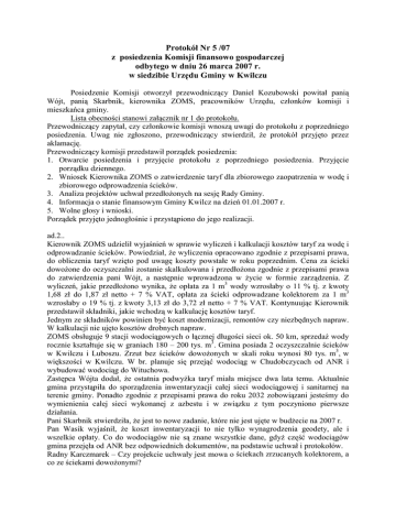 Protokół Nr 5 /07 z posiedzenia Komisji finansowo gospodarczej odbytego w dniu 26 marca 2007 r. w siedzibie Urzędu Gminy w Kwilczu Posiedzenie Komisji otworzył przewodniczący Daniel Kozubowski powitał panią Wójt, panią Skarbnik, kierownika ZOMS, pracowników Urzędu, członków komisji i mieszkańca gminy. Lista obecności stanowi załącznik nr 1 do protokołu. Przewodniczący zapytał, czy członkowie komisji wnoszą uwagi do protokołu z poprzedniego posiedzenia. Uwag nie zgłoszono, przewodniczący stwierdził, Ŝe protokół przyjęto przez aklamację. Przewodniczący komisji przedstawił porządek posiedzenia: 1. Otwarcie posiedzenia i przyjęcie protokołu z poprzedniego posiedzenia. Przyjęcie porządku dziennego. 2. Wniosek Kierownika ZOMS o zatwierdzenie taryf dla zbiorowego zaopatrzenia w wodę i zbiorowego odprowadzenia ścieków. 3. Analiza projektów uchwał przedłoŜonych na sesję Rady Gminy. 4. Informacja o stanie finansowym Gminy Kwilcz na dzień 01.01.2007 r. 5. Wolne głosy i wnioski. Porządek przyjęto jednogłośnie i przystąpiono do jego realizacji. ad.2.. Kierownik ZOMS udzielił wyjaśnień w sprawie wyliczeń i kalkulacji kosztów taryf za wodę i odprowadzanie ścieków. Powiedział, Ŝe wyliczenia opracowano zgodnie z przepisami prawa, do obliczenia taryf wzięto pod uwagę koszty powstałe w roku poprzednim. Cena za ścieki dowoŜone do oczyszczalni zostanie skalkulowana i przedłoŜona zgodnie z przepisami prawa do zatwierdzenia pani Wójt, a następnie wprowadzona w Ŝycie w formie zarządzenia. Z wyliczeń, jakie przedłoŜono wynika, Ŝe opłata za 1 m3 wody wzrosłaby o 11 % tj. z kwoty 1,68 zł do 1,87 zł netto + 7 % VAT, opłata za ścieki odprowadzane kolektorem za 1 m3 wzrosłaby o 19 % tj. z kwoty 3,13 zł do 3,72 zł netto + 7 % VAT. Kontynuując Kierownik przedstawił składniki, jakie wchodzą w kalkulację kosztów taryf. Jednym ze składników powinien być koszt modernizacji, remontów czy niezbędnych napraw. W kalkulacji nie ujęto kosztów drobnych napraw. ZOMS obsługuje 9 stacji wodociągowych o łącznej długości sieci ok. 50 km, sprzedaŜ wody rocznie kształtuje się w graniach 180 – 200 tys. m3. Gmina posiada 2 oczyszczalnie ścieków w Kwilczu i Luboszu. Zrzut bez ścieków dowoŜonych w skali roku wynosi 80 tys. m3, w większości w Kwilczu. W br. planuje się przejąć wodociąg w Chudobczycach od ANR i wybudować wodociąg do Wituchowa. Zastępca Wójta dodał, Ŝe ostatnia podwyŜka taryf miała miejsce dwa lata temu. Aktualnie gmina przystąpiła do sporządzenia inwentaryzacji całej sieci wodociągowej i sanitarnej na terenie gminy. Ponadto zgodnie z przepisami prawa do roku 2032 zobowiązani jesteśmy do wymienienia całej sieci wykonanej z azbestu i w związku z tym poczyniono pierwsze działania. Pani Skarbnik stwierdziła, Ŝe jest to nowe zadanie, które nie jest ujęte w budŜecie na 2007 r. Pan Wasik wyjaśnił, Ŝe koszt inwentaryzacji to nie tylko wynagrodzenia geodety, ale i wszelkie opłaty. Co do wodociągów nie są znane wszystkie dane, gdyŜ część wodociągów gmina przejęła od ANR bez odpowiednich dokumentów, na podstawie uchwał i protokołów. Radny Karczmarek – Czy projekcie uchwały jest mowa o ściekach zrzucanych kolektorem, a co ze ściekami dowoŜonymi? Pan Wasik odpowiedział, Ŝe ścieki dowoŜone nie znajdują się w omawianych taryfach, będą one ujęte w zarządzeniu pani Wójt. Radny Lehmann zapytał, jaka ilość stanowią ścieki dowoŜone? Pan Wasik - w Kwilczu jest to około 20 tys. m3, natomiast w Luboszu około 12-14 tys. m3. Pan Lehmann stwierdził, Ŝe opłaty za ścieki dowoŜone są duŜe i część nieczystości wywoŜone jest na pola. Pan Wasik – odpowiedział, Ŝe nie ma innego wyjścia, być moŜe w przyszłości wszystkie wioski zostaną skanalizowane. Zdaniem pana Stanisławskiego wzrost opłat jest znaczny. Pan Wasik odpowiedział, Ŝe wzrost jest, ale nie wysoki. Następnie przedstawił stawki gmin sąsiednich i powiedział o dotacjach. Na posiedzenie przybył Przewodniczący Rady. W dalszej części podjęto dyskusję nt. zaległości w opłatach i działaniach w tym zakresie. Pani Wójt uwaŜa, Ŝe podwyŜka 11 i 19 % jest znaczna, gdyby miała być niŜsza naleŜałoby rozwaŜyć moŜliwości dotowania przez gminę. Pan Wasik przedstawił informację o ściągalności naleŜności za wodę i ścieki. Przewodniczący Rady stwierdził, Ŝe przedstawione taryfy wyliczono na podstawie faktycznych kosztów zgodnie z przepisami prawa. Dodał, Ŝe na komisji oświaty kierownik na pytanie, czy w taryfie są teŜ koszty ścieków dowoŜonych, odpowiedział, Ŝe częściowo tak, nie ma wykazanej ilości ścieków dowoŜonych. Pytano o wysokość opłaty za zrzut ścieków dowoŜonych, na co uzyskano odpowiedź, Ŝe stawka zostanie wyliczona zgodnie z przepisami prawa, a następnie przedstawiona do zatwierdzenia i wprowadzenia w Ŝycie na mocy zarządzenia Wójta Gminy. Sugerował stawki za zrzut niŜsze z uwagi na dodatkowe opłaty za transport. Aktualnie stawka wynosi 2,- zł, proponuje obniŜyć do 1,- zł. Pani Wójt powiedziała iŜ nie posiada jeszcze kalkulacji i w związku z tym trudno podjąć decyzję. Zastępca Wójta dodał, Ŝe znane jest stanowisko komisji samorządowo oświatowej, po uzyskaniu stanowiska komisji finansowo gospodarczej i przedstawieniu kosztów, pani Wójt podejmie decyzję. Pan Korpik uwaŜa, Ŝe stawki za wodę i ścieki odprowadzane kolektorem nie są wygórowane, chodzi tylko o niŜsze opłaty dla mieszkańców, którzy muszą ścieki dowozić do oczyszczalni. Ponadto na komisji samorządowo oświatowej proponowano na przyszłość rozwaŜyć zakup agregatu prądotwórczego i wykonać przyłącza w kaŜdej z hydroforni w celu umoŜliwienia zaopatrywania w wodę podczas braku dostaw energii. Zdaniem pana Wasika agregatu nie naleŜy kupować, tylko wyremontować agregat będący w oczyszczalni w Kwilczu i przystawać do objazdu