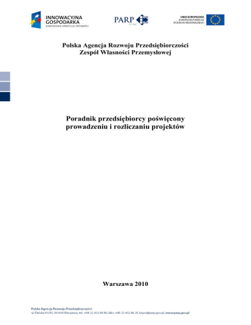 Polska Agencja Rozwoju Przedsiębiorczości Zespół Własności Przemysłowej Poradnik przedsiębiorcy poświęcony prowadzeniu i rozliczaniu projektów Warszawa 2010 1 z 15 Szanowni Państwo, Prezentujemy piąty odcinek Poradnika nt. prowadzenia i rozliczania projektów w działaniu 8.1 PO IG, który poświęcony został kwestii prawidłowego rozliczania projektów. W niniejszym odcinku zaprezentowano kwestie problematyczne związane z terminami i miejscem składania dokumentacji rozliczeniowej, wypełnianiem wniosku o płatność oraz, prawidłowym przygotowaniem dokumentacji rozliczeniowej. 2 z 15 5. Rozliczanie projektu Prawidłowe rozliczenie wniosku o płatność jest niekiedy trudniejszego od samego ubiegania się o dofinansowanie. Wymaga bowiem od Beneficjenta gruntownej znajomości postanowień umowy o dofinansowanie. Nieznajomość przez Beneficjenta praw i obowiązków wynikających z zawartej umowy niejednokrotnie komplikuje lub wręcz uniemożliwia rozliczenie projektu. PAMIĘTAJ! Zanim złożysz pierwszy wniosek o płatność zapoznaj się z zapisami zawartej umowy o dofinansowanie, szczególnie z: terminem i miejscem składania dokumentów, kwalifikowalnością kosztów, prawidłowym stosowaniem procedury dotyczącej wyboru wykonawcy, ewidencjonowaniem kosztów, osiąganiem założonych wskaźników oraz promocją projektu. 5.1 Zmiana systemu przepływów finansowych W związku z tym, że z dniem 1 stycznia 2010 r. Bank Gospodarstwa Krajowego przejął od Polskiej Agencji Rozwoju Przedsiębiorczości dokonywanie płatności na rzecz Beneficjentów ze środków Europejskiego Funduszu Rozwoju Regionalnego, po zatwierdzeniu złożonego przez Beneficjenta wniosku o płatność PARP wystawia zlecenie płatności, na podstawie którego Bank Gospodarstwa Krajowego dokonuje płatności w wysokości do 85 % kwoty dofinansowania na rachunek bankowy Beneficjenta, określony w umowie o dofinansowanie. Pozostałe 15 % kwoty dofinansowania, stanowiące środki dotacji celowej, tj. części dofinansowania pochodzącego z wkładu krajowego, przekazywane jest Beneficjentowi na dotychczasowych zasadach, czyli z rachunku PARP. Zatem Beneficjent, po zatwierdzeniu przez PARP złożonej dokumentacji rozliczeniowej otrzymuje wartość dofinansowania z dwóch różnych rachunków bankowych (do 85 % kwoty dofinansowania- z rachunku BGK, do 15 % kwoty dofinansowania- z rachunku PARP). 5.2 Terminy i miejsce składania dokumentacji rozliczeniowej Zgodnie z zapisami umowy o dofinansowanie Beneficjent składa: wniosek o płatność pośrednią w terminie 30 dni od dnia zakończenia danego etapu projektu (wniosek o płatność pośrednią składany jest po każdym zakończonym etapie); wniosek o płatność końcową nie później niż w dniu zakończenia okresu kwalifikowalności wydatków. PRZYKŁAD 1: Zgodnie z umową o dofinansowanie okres kwalifikowalności wydatków rozpoczyna się w dniu 01.01.2010 r. i kończy się w dniu 30.06.2011 r. Umowa o dofinansowanie została podpisana w dniu 15.01.2010 r. Czy wniosek o płatność końcową Beneficjent może złożyć do końca lipca 2011 r.? Beneficjent jest zobowiązany do złożenia wniosku o płatność końcową najpóźniej w dniu zakończeniu okresu kwalifikowalności wydatków, zatem nie później niż w dniu 30.06.2011 r. 3 z 15 UWAGA! W przypadku wejścia w życie umowy po zakończeniu okresu kwalifikowalności wydatków, Beneficjent jest zobowiązany do złożenia wniosku o płatność końcową w terminie 30 dni od dnia zawarcia umowy. Przykład: Okres kwalifikowalności wydatków zakończył się w dniu 30.11.2009 r., natomiast umowa o dofinansowanie została podpisana z Beneficjentem w dniu 31.12.2009 r. Wniosek o płatność końcową Beneficjent powinien złożyć najpóźniej w dniu 30.01.2010 r. Każdy wniosek Beneficjenta o płatność składany jest w Regionalnej Instytucji Finansującej, który po dokonanej weryfikacji i zatwierdzeniu w RIF zostaje następnie przekazany do PARP. 5.3 Prawidłowe przygotowanie dokumentacji rozliczeniowej W celu otrzymania dofinansowania Beneficjent składa w RIF wypełniony za pomocą Generatora wniosków o płatność, dostępnego na stronie www.parp.gov.pl, wniosek o płatność formie papierowej oraz elektronicznej (zapis plików Generatora wniosków o płatność na nośniku danych). Wersja papierowa wniosku musi być tożsama z wersją elektroniczną, o czym rozstrzyga suma kontrolna. Do wniosku o płatność Beneficjent załącza: kopie dokumentów księgowych, potwierdzających poniesione Harmonogramem rzeczowo-finansowym projektu wydatki; zgodnie z kopie wyciągów bankowych lub inne dokumenty potwierdzające dokonanie płatności za pośrednictwem rachunku bankowego Beneficjenta (np. potwierdzenie wykonania przelewu); kopie dokumentów potwierdzających przyjęcie środków trwałych do użytkowania lub wartości niematerialnych i prawnych, bądź też inne dokumenty potwierdzające zgodność realizacji projektu z warunkami umowy; oryginał pomocniczego zestawienia finansowego (wersja papierowa i elektroniczna), dostępnego na stronie www.parp.gov.pl; w przypadku wydatków związanych z wynagrodzeniami oraz obowiązkowymi pozapłacowymi kosztami pracy a) oświadczenie o wypłaconych wynagrodzeniach dla pracowników w ramach projektu lub o wypłaconych obowiązkowych pozapłacowych kosztach pracy w przypadku przedsiębiorców będących osobami fizycznymi prowadzącymi działalność gospodarczą (nie dotyczy naboru z 2008 r.) - oświadczenie Beneficjenta, b) kopie wyciągu z listy płac lub kopie rachunku za wykonanie zlecenia/dzieła (jeśli dotyczy), c) kopie deklaracji ZUS RCX lub RCA oraz deklaracji DRA (jeśli dotyczy), d) kopię umowy określającą warunki zatrudnienia (jeśli dotyczy), e) kopie dokumentów potwierdzających wypłatę wynagrodzeń/ obowiązkowych pozapłacowych kosztów pracy i zapłatę za poniesione w ramach projektu wydatki, w wysokości wynikającej z przedstawio