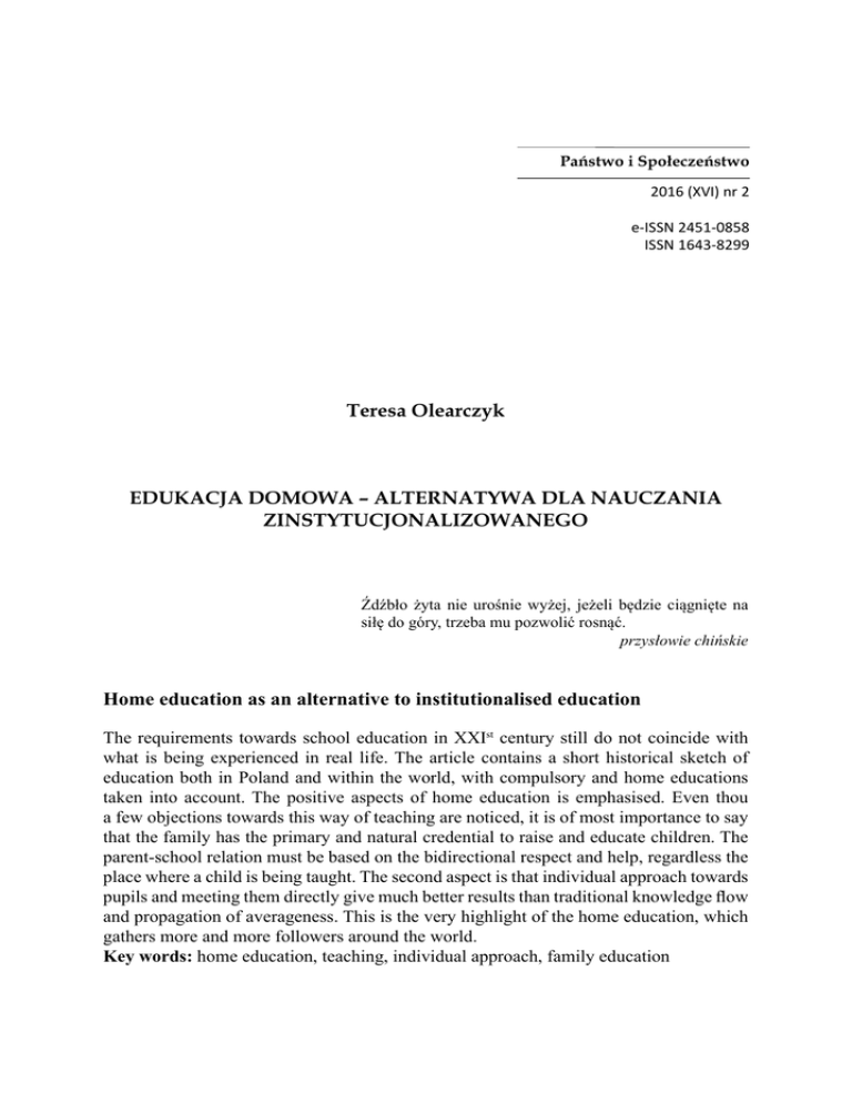 Państwo i Społeczeństwo 2016 (XVI) nr 2 e-ISSN 2451-0858 ISSN 1643-8299 Teresa Olearczyk EDUKACJA DOMOWA – ALTERNATYWA DLA NAUCZANIA ZINSTYTUCJONALIZOWANEGO Źdźbło żyta nie urośnie wyżej, jeżeli będzie ciągnięte na siłę do góry, trzeba mu pozwolić rosnąć. przysłowie chińskie Home education as an alternative to institutionalised education The requirements towards school education in XXIst century still do not coincide with what is being experienced in real life. The article contains a short historical sketch of education both in Poland and within the world, with compulsory and home educations taken into account. The positive aspects of home education is emphasised. Even thou a few objections towards this way of teaching are noticed, it is of most importance to say that the family has the primary and natural credential to raise and educate children. The parent-school relation must be based on the bidirectional respect and help, regardless the place where a child is being taught. The second aspect is that individual approach towards pupils and meeting them directly give much better results than traditional knowledge flow and propagation of averageness. This is the very highlight of the home education, which gathers more and more followers around the world. Key words: home education, teaching, individual approach, family education 28 TERESA OLEARCZYK Wprowadzenie Edukacja szkolna wciąż jest postrzegana głównie w kontekście gromadzenia tradycyjnie rozumianej wiedzy. Szkoła jawi się jako miejsce nauczania zamiast uczenia się. Tymczasem należałoby odrzucić ten schemat rozumowania i pozwolić na diametralną zmianę w systemie edukacji. Jest to tym istotniejsze dziś, kiedy stopniowo, lecz – jak się wydaje – nieodwracalnie zmienia się rola nauczyciela i wychowawcy. W świecie bez telewizji i komputerów szkoła była swego rodzaju oknem na świat, tylko dzięki niej dziecko miało możliwość dowiedzieć się o prawach nim rządzących. Dziś młodzież jest zalewana potokiem informacji niemalże od urodzenia. W momencie, kiedy uczeń przekracza progi szkoły, w wielu aspektach może dysponować nawet większą liczbą informacji niż jego nauczyciel. Wówczas rolą wychowawcy jest nie tylko przekazać wiedzę, ale pomóc ją przyswoić, uporządkować i właściwie spożytkować. Nauczyciel ma wspierać ucznia w rozwoju, wskazywać właściwe kierunki i… nie przeszkadzać mu w samodzielnym zdobywaniu informacji. Jednym słowem – w dzisiejszych czasach dzieci potrzebują czegoś więcej niż może im zaoferować szkoła w swojej tradycyjnej formie. W sferze edukacji dają o sobie znać dążenia do indywidualizacji procesu nauczania. Na tym tle ożywają, w teorii i praktyce edukacyjnej, tendencje do transformacji modelu form i metod edukacji szkolnej. Tendencjom tym towarzyszy świadomość, że potrzebny jest nowy, zhumanizowany kształt edukacji domowej. Kierując się tym przekonaniem poszukujemy odpowiedzi na pytanie w jakim zakresie problem nauczania domowego jest aktualny, potrzebny oraz jakie postulaty i rozwiązania w tej dziedzinie w przeszłości zgłaszano i praktykowano. Nie można także zapomnieć, że wiele dzieci nie było objętych edukacją, do czasu wprowadzenia obowiązku szkolnego, a nawet po oficjalnym jego wprowadzeniu. W Polsce jeszcze do II wojnie światowej znaczna część społeczeństwa była niepiśmienna. Obowiązek szkolny w krajach Europy – rys historyczny Do pierwszych prób wprowadzenia obowiązku szkolnego w czasach nowożytnych doszło jeszcze przed rewolucją oświeceniową. W 1683 r. wprowadzono na Śląsku przymus szkolny na mocy Książęcego oleśnickiego statutu niemieckich szkół miejskich i wiejskich (niem. Fuerstlich Oelsnische deutsche Stadt und Landschulordnung)1. Obowiązek uczęszczania do placówki edukacyjnej obejmował dzieci w wieku od sześciu do dziewięciu lat. Z kolei w 1739 r. w Danii, 1 J.A. Pyzik, Z przeszłości oleśnickiego szkolnictwa, „Panorama Oleśnicka” 1995, nr 34–37, http:// www.olesnica.nienaltowski.net/Z_przeszlosci_olesnickiego_szkolnictwa.htm [dostęp: 22.04.2016]. EDUKACJA DOMOWA – ALTERNATYWA DLA NAUCZANIA... 29 Chrystian VI Oldenburg wprowadził powszechny obowiązek uczęszczania do szkół podstawowych, jednak ten nakaz pozostawał martwą literą. W wieku XVIII obowiązek szkolny dla wszystkich dzieci wprowadziły także Prusy Fryderyka Wilhelma I oraz Austria w czasach panowania Marii Teresy. A inne kraje, zwłaszcza habsburskie, próbowały naśladować pruskie rozwiązania w tej dziedzinie. Przymus szkolny zapisano w projektach oświatowych rewolucji antyfrancuskiej: żyrondystów (Nicolas de Condorcet) i jakobinów (Louis de Saint-Just). Jednakże wszystkie próby wprowadzenia obowiązku szkolnego przed rewolucją 1789 r. udawały się jedynie częściowo lub wręcz rezygnowano z nich ze względu na nikłe możliwości realizacji, chociażby brak infrastruktury. Sytuacja zmieniła się na korzyść dopiero dzięki wejściu w nowe stulecie – wiek technologii i pary oraz dzięki zmianom ustrojowym. W 1825 r. w Prusach Wschodnich wszedł w życie zapis o powszechnym obowiązku szkolnym, którego wprowadzenie przypisywano słabemu wyedukowaniu żołnierzy, co z kolei przekładało się na złe wyniki w walce. W Holandii natomiast ustawę o obowiązku szkolnym w 1900 roku przeforsował w parlamencie poseł Francis David Schimmelpenninck. Inne państwa, w których zaprowadzono przymus szkolny, to m.in.: Austria (1869), Wielka Brytania (1876) i Francja (1882). Obowiązek szkolny w Polsce W Polsce pierwsze wzmianki o konieczności wprowadzenia obowiązku szkolnego znajdujemy już w dobie odrodzenia w pismach Andrzeja Frycza Modrzewskiego. Wspominał o tym m.in. w traktacie O naprawie Rzeczypospolitej (Commentariorum de Republica emendanda libri quinque), w księdze O szkole (1556). Przeciwko podobnym regulacjom występował wówczas Kościół katolicki. Trzeba 