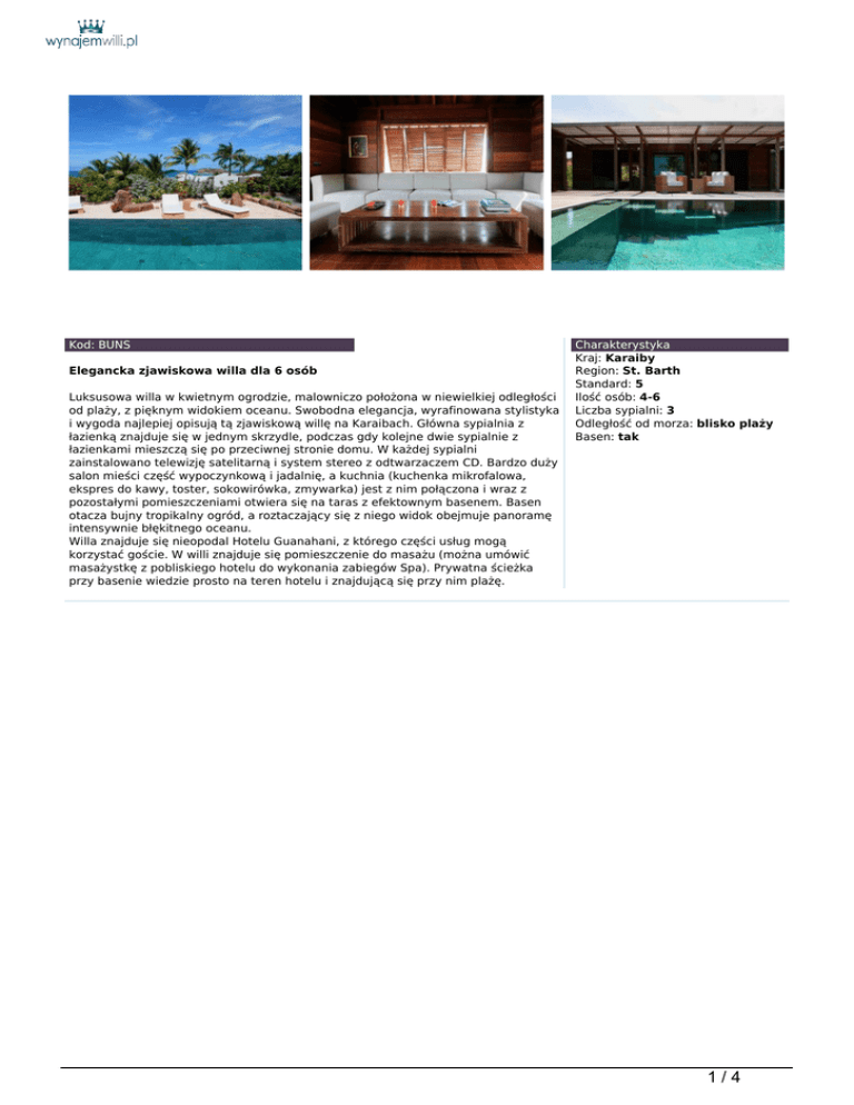 Kod: BUNS Elegancka zjawiskowa willa dla 6 osób Luksusowa willa w kwietnym ogrodzie, malowniczo położona w niewielkiej odległości od plaży, z pięknym widokiem oceanu. Swobodna elegancja, wyrafinowana stylistyka i wygoda najlepiej opisują tą zjawiskową willę na Karaibach. Główna sypialnia z łazienką znajduje się w jednym skrzydle, podczas gdy kolejne dwie sypialnie z łazienkami mieszczą się po przeciwnej stronie domu. W każdej sypialni zainstalowano telewizję satelitarną i system stereo z odtwarzaczem CD. Bardzo duży salon mieści część wypoczynkową i jadalnię, a kuchnia (kuchenka mikrofalowa, ekspres do kawy, toster, sokowirówka, zmywarka) jest z nim połączona i wraz z pozostałymi pomieszczeniami otwiera się na taras z efektownym basenem. Basen otacza bujny tropikalny ogród, a roztaczający się z niego widok obejmuje panoramę intensywnie błękitnego oceanu. Willa znajduje się nieopodal Hotelu Guanahani, z którego części usług mogą korzystać goście. W willi znajduje się pomieszczenie do masażu (można umówić masażystkę z pobliskiego hotelu do wykonania zabiegów Spa). Prywatna ścieżka przy basenie wiedzie prosto na teren hotelu i znajdującą się przy nim plażę. Charakterystyka Kraj: Karaiby Region: St. Barth Standard: 5 Ilość osób: 4-6 Liczba sypialni: 3 Odległość od morza: blisko plaży Basen: tak 1/4 Zakwaterowanie: salon z jadalnią, kuchnia, 3 sypialnie z łazienkami. Położenie: Margot, północny-wschód wyspy St Barth, orientacja północna, blisko plaży. Dodatkowe informacje: klimatyzacja, codzienna asysta pokojówki (oprócz niedziel i świąt narodowych), regularna zmiana pościeli i ręczników, powitanie, transfer z lotniska i prezentacja willi, całodobowa asysta (listopad – maj), telewizja satelitarna, bezprzewodowe połączenie internetowe. Cena za tydzień wynajmu: 2011 - niski sezon: od 10764 USD / wysoki sezon: od 14904 USD / Boże Narodzenie i Nowy Rok: od 41400 USD. Wysoki sezon: od 15 grudnia do 15 kwietnia. Niski sezon: od 16 kwietnia do 14 grudnia. 2/4 3/4 4/4 Powered by TCPDF (www.tcpdf.org)