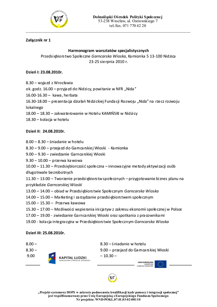 Dolnośląski Ośrodek Polityki Społe czne j 53-238 Wrocław, ul. Ostrowskiego 7 tel./fax. 071 770 42 20 __________________________________________________________________________________ Załącznik nr 1 Harmonogram warsztatów specjalistycznych Przedsi ębiors two Społeczne Garncarska Wioska, Ka mionka 5 13-100 Nidzica 23-25 sierpnia 2010 r. Dzień I: 23.08.2010r. 8.30 – wyja zd z Wrocławia ok. godz. 16.00 – przyja zd do Nidzi cy, powi tanie w NFR „Nida ” 16.00-16.30 – kawa , herbata 16.30-18.00 – prezenta cja dzia łań Ni dzi ckiej Funda cji Rozwoju „Nida” na rzecz rozwoju lokalnego 18.00 – 18.30 – zakwa terowanie w Hotel u KAMIŃSKI w Nidzi cy 18.30 – kolacja w hotelu Dzień II: 24.08.2010r. 8.00 – 8.30 – śniadanie w hotelu 8.30 – 9.00 – przeja zd do Ga rnca rskiej Wioski - Ka mionka 9.00 – 9.30 – zwiedzanie Garnca rskiej Wioski 9.30 – 10.00 – przerwa ka wowa 10.00 – 11.30 – Przedsiębiorczoś ć społeczna – innowa cyjne metody aktywi zacji osób długotrwale bezrobotnych 11.30 – 13.00 – Tworzenie przedsi ębiors tw społecznych – przygotowanie bi znes planu na przykładzie Garncarskiej Wioski 13.00 – 14.00 – obiad w Przedsi ębiors twie Społecznym Garncarska Wioska 14.00 – 15.00 – Ma rketing i za rządzanie przedsi ębiors twem społecznym 15.00 – 15.30 – Przerwa kawowa 15.30 – 17.00 – Możliwoś ci wspierania ini cja tyw z zakresu ekonomii społecznej w Polsce 17.00 – 19.00 - zwiedzanie Ga rnca rskiej Wioski oraz spotkania z pra cownika mi 19.00 - kola cja integra cyjna w Przedsiębiors twie Społecznym Garncarska Wioska Dzień III: 25.08.2010r. 8.00 – 8.30 – 9.00 8.30 – ś niadanie w hotelu 9.00 – przejazd do Ga rnca rs kiej Wioski – 10.30 – „Projekt systemowy DOPS w zakresie podnoszenia kwalifikacji kadr pomocy i integracji społecznej” jest współfinansowany przez Unię Europejską z Europejskiego Funduszu Społecznego Nr projektu: WND-POKL.07.01.03-02-001/10 Dolnośląski Ośrodek Polityki Społe czne j 53-238 Wrocław, ul. Ostrowskiego 7 tel./fax. 071 770 42 20 __________________________________________________________________________________ Pa rtners two na rzecz lokalnego rozwoju społecznego – przykłady partnerski ch projektów aktywi za cji społeczności lokalnej wokół „dobra wspólnego”. 10.30 – 11.00 – przerwa ka wowa 11.00 – 12.30 – Zaangażowanie l okalnych pa rtnerów w progra my rozwoju społecznego ora z korzyś ci wynika jące z wra żania projektów w zakresie ekonomii społecznej i funkcjonowania przedsiębiors tw społecznych 12.30 – 13.30 – obiad w Przedsi ębiors twie Społecznym Garncarska Wioska 13.30 – podsumowanie wi zyty, wyja zd uczes tników wi zyty do Wrocławia ok. godz. 21.00 – przyja zd do Wrocławia „Projekt systemowy DOPS w zakresie podnoszenia kwalifikacji kadr pomocy i integracji społecznej” jest współfinansowany przez Unię Europejską z Europejskiego Funduszu Społecznego Nr projektu: WND-POKL.07.01.03-02-001/10