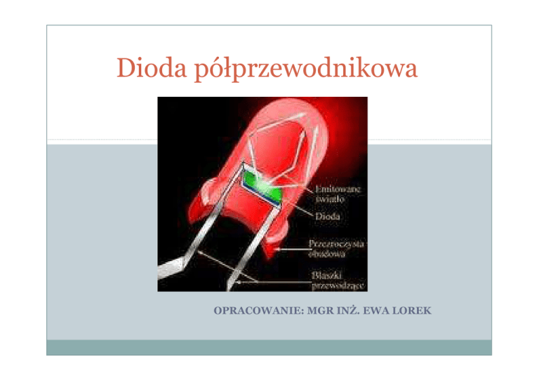 Dioda półprzewodnikowa OPRACOWANIE: MGR INŻ. EWA LOREK Budowa diody Dioda zbudowana jest z dwóch warstw półprzewodników: półprzewodnika typu n (nośnikami prądu elektrycznego są elektrony) i półprzewodnika typy p (nośnikami prądu elektrycznego są „dziury” – dodatni nośnik prądu elektrycznego). Zasada działania diody półprzewodnikowej Przepływ prądu przez diodę jest możliwy wówczas, gdy dodatni biegun baterii połączony jest z anodą (A), zaś do katody (K) podłączony jest biegun ujemny. W takiej sytuacji mamy do czynienia z polaryzacją i mówimy o prądzie przewodzenia diody. Jeżeli polaryzacja ulegnie zmianie wówczas prąd nie płynie – wtedy mamy do czynienia ze stanem pracy diody zwanym zaporowym. Jeżeli dodatni biegun źródła napięcia przyłączymy do obszaru p, a biegun ujemny do obszaru n, to z półprzewodnika n elektrony płyną w stronę „dziur” i zapełniają je. Elektrony będą się przesuwać w kierunku bieguna dodatniego. „Dziury” zaś będą kierowane w kierunku bieguna ujemnego. W tak spolaryzowanym obwodzie płynie prąd elektryczny. Jeżeli biegun dodatni źródła napięcia połączony zostanie z półprzewodnikiem typu n, to elektrony z półprzewodnika tego typu przemieszczą się w stronę dodatniego bieguna. „Dziury” w półprzewodniku typu p łączą się z elektronami z ujemnego bieguna. W ten sposób powstaje warstwa zaporowa. Przy takim spolaryzowaniu w obwodzie NIE płynie prąd elektryczny. Rodzaje diod i ich symbole Podstawowe parametry diod Dopuszczalne napięcie [V] Maksymalne natężenie prądu [A] Charakterystyka najważniejszych diod 1. Diody prostownicze przeznaczone są do prostowania prądu przemiennego dla małej częstotliwości przy dużych mocach wydzielanych w obciążeniu. Są to więc diody pracujące przeważnie w układach prostowniczych bloków zasilania różnego typu urządzeń elektrycznych i elektronicznych np. BYP 150 – 300 B – krzem Y – dioda prostownicza P – sprzęt powszechnego użytku 150 – numer serii 300 – maksymalna wartość napięcia Dane katalogowe diod półprzewodnikowych wyznaczane są tylko w laboratoriach na podstawie doświadczeń. Stąd poniższe dane: BYP 671 – 350 Umax = 350[V] Imax = 5 [A] 2. Dioda stabilizacyjna (Zenera) - są to diody przeznaczone do stabilizacji lub ograniczania napięć. Pracują one przy polaryzacji w kierunku zaporowym, charakteryzując się niewielkimi zmianami napięcia pod wpływem dużych zmian prądu. Wykorzystują one zjawisko Zenera bądź lawinowe. Diody te zbudowane są z krzemu np. BZP 630 – C7V5 B – krzem Z – dioda Zenera P – sprzęt powszechnego użytku 630 – numer serii C – tolerancja napięcia stabilizowanego (+- 5%) 7V5 (7,5 V) – wartość napięcia stabilizowanego 3. Diody świecące Są źródłem światła widzialnego oraz dzięki specjalnej budowie promieniują niewidzialne fale podczerwieni. Znane są pod nazwą diody LED (Light Emitting Diode), które pod wpływem przepływu prądu z anody p do katody n emitują promieniowania widzialne. Prąd w postaci jonów lub elektronów uzyskiwania jest ze źródła energii zewnętrznego. Charakterystyczna dla tego rodzaju oświetleń jest barwa emitowanego światła. W zależności od długości fali i rodzaju materiału półprzewodnikowego emitują one różne barwy światła np.: arsenofosforek galu (GaAsP) emituje barwy żółte i czerwone, azotek galu (Gan) kolory niebieskie. Intensywność świecenia zależy od mocy prądu przepływającego przez diodę, przy czym są to wartości o wielkości od kilku do kilkudziesięciu miliamperów. Diody świecące mają bardzo dużo zalet, do których należą: małe rozmiary, bardzo długa żywotność, niezawodne działanie, małe zużycie energii przy małych stratach mocy oraz duża wartość iluminacji. Przykład diody LED CQP 442 C – arsenek galu Q – dioda LED P – sprzęt powszechnego użytku 442 – numer serii Dioda LED w obwodzie Zastosowanie diod świecących Dziękuję za uwagę :o)