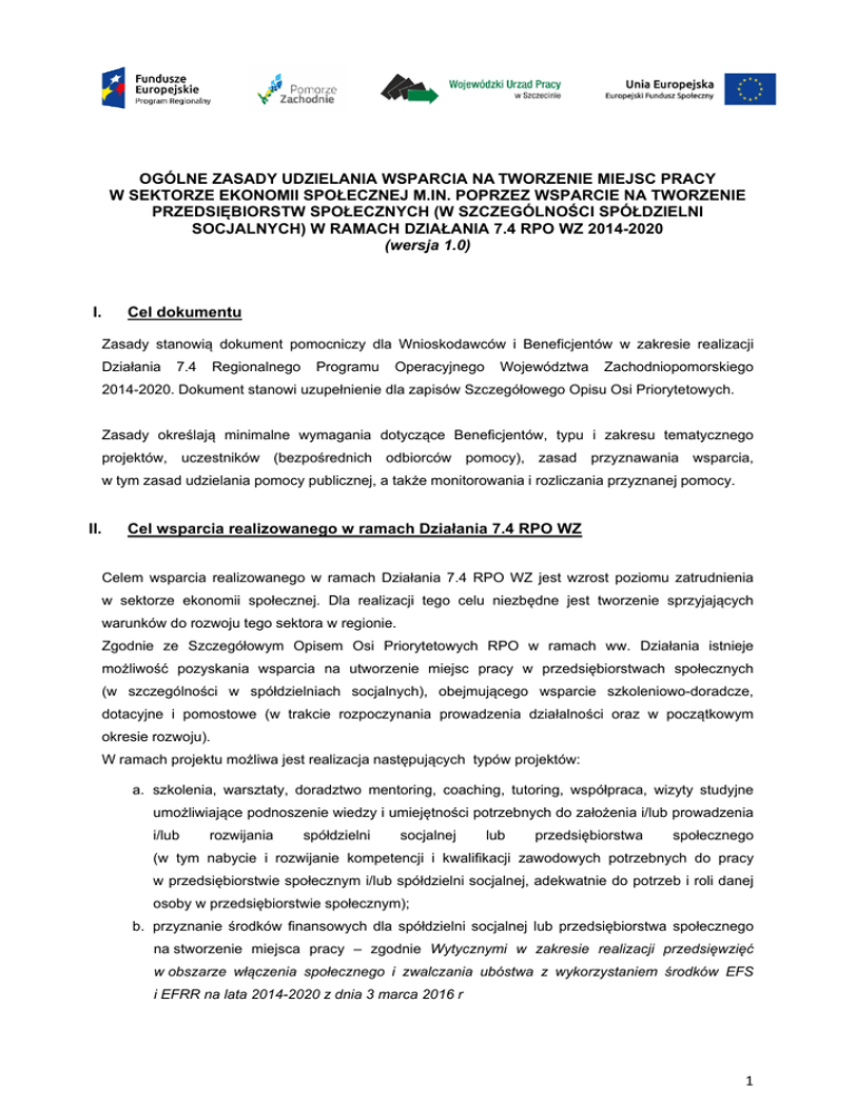 OGÓLNE ZASADY UDZIELANIA WSPARCIA NA TWORZENIE MIEJSC PRACY W SEKTORZE EKONOMII SPOŁECZNEJ M.IN. POPRZEZ WSPARCIE NA TWORZENIE PRZEDSIĘBIORSTW SPOŁECZNYCH (W SZCZEGÓLNOŚCI SPÓŁDZIELNI SOCJALNYCH) W RAMACH DZIAŁANIA 7.4 RPO WZ 2014-2020 (wersja 1.0) I. Cel dokumentu Zasady stanowią dokument pomocniczy dla Wnioskodawców i Beneficjentów w zakresie realizacji Działania 7.4 Regionalnego Programu Operacyjnego Województwa Zachodniopomorskiego 2014-2020. Dokument stanowi uzupełnienie dla zapisów Szczegółowego Opisu Osi Priorytetowych. Zasady określają minimalne wymagania dotyczące Beneficjentów, typu i zakresu tematycznego projektów, uczestników (bezpośrednich odbiorców pomocy), zasad przyznawania wsparcia, w tym zasad udzielania pomocy publicznej, a także monitorowania i rozliczania przyznanej pomocy. II. Cel wsparcia realizowanego w ramach Działania 7.4 RPO WZ Celem wsparcia realizowanego w ramach Działania 7.4 RPO WZ jest wzrost poziomu zatrudnienia w sektorze ekonomii społecznej. Dla realizacji tego celu niezbędne jest tworzenie sprzyjających warunków do rozwoju tego sektora w regionie. Zgodnie ze Szczegółowym Opisem Osi Priorytetowych RPO w ramach ww. Działania istnieje możliwość pozyskania wsparcia na utworzenie miejsc pracy w przedsiębiorstwach społecznych (w szczególności w spółdzielniach socjalnych), obejmującego wsparcie szkoleniowo-doradcze, dotacyjne i pomostowe (w trakcie rozpoczynania prowadzenia działalności oraz w początkowym okresie rozwoju). W ramach projektu możliwa jest realizacja następujących typów projektów: a. szkolenia, warsztaty, doradztwo mentoring, coaching, tutoring, współpraca, wizyty studyjne umożliwiające podnoszenie wiedzy i umiejętności potrzebnych do założenia i/lub prowadzenia i/lub rozwijania spółdzielni socjalnej lub przedsiębiorstwa społecznego (w tym nabycie i rozwijanie kompetencji i kwalifikacji zawodowych potrzebnych do pracy w przedsiębiorstwie społecznym i/lub spółdzielni socjalnej, adekwatnie do potrzeb i roli danej osoby w przedsiębiorstwie społecznym); b. przyznanie środków finansowych dla spółdzielni socjalnej lub przedsiębiorstwa społecznego na stworzenie miejsca pracy – zgodnie Wytycznymi w zakresie realizacji przedsięwzięć w obszarze włączenia społecznego i zwalczania ubóstwa z wykorzystaniem środków EFS i EFRR na lata 2014-2020 z dnia 3 marca 2016 r 1 c. wsparcie pomostowe – wsparcie pomostowe w formie finansowej jest świadczone przez okres nie krótszy niż 6 miesięcy i nie dłuższy niż 121 - miesięcy. Wsparcie pomostowe w formie finansowej jest przyznawane w wysokości niezbędnej do sfinansowania podstawowych kosztów funkcjonowania przedsiębiorstwa społecznego/spółdzielni socjalnej w początkowym okresie działania, jednak nie większej niż zwielokrotniona o liczbę utworzonych miejsc pracy, kwota minimalnego wynagrodzenia w rozumieniu przepisów o minimalnym wynagrodzeniu za pracę. Wsparcie pomostowe w formie zindywidualizowanych usług jest ukierunkowane w szczególności na wzmocnienie kompetencji biznesowych. Przyznanie dotacji jest powiązane z innymi usługami służącymi nabyciu wiedzy i umiejętności potrzebnych do założenia, prowadzenia i rozwijania przedsiębiorstwa społecznego. III. Wymagania wobec Beneficjentów 1. O dofinansowanie projektu w trybie konkursowym w ramach ww. Działania mogą się ubiegać wszystkie formy prawne zgodnie z klasyfikacją form prawnych podmiotów gospodarki narodowej określonych w § 8 Rozporządzenia Rady Ministrów z dnia 29 sierpnia 2014 r. zmieniające rozporządzenie w sprawie sposobu i metodologii prowadzenia i aktualizacji rejestru podmiotów gospodarki narodowej, w tym wzorów wniosków, ankiet i zaświadczeń, oraz szczegółowych warunków i trybu współdziałania służb statystyki publicznej z innymi organami prowadzącymi urzędowe rejestry i systemy informacyjne administracji publicznej (Dz.U.2014 poz. 1353) chyba, że kryteria wyboru projektów stanowią inaczej. 2. Do obowiązków Beneficjenta realizującego projekt w ramach Działania 7.4 należy przede wszystkim: a. opracowanie i przedłożenie we właściwej Instytucji Organizującej Konkurs (IOK) wniosku o dofinansowanie projektu, zawierającego szczegółowe informacje na temat zakresu planowanego wsparcia, w tym w szczególności informacje dotyczące: – sposobu i trybu rekrutacji uczestników projektu; – planowanego zakresu wsparcia doradczo-szkoleniowego (w tym m.in., zakresu tematycznego, liczby doradców i wykładowców planowanych do zaangażowania, liczby godzin szkoleń i doradztwa); – obiektywnych i merytorycznych kryteriów selekcji uczestników projektu, którym zostaną przyznane środki na założenie/przystąpienie do spółdzielni socjalnej lub zatrudnienie w spółdzielni socjalnej lub przedsiębiorstwie społecznym; – sposobu i trybu monitorowania prawidłowości realizacji i wydatkowania przyznanego wsparcia. b. pozyskanie i rekrutacja uczestników projektu; 1 Zaleca się, by finansowanie pomostowe było stopniowo zmniejszane, zwłaszcza w przypadku wsparcia pomostowego w formie finansowej wydłużonego do 12 miesięcy. c. realizacja wsparcia doradczo-szkoleniowego, w tym w szczególności zapewnienie odpowiednio przygotowanej kadry wykładowców i doradców, zaplecza organizacyjnego i merytorycznego dla uczestników projektu, materiałów dydaktycznych itp.; d. dokonanie podziału środków finansowych pomiędzy uczestników projektu przy zagwarantowaniu bezstronności i przejrzystości zastosowanych procedur, w tym organizacja prac Komisji Oceny Wniosków; e. przekazanie środków na rachunek przedsiębiorstwa społecznego oraz monitorowanie prawidłowości wydatkowania środków przez przedsiębiorstwo społeczne przez 12 miesięcy od dnia zawarcia umowy o przyznanie środków finansowych; f. realizacja wsparcia pomostowego, w tym doradztwa i pomocy w efektywnym wykorzystaniu środków; g. prz