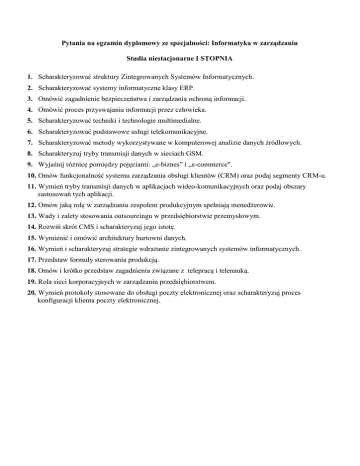 Pytania na egzamin dyplomowy ze specjalności: Informatyka w zarządzaniu Studia niestacjonarne I STOPNIA 1. Scharakteryzować struktury Zintegrowanych Systemów Informatycznych. 2. Scharakteryzować systemy informatyczne klasy ERP. 3. Omówić zagadnienie bezpieczeństwa i zarządzania ochroną informacji. 4. Omówić proces przyswajania informacji przez człowieka. 5. Scharakteryzować techniki i technologie multimedialne. 6. Scharakteryzować podstawowe usługi telekomunikacyjne. 7. Scharakteryzować metody wykorzystywane w komputerowej analizie danych źródłowych. 8. Scharakteryzuj tryby transmisji danych w sieciach GSM. 9. Wyjaśnij różnicę pomiędzy pojęciami: „e-biznes” i „e-commerce". 10. Omów funkcjonalność systemu zarządzania obsługi klientów (CRM) oraz podaj segmenty CRM-u. 11. Wymień tryby transmisji danych w aplikacjach wideo-komunikacyjnych oraz podaj obszary zastosowań tych aplikacji. 12. Omów jaką rolę w zarządzaniu zespołem produkcyjnym spełniają menedżerowie. 13. Wady i zalety stosowania outsourcingu w przedsiębiorstwie przemysłowym. 14. Rozwiń skrót CMS i scharakteryzuj jego istotę. 15. Wymienić i omówić architektury hurtowni danych. 16. Wymień i scharakteryzuj strategie wdrażanie zintegrowanych systemów informatycznych. 17. Przedstaw formuły sterowania produkcją. 18. Omów i krótko przedstaw zagadnienia związane z telepracą i telenauką. 19. Rola sieci korporacyjnych w zarządzaniu przedsiębiorstwem. 20. Wymień protokoły stosowane do obsługi poczty elektronicznej oraz scharakteryzuj proces konfiguracji klienta poczty elektronicznej.