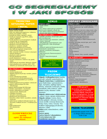 TWORZYWA SZTUCZNE, PAPIER I METAL WRZUCAMY: -gazety, zeszyty, książki -torby oraz opakowania papierowe i tekturowe -tekturę oraz pudełka z tektury -kartoniki po mleku, napojach i sokach - butelki po napojach ( typu PET), mleku, sokach i jogurtach - butelki plastikowe po kosmetykach i środkach czystości (np. po szamponach) - butelki po chemii gospodarczej - plastikowe naczynia jednorazowe - plastikowe i metalowe zakrętki - opakowania plastikowe po żywności (np. kubki po jogurtach, margarynach) - czyste karnistry plastikowe - folie, woreczki i torebki z tworzyw sztucznych - zabawki plastikowe - plastikowe meble ogrodowe - skrzynki plastikowe - puszki aluminiowe i stalowe - naczynia aluminiowe i stalowe ( np. garnki, miski) - opakowania po aerozolach, lakierach i farbach - części plastikowych ze sprzętu AGD i TRV (obudowy po monitorach, telewizorach, itp.) SZKŁO WRZUCAMY: WRZUCAMY: - butelki szklane - słoiki - inne szklane opakowania po artykułach spożywczych, napojach, sokach, itp. - inne szklane opakowania po kosmetykach - stłuczki szkła opakowaniowego Odpady, których nie da się wysegregować, w tym: - odpady higieniczne ( np. waciki, pieluchy, podpaski) - resztki jedzenia, w tym m.in. mięso, kości, ryby, suchy chleb, obierki po warzywach i owocach - zepsutą żywność i pojemniki z zawartością - papier zatłuszczony lub silnie zabrudzony - zabrudzone naczynia jednorazowe - papierosy i niedopałki papierosów - butelki i pojemniki po olejach (spożywczych, silnikowych) - ceramikę, porcelanę, naczyń typu „arco”, szkła żaroodpornego - witraże, doniczki, lustra - zabrudzony styropian, np. od kleju - folie aluminiową - gumę - zmiotki (śmieci) - popiół - tekstylia, ubrania i buty, ręczniki, szmatki, ściereczki NIE WRZUCAMY: - ceramiki, porcelany, naczyń typu „arco”, szkła żaroodpornego - szkła kryształowego, kieliszków, szklanek - witraży i doniczek - szkła płaskiego (szyb okiennych, szyb samochodowych i szkła zbrojonego) - luster - szklanych opakowań farmaceutycznych i chemicznych z zawartością - żarówek, świetlówek, kineskopów, reflektorów - lamp neonowych, fluorescencyjnych i rtęciowych - ekranów i lamp telewizyjnych - kloszy ZANIM WRZUCISZ - opróżnij - odkręć nakrętkę NIE WRZUCAMY: - styropianu - tworzyw piankowych - odpadów higienicznych (np. wacików, pieluch, podpasek) - mocno zabrudzonego plastiku - styropianowych naczyń jednorazowych - zabrudzonych pojemników po wyrobach garmażeryjnych - brudnych papierowych ręczników i chusteczek - papieru zatłuszczonego lub silnie zabrudzonego -papieru lakierowanego lub foliowego - butelek i pojemników z zawartością - butelek i pojemników po olejach (spożywczych, silnikowych) - wykładzin, dywanów - zderzaków samochodowych - plastikowych ram okiennych - tekstyliów, ubrań i butów, ręczników, szmatek, ściereczek - opakowań po środkach niebezpiecznych ( np. nawozach, środkach chwasto- i owadobójczych) - tapet - kalek technicznych - folii aluminiowej - gumy ZANIM WRZUCISZ - opróżnij -zgnieć, aby zmniejszyć objętość ODPADY ZMIESZANE PSZOK TŁUCZEWO Odpady wielkogabarytowe (meble, zderzaki i plastiki samochodowe) Odpady budowlane i rozbiórkowe (gruz budowlany i poremontowy, papa, styropian, sajding) tapety, okleiny, materiały izolacyjne, meble, chemikalia, folie rolnicze, szkło płaskie (szyby okienne i szkło zbrojone) Odpady elektryczne i elektroniczne ( tonery i tusze, sprzęty elektryczne) Odpady zielone ( trawa, liście, drobne gałązki i chwasty, kwiaty, zużyte ściółki zwierząt domowych, słomę i korę, wióry i trociny- bez środków impregnujących drewno, lakierów i farb) Szkło(szyby samochodowe, szkło płaskie) Zużyte opony Zużyte baterie i akumulatory Przeterminowane leki Świetlówki i żarówki NIE WRZUCAMY - odpadów budowlanych i rozbiórkowych - czystego styropianu opakowanego - tworzyw piankowych - wykładzin i dywanów - plastikowych mebli ogrodowych - plastikowych ram okiennych - opakowań po środkach niebezpiecznych ( np. po nawozach, środkach chwasto- i owadobójczych) - zderzaków samochodowych - szkła płaskiego, szyb samochodowych - żarówek, świetlówek, kineskopów, reflektorów - lamp neonowych, fluorescencyjnych i rtęciowych - ekranów i lamp telewizyjnych - przeterminowanych leków - zużytych baterii i akumulatorów - opon UWAGA!!! Prowadząc segregację odpadów komunalnych, ZAWSZE pozostają odpady, których nie można wysegregować. To czego nie wysegregujesz wrzucaj do pojemnika na zmieszane odpady komunalne PSZOK TŁUCZEWO poniedziałek-piątek 8.00-12.00 co druga sobota miesiąca 8.00-12.00