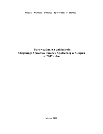 Miejski Ośrodek Pomocy Społecznej w Sierpcu Sprawozdanie z działalności Miejskiego Ośrodka Pomocy Społecznej w Sierpcu w 2007 roku Marzec 2008 Sprawozdanie z działalności Miejskiego Ośrodka Pomocy Społecznej w Sierpcu za 2007 rok 1.Informacje organizacyjne W 2007 roku w Miejskim Ośrodku Pomocy Społecznej w Sierpcu zatrudnionych było 29 osób. Zatrudnienie 18 osób finansowane było ze środków Wojewody, natomiast 11 ze środków własnych miasta. Ponadto Ośrodek zatrudnia w ramach umowy-zlecenia 3 specjalistów-konsultantów (prawnik, pedagog, psycholog), świadczących poradnictwo na rzecz mieszkańców naszego miasta oraz radcę prawnego. Wśród stałych pracowników etatowych 16 osób legitymuje się wyższym wykształceniem, z tego 14 posiada tytuł magisterski; 10 osób posiada wykształcenie średnie zawodowe; 3 osoby zawodowe. Pracownicy podnoszą swoje kwalifikacje podejmując studia, uzupełniając wykształcenie na studiach magisterskich, specjalizacjach, studiach podyplomowych oraz szkoleniach zawodowych. Zadania z zakresu pomocy społecznej realizują m.in.: pracownicy socjalni (7 os.), w tym dwóch specjalistów pracy socjalnej; opiekun i pielęgniarka (usługi opiekuńcze); opiekun (świetlica); pracownicy obsługi (kuchnia, świetlica); pracownicy administracyjni (świadczenia socjalne, rodzinne, księgowość, usługi opiekuńcze, księgowość). Zgodnie z zapisem ustawy o pomocy społecznej Ośrodek zatrudnia pracowników socjalnych proporcjonalnie do liczby ludności gminy w stosunku jeden pracownik na 2 tys. mieszkańców. W naszym mieście ten warunek nie jest spełniony,w Ośrodku powinno być zatrudnionych 10 pracowników socjalnych. W strukturach Ośrodka działają Środowiskowe Ognisko Wychowawcze oraz Dzienny Dom Pomocy. ŚOW jest świetlicą, do której uczęszczają dzieci z sierpeckich szkół podstawowych oraz gimnazjum. DDP jest placówką o charakterze dziennym, do której uczęszczają emeryci i renciści, osoby samotne, nie mogące własnym staraniem zapewnić sobie posiłków. W ramach DDP funkcjonuje także stołówka z bezpłatnymi zupami przeznaczonymi dla najniżej uposażonych mieszkańców naszego miasta. 2. Udzielona pomoc społeczna 2.1 Zadania zlecone i środki z budżetu państwa. Tabela nr 1 rok 2006 rok 2007 Rodzaje świadczeń l.gosp. domowych zasiłki stałe kwota l.gosp. kwota świadczeń domowych świadczeń 115 314.500 115 350.000 składki zdrowotne 90 zasiłki okresowe 488 23.524 452.700 85 402 27.195 422.000 specjalistyczne usługi opiekuńcze 17 105.000 17 95.787 zasiłki celowe na pokrycie wydatków związanych z klęską żywiołową i ekologiczną 44 47.380 - - 2 Sprawozdanie z działalności Miejskiego Ośrodka Pomocy Społecznej w Sierpcu za 2007 rok dożywianie 1.922 226.000 1.634 1 3.000 - zdarzenie losowe 261.000 - Źródło: sprawozdania MOPS Wśród osób otrzymujących zasiłki stałe nie odnotowano wzrostu, natomiast wzrosła kwota świadczeń i wydatków przeznaczonych na jego wypłatę. W przypadku zasiłków okresowych zarówno liczba świadczeniobiorców jak i wydatków zmniejszyła się. Składka zdrowotna opłacana jest za niektóre osoby pobierające zasiłek stały tj. te, które nie są ubezpieczone z innych tytułów i tutaj zauważyć można zmniejszenie liczby świadczeniobiorców, za to wzrost kwoty wydatkowanej na ten cel, z powodu podwyższenia wysokości składki zdrowotnej. Ze środków zleconych finansowano także realizację specjalistycznych usług opiekuńczych dla osób z zaburzeniami psychicznymi. Taką pomocą objęto 17 osób w tym 16 z chorobą psychiczną oraz 1 os. niepełnosprawną intelektualnie. 11 os. samotnie prowadziło samodzielne gospodarstwo domowe, natomiast 6 zamieszkiwało we wspólnym gospodarstwie z rodziną. W ramach wymienionej w tabeli kwoty zrealizowano 8.602 godzin usług, z tego 3.402 godz. wykonali pracownicy zatrudnieni w MOPS, natomiast 5.200 godz. opiekunki środowiskowe PCK. Specjalistyczne usługi opiekuńcze realizowane były poprzez różne formy: uczenie i rozwijanie umiejętności niezbędnych do samodzielnego życia, usługi pielęgnacyjne – jako wspieranie procesu leczenia, rehabilitacja fizyczna oraz współpraca ze specjalistami w zakresie wsparcia psychologiczno-pedagogicznego i edukacyjnoterapeutycznego. Realizacją usług zajmowało się 5 osób tj. pielęgniarka, opiekun oraz 3 opiekunki środowiskowe. W 2007 roku otrzymaliśmy także środki na rządowy program „Pomoc państwa w zakresie dożywiania”. Łączny koszt Programu wyniósł 469.608 zł, w tym środki własne gminy (nie wykazane w powyższej tabeli) 208.608 zł oraz środki budżetu państwa 261.000 zł. Rzeczywista liczba osób objętych Programem wyniosła 1634, z tego w formie posiłku 580 osób, a 1054 osób w formie zasiłku celowego na zakupienie żywności. Z pomocy w formie posiłku skorzystało 425 uczniów, 75 dzieci do 7 r. ż oraz 80 innych osób otrzymujących pomoc społeczną. Nie objęto pomocą ok. 17 osób, z powodu ich niechęci do tej formy pomocy. W ub.r. finansowano posiłki w 11 placówkach: 6 szkołach, 4 przedszkolach oraz 1 stołówce funkcjonującej przy MOPS. W ramach przyznanych środków opłacono 98.834 posiłków za ogólna kwotę 258.402 zł. Z całodziennego wyżywienia skorzystało 60 dzieci, z pełnego obiadu 410 dzieci, z posiłku w formie bułki/kanapki, mleka 30 dzieci oraz z jednego gorącego posiłku 80 osób. 2.2 Zadania własne gminy Tabela nr 2 Rodzaje świadczeń zasiłki okresowe posiłek zdarzenie losowe sprawienie pogrzebu rok 2006 l.osób 488 564 1 - 3 kwota l.osób świadczeń 61.700 246.554 4.000 - rok 2007 kwota świadczeń 402 13.348 1.634 258.402 4 8.100 1 2.113 Sprawozdanie z działalności Miejskiego Ośrodka Pomocy Społecznej w Sierpcu za 2007 rok schronienie ubranie inne zasiłki celowe i w naturze w tym specjalne pobyt w dps poradnictwo specjalistyczne praca socjalna usługi opiekuńcze 4 2 976 89 7 60 310 70 3.100 