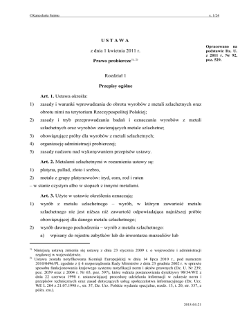 ©Kancelaria Sejmu s. 1/24 USTAWA Opracowano na podstawie Dz. U. z 2011 r. Nr 92, poz. 529. z dnia 1 kwietnia 2011 r. Prawo probiercze 1), 2) Rozdział 1 Przepisy ogólne Art. 1. Ustawa określa: 1) zasady i warunki wprowadzania do obrotu wyrobów z metali szlachetnych oraz obrotu nimi na terytorium Rzeczypospolitej Polskiej; 2) zasady i tryb przeprowadzania badań i oznaczania wyrobów z metali szlachetnych oraz wyrobów zawierających metale szlachetne; 3) obowiązujące próby dla wyrobów z metali szlachetnych; 4) organizację administracji probierczej; 5) zasady nadzoru nad wykonywaniem przepisów ustawy. Art. 2. Metalami szlachetnymi w rozumieniu ustawy są: 1) platyna, pallad, złoto i srebro, 2) metale z grupy platynowców: iryd, osm, rod i ruten – w stanie czystym albo w stopach z innymi metalami. Art. 3. Użyte w ustawie określenia oznaczają: 1) wyrób z metalu szlachetnego – wyrób, w którym zawartość metalu szlachetnego nie jest niższa niż zawartość odpowiadająca najniższej próbie obowiązującej dla danego metalu szlachetnego; 2) wyrób dawnego pochodzenia – wyrób z metalu szlachetnego: a) 1) 2) wpisany do rejestru zabytków lub do inwentarza muzealiów lub Niniejszą ustawą zmienia się ustawę z dnia 23 stycznia 2009 r. o wojewodzie i administracji rządowej w województwie. Ustawa została notyfikowana Komisji Europejskiej w dniu 14 lipca 2010 r., pod numerem 2010/0496/PL zgodnie z § 4 rozporządzenia Rady Ministrów z dnia 23 grudnia 2002 r. w sprawie sposobu funkcjonowania krajowego systemu notyfikacji norm i aktów prawnych (Dz. U. Nr 239, poz. 2039 oraz z 2004 r. Nr 65, poz. 597), które wdraża postanowienia dyrektywy 98/34/WE z dnia 22 czerwca 1998 r. ustanawiającej procedurę udzielania informacji w zakresie norm i przepisów technicznych oraz zasad dotyczących usług społeczeństwa informacyjnego (Dz. Urz. WE L 204 z 21.07.1998 r., str. 37, Dz. Urz. Polskie wydanie specjalne, rozdz. 13, t. 20, str. 337, z późn. zm.). 2015-04-21 ©Kancelaria Sejmu b) oznaczony s. 2/24 dającymi się zidentyfikować cechami probierczymi stosowanymi przed rokiem 1962, lub c) wytworzony przed rokiem 1962, oznaczony cechami niedającymi się zidentyfikować lub nieposiadający żadnych oznaczeń, którego wartość historyczna lub artystyczna jest tak znaczna, że wartość metalu szlachetnego użytego do wytworzenia tego wyrobu przy ustalaniu jego wartości rynkowej stanowi czynnik drugorzędny; 3) cecha probiercza – prawnie chroniony znak urzędowy potwierdzający zawartość metalu szlachetnego w wyrobie; 4) wprowadzenie do obrotu – udostępnienie, nieodpłatnie albo za opłatą, po raz pierwszy wyrobu z metalu szlachetnego w celu jego używania lub sprzedaży; 5) obrót – każdorazowe udostępnienie wprowadzonego do obrotu wyrobu z metalu szlachetnego w celu jego używania lub sprzedaży; 6) świadectwo badania – dokument potwierdzający zawartość metalu szlachetnego w wyrobie; 7) próba – stosunek masy czystego metalu szlachetnego zawartego w stopie do masy stopu wyrażony w częściach tysięcznych; 8) znak imienny – indywidualny znak pozwalający na identyfikację wytwórcy wyrobu z metalu szlachetnego lub podmiotu wprowadzającego do obrotu wyrób z metalu szlachetnego wytworzony poza terytorium Rzeczypospolitej Polskiej. Rozdział 2 Zasady i warunki wprowadzania do obrotu wyrobów z metali szlachetnych oraz obrotu nimi na terytorium Rzeczypospolitej Polskiej Art. 4. Wyroby z metali szlachetnych mogą być, z zastrzeżeniem art. 6, wprowadzane do obrotu i być przedmiotem obrotu na terytorium Rzeczypospolitej Polskiej, jeżeli spełniają co najmniej 1 z następujących warunków: 1) są oznaczone: a) polskimi cechami probierczymi, b) cechami probierczymi, których obowiązek uznawania wynika z wiążących Rzeczpospolitą Polską umów międzynarodowych, 2015-04-21 ©Kancelaria Sejmu c) s. 3/24 cechami probierczymi, na podstawie których dopuszczono wyroby z metali szlachetnych do obrotu w państwach członkowskich Unii Europejskiej, w państwach członkowskich Europejskiego Porozumienia o Wolnym Handlu (EFTA) – stronach umowy o Europejskim Obszarze Gospodarczym lub w Republice Turcji; 2) posiadają świadectwo badania. Art. 5. 1. Podmiot wprowadzający do obrotu wyroby z metali szlachetnych jest obowiązany do zapewnienia spełnienia przez te wyroby co najmniej 1 z warunków, o których mowa w art. 4. 2. Podmiot dokonujący obrotu wyrobami z metali szlachetnych może dokonywać obrotu tymi wyrobami wyłącznie po spełnieniu co najmniej 1 z warunków określonych w art. 4. Art. 6. 1. Przepisu art. 4 nie stosuje się do następujących wyrobów z metali szlachetnych: 1) w których masa części wykonanych ze stopu metali szlachetnych jest mniejsza niż: a) 1 gram – dla stopów platyny, b) 1 gram – dla stopów złota, c) 5 gramów – dla stopów srebra; 2) wyrobów dawnego pochodzenia; 3) narzędzi i aparatów lub ich części, służących do celów naukowych i przemysłowych; 4) wyrobów medycznych, wyrobów medycznych do diagnostyki in vitro, wyposażenia wyrobów medycznych, wyposażenia wyrobów medycznych do diagnostyki in vitro oraz aktywnych wyrobów medycznych do implantacji, w rozumieniu przepisów ustawy z dnia 20 maja 2010 r. o wyrobach medycznych (Dz. U. Nr 107, poz. 679), lub ich części; 5) odznaczeń i orderów w rozumieniu przepisów ustawy z dnia 16 października 1992 r. o orderach i odznaczeniach (Dz. U. Nr 90, poz. 450, z późn. zm. 3)) oraz 3) Zmiany wymienionej ustawy zostały ogłoszone w Dz. U. z 1999 r. Nr 101, poz. 1177, z 2000 r. Nr 62, poz. 718, z 2002 r. Nr 73, poz. 676, z 2006 r. Nr 104, poz. 708 i 711 i Nr 194, poz. 1432, z 2007 r. Nr 25, poz. 162 i Nr 123, poz. 848, z 2009 r. Nr 168, poz. 1323 oraz z 2010 r. Nr 155, poz. 1041. 2015-04-21 ©Kancelaria Sejmu s. 4/24 odznak honorowych ustanowionych na podstawie przepisów ustawy z dnia 21 grudnia 1978 r. o odznakach i mundurach (Dz. U. Nr 31, poz. 130