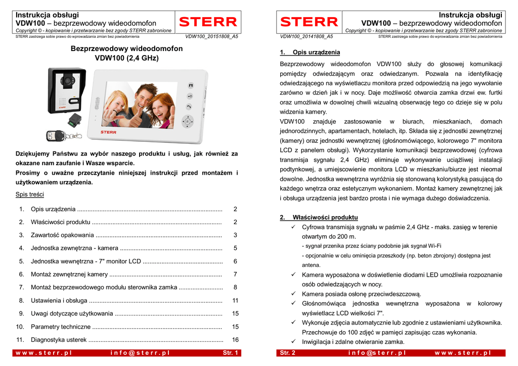Instrukcja obs ugi VDW100 – bezprzewodowy wideodomofon Copyright © - kopiowanie i przetwarzanie bez zgody STERR zabronione STERR STERR zastrzega sobie prawo do wprowadzania zmian bez powiadomienia VDW100_20151808_A5 Bezprzewodowy wideodomofon VDW100 (2,4 GHz) STERR Instrukcja obs ugi VDW100 – bezprzewodowy wideodomofon Copyright © - kopiowanie i przetwarzanie bez zgody STERR zabronione VDW100_20141808_A5 1. STERR zastrzega sobie prawo do wprowadzania zmian bez powiadomienia Opis urz dzenia Bezprzewodowy wideodomofon VDW100 s pomi dzy odwiedzaj cym oraz y do g osowej komunikacji odwiedzanym. Pozwala na identyfikacj odwiedzaj cego na wy wietlaczu monitora przed odpowiedzi na jego wywo anie zarówno w dzie jak i w nocy. Daje mo liwo otwarcia zamka drzwi ew. furtki oraz umo liwia w dowolnej chwili wizualn obserwacj tego co dzieje si w polu widzenia kamery. VDW100 znajduje zastosowanie w biurach, mieszkaniach, domach jednorodzinnych, apartamentach, hotelach, itp. Sk ada si z jednostki zewn trznej (kamery) oraz jednostki wewn trznej (g Dzi kujemy Pa stwu za wybór naszego produktu i us ug, jak równie za okazane nam zaufanie i Wasze wsparcie. Prosimy o uwa ne przeczytanie niniejszej instrukcji przed monta em i ytkowaniem urz dzenia. nomówi cego, kolorowego 7" monitora LCD z panelem obs ugi). Wykorzystanie komunikacji bezprzewodowej (cyfrowa transmisja sygna u 2,4 GHz) eliminuje wykonywanie uci liwej instalacji podtynkowej, a umiejscowienie monitora LCD w mieszkaniu/biurze jest nieomal dowolne. Jednostka wewn trzna wyró nia si stonowan kolorystyk pasuj do ka dego wn trza oraz estetycznym wykonaniem. Monta kamery zewn trznej jak Spis tre ci i obs uga urz dzenia jest bardzo prosta i nie wymaga du ego do wiadczenia. 1. Opis urz dzenia ..................................................................................... 2 2. W 2 3. Zawarto opakowania .......................................................................... 3 otwartym do 200 m. 4. Jednostka zewn trzna - kamera ............................................................ 5 - sygna przenika przez ciany podobnie jak sygna Wi-Fi 5. Jednostka wewn trzna - 7" monitor LCD ............................................... 6 6. Monta zewn trznej kamery .................................................................. 7 Kamera wyposa ona w do wietlenie diodami LED umo liwia rozpoznanie 7. Monta bezprzewodowego modu u sterownika zamka .......................... 8 osób odwiedzaj cych w nocy. 8. Ustawienia i obs uga .............................................................................. 11 9. Uwagi dotycz ce u ytkowania ............................................................... 15 10. Parametry techniczne ............................................................................ 15 11. Diagnostyka usterek ............................................................................... 16 ciwo ci produktu ............................................................................ www.sterr.pl [email protected] Str. 1 2. W ciwo ci produktu Cyfrowa transmisja sygna u w pa mie 2,4 GHz - maks. zasi g w terenie - opcjonalnie w celu omini cia przeszkody (np. beton zbrojony) dost pna jest antena. Kamera posiada os on przeciwdeszczow . G nomówi ca jednostka wewn trzna wyposa ona w kolorowy wy wietlacz LCD wielko ci 7". Wykonuje zdj cia automatycznie lub zgodnie z ustawieniami u ytkownika. Przechowuje do 100 zdj w pami ci zapisuj c czas wykonania. Inwigilacja i zdalne otwieranie zamka. Str. 2 i n f o @s t e r r . p l www.sterr.pl Instrukcja obs ugi VDW100 – bezprzewodowy wideodomofon Copyright © - kopiowanie i przetwarzanie bez zgody STERR zabronione STERR VDW100_20151808_A5 STERR zastrzega sobie prawo do wprowadzania zmian bez powiadomienia Do wyboru 16 melodii z mo liwo ci ustawienia g Regulowana jasno wy wietlacza i g no no ci. STERR Instrukcja obs ugi VDW100 – bezprzewodowy wideodomofon Copyright © - kopiowanie i przetwarzanie bez zgody STERR zabronione VDW100_20141808_A5 STERR zastrzega sobie prawo do wprowadzania zmian bez powiadomienia Jednostka wewn trzna (monitor z panelem) rozmowy. Wy wietlanie aktualnego czasu na ekranie. Praca zarówno na zasilaczach jak i akumulatorach b 9. Monitor 7” z panelem obs ugi cych w zestawie. Zastosowane akumulatory typu BL-5J w kamerze i monitorze s wymienne i przystosowane do adowania. Czas pracy kamery na zasilaniu akumulatorowym to ok. 30 dni. Bezprzewodowy system otwierania zamka rozpoznaje brak zasilania. Dwie wersje: wersja 1v4 – 1 kamera do 4 monitorów; wersja 2v1 – 2 kamery i jeden monitor. 10. adowarka do monitora z wej ciem 11. Akumulator typu BL-5J USB; Wej cie: 100-240V 50/60Hz; 3. Zawarto opakowania Wyj cie: 5V/1A Jednostka zewn trzna 1. Kamera 2. Zasilacz: 100-240V 50/60Hz; Zasilanie na wyj ciu: 5V/1A 12. Wspornik do na ciennego monta u 13. Instrukcja obs ugi monitora 3. Kabel przej ciowy 4. Akumulator typu BL-5J (opcjonalnie) 5. Bezprzewodowy sterownik 6. Pilot do zdalnego otwierania otwierania zamka (opcjonalnie) - bateria 27A/12V 7. Wkr ty i ko ki rozporowe 8. Ta ma dwustronnie klej ca www.sterr.pl [email protected] Str. 3 Str. 4 i n f o @s t e r r . p l www.sterr.pl Instrukcja obs ugi VDW100 – bezprzewodowy wideodomofon Copyright © - kopiowanie i przetwarzanie bez zgody STERR zabronione VDW100_20151808_A5 STERR zastrzega sobie prawo do wprowadzania zmian bez powiadomienia 4. STERR Jednostka zewn trzna - kamera Mikrofon 11 Kontrolka adowania akumulatora Gniazdo pod czenia zewn trznej 2 Ekran TFT 12 Kontrolka pracy urz dzenia anteny wzmacniaj cej sygna - 3 Nie dotyczy tego modelu 13 Przycisk wykonania zdj cia opcja. 4 Mikrofon 14 Przesuwanie w gór 5 Przycisk sterowania monitorem 15 Wej cie USB adowarki 6 Przycisk otwarcia drzwi/furtki 16 Prze cznik W cz/Wy cz 7 Przycisk wywo ania 17 Otwory dla wspornika ciennego 8 Przesuwanie w lewo 18 Otwierana os ona akumulatora 9 Przesuwanie w dó 19 Stopka 10 Przesuwanie w prawo Przycisk wywo ania 2 Soczewka kamery 8 G 3 