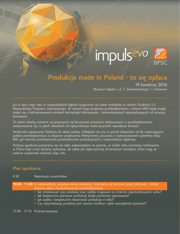 Produkcja made in Poland - to siê op³aca 19 kwietnia 2016 Muzeum Œl¹skie | ul. T. Dobrowolskiego 1 | Katowice Ju¿ w lipcu tego roku w województwie œl¹skim rozpocznie siê nabór wniosków w ramach Dzia³ania 3.3. Regionalnego Programu Operacyjnego. W ramach tego programu przedsiêbiorstwa z sektora MSP bêd¹ mog³y staraæ siê o dofinansowanie wdro¿eñ technologii informacyjno - komunikacyjnych optymalizuj¹cych ich procesy biznesowe. To zatem idealny moment na przyjrzenie siê kluczowym procesom realizowanym w przedsiêbiorstwie, zastanowienie siê, w jakich obszarach ich optymalizacja mo¿e przynieœæ najwiêksze korzyœci. Serdecznie zapraszamy Pañstwa do takiej analizy. Odbêdzie siê ona w gronie ekspertów od lat wspieraj¹cych polskie przedsiêbiorstwa w obszarze zwiêkszania efektywnoœci procesów z wykorzystaniem systemów klasy ERP, jak równie¿ przedstawicieli przedsiêbiorstw produkcyjnych z województwa œl¹skiego. Podczas spotkania postaramy siê nie tylko odpowiedzieæ na pytanie, co zrobiæ ¿eby produkcja realizowana w Polsce by³a coraz bardziej op³acalna, ale tak¿e jak najkorzystniej sfinansowaæ narzêdzia, które maj¹ za zadanie wspieranie realizacji tego celu. Plan spotkania: 9:30 Rejestracja uczestników 10.00 - 11.00 O optymalizacji, uelastycznieniu produkcji, rozliczaniu jej kosztów, presji p³acowej - krótka historia walki o konkurencyjnoœæ przedsiêbiorstwa. ? Jak zredukowaæ czas produkcji oraz szybko reagowaæ na zmienne zapotrzebowanie rynku? ? Jak bezpiecznie planowaæ produkcjê dziêki poziomom planowania? ? Jak szybko i bezpiecznie rejestrowaæ produkcjê w toku? ? Czy optymalizacja produkcji jest zawsze mo¿liwa i jakie oszczêdnoœci przynosi? 11.00 - 11.15 Przerwa kawowa 11.15 - 12.00 System klasy ERP - uniwersalnoœæ vs. specjalizacja - specyfika produkcji a narzêdzia informatyczne s³u¿¹ce zwiêkszaniu jej op³acalnoœci. Produkcja dyskretna a produkcja procesowa - na co zwróciæ uwagê przy wyborze rozwi¹zañ? ? Jak zmniejszyæ stany magazynowe ? ? Jak obni¿yæ cenê zakupu ? ? Jak zwiêkszyæ rentownoœæ produktu ? ? Jak rozliczyæ koszty produkcji produktu gotowego - czy mo¿emy mieæ wynik bez odchyleñ? ? 12.00 - 12.45 Œrodki na inwestycje w optymalizacjê produkcji - sk¹d je pozyskaæ? Dzia³anie 3.3.RPO - za³o¿enia i bud¿et programu, ? Jak zmaksymalizowaæ szanse na pozyskanie œrodków? ? Wynajem, leasing, po¿yczka jako alternatywne Ÿród³a finansowania inwestycji - kiedy i dla ? kogo? 13:00 Lunch 13:30 Zwiedzanie Muzeum Œl¹skiego Po lunchu wszystkich chêtnych zapraszamy do oderwania siê na krótk¹ chwilê od biznesowej tematyki i spaceru po nowej siedzibie Muzeum Œl¹skiego. Zachêcamy zarówno do zanurzenia siê w historii Górnego Œl¹ska na wystawie prezentowanej na miejscu kopalni "Katowice", jak równie¿ odwiedzenia galerii sztuki polskiej (zbiory z lat 1800 - 1945 oraz powsta³e po 1945 roku). Organizator spotkania: BPSC SA to lider na rynku oprogramowania wspomagaj¹cego zarz¹dzanie przedsiêbiorstwem. Specjalizujemy siê w tworzeniu i wdra¿aniu zintegrowanych rozwi¹zañ klasy MRPII/ERP (Impuls EVO) oraz systemów do zarz¹dzania personelem (mHR EVO). Skutecznie wspieramy przedsiêbiorstwa w prowadzeniu biznesu i efektywnym wykorzystaniu ich zasobów, tworz¹c u¿yteczne i funkcjonalne rozwi¹zania IT. Z naszych rozwi¹zañ korzysta ponad 650 œrednich i du¿ych przedsiêbiorstw reprezentuj¹cych ró¿ne sektory gospodarki. Zdecydowana wiêkszoœæ z nich to przedsiêbiorstwa produkcyjne. Spotkanie jest bezp³atne dla uczestników. Je¿eli s¹ Pañstwo zainteresowani udzia³em w spotkaniu prosimy o zg³oszenie za poœrednictwem formularza dostêpnego na stronie www.produkcjamadeinpoland.pl lub wys³anie e-maila z podaniem imienia i nazwiska uczestnika oraz danych kontaktowych (mail, telefon) na adres [email protected]. Termin zgùoszeñ upùywa 12 kwietnia 2016. Liczba miejsc jest ograniczona. Dodatkowych informacji udziela: Mag³orzata Machorowska +48 32 349 35 23, +48 664 421 135, [email protected] PATRONI MEDIALNI: TRADE M A G A Z INE
