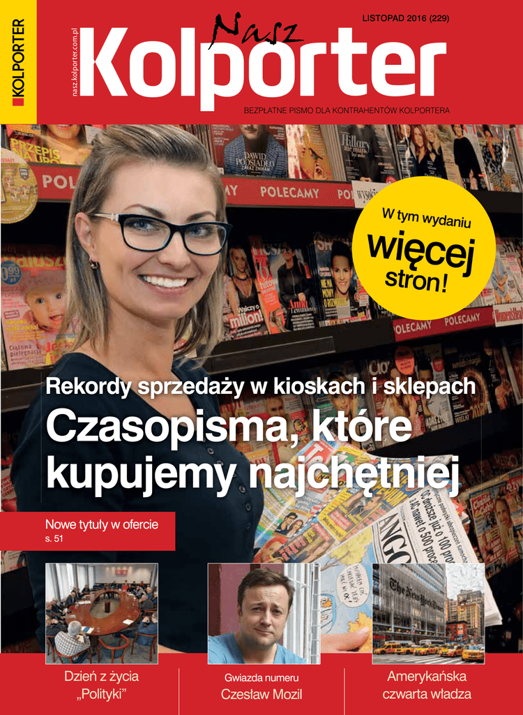 Kolporter nasz.kolporter.com.pl LISTOPAD 2016 (229) BEZPŁATNE PISMO DLA KONTRAHENTÓW KOLPORTERA W tym wy daniu więcej st ron! Rekordy sprzedaży w kioskach i sklepach Czasopisma, które kupujemy najchętniej Nowe tytuły w ofercie s. 51 Dzień z życia „Polityki” Gwiazda numeru Czesław Mozil Amerykańska czwarta władza Departament Dystrybucji Prasy Najlepsze miejsca i ekspozytory do promocji tytułów prasowych w punktach sprzedaży. Kontakt Tel. (41) 367-86-26 Tel. kom. 510-031-720 www.kolporter.com.pl SPIS TrEŚcI Kolporter nasz.kolporter.com.pl LISTOPAD 2016 (229) Bezpłatne pismo dla kontrahentów kolportera W tym wyd aniu więcej str on! s. 4 TemaT numeRu Rekordy sprzeda¿y prasy s. 6-9 S¹ kioski, które miesiêcznie sprzedaj¹ kilkaset, a nawet 1000 egz. jednego tytu³u s. 10-11 Prasa papierowa wygrywa z cyfrową s. 50 Rekordy sprzedaży w kioskach i sklepach Sprzeda¿ wydañ papierowych i elektronicznych – wyniki ZKDP z sierpnia 2016 r. Nowe tytuły w ofercie PrASA NA ŚWIEcIE Amerykańska czwarta władza Czasopisma, które kupujemy najchętniej W Stanach Zjednoczonych najstarsze gazety ukazuj¹ siê nieprzerwanie od XIX wieku s. 51 Dzień z życia „Polityki” Gwiazda numeru Czesław Mozil Amerykańska czwarta władza wydawCa Kolporter spó³ka z ograniczon¹ odpowiedzialności¹ sp. k. RedakToR naCZelny Grzegorz Kozera koleGIum RedakCyJne Dariusz Materek Kinga Beck-Tracz Rada pRoGRamowa Dariusz Fryziel Mariusz Iska³o Justyna Koz³owska Bogus³aw Morañski Micha³ Zbytek koRekTa Kinga Beck-Tracz Reklama tel. 41 367 82 24 tel. kom. 510 030 119 opRaCowanIe kompuTeRowe Kolporter Dzia³ Marketingu Kielce, ul. Zagnañska 61 tel. 41 367 80 34 skład Katarzyna Ryczek Rafa³ Sabat dRuk Drukarnia ART 01-339 Warszawa ul. Fortuny 5 adRes RedakCJI „Nasz Kolporter” 25-528 Kielce ul. Zagnañska 61 tel. 41 367 80 31 www.nasz.kolporter.com.pl nakład 20 400 egzemplarzy Redakcja nie ponosi odpowiedzialności za treśæ reklam i og³oszeñ i nie zwraca nie zamówionych materia³ów. Zdjêcia na ok³adce: Katarzyna Ryczek Polityka AKPA Istockphoto.com www.nasz.kolporter.com.pl punkty handlowe, które w swojej ofercie s. 12 s. 18-19 Popularny wokalista i muzyk zagra³ samego siebie w komedii filmowej Handel Firma to ludzie O dobrych praktykach w handlu opowiada kontrahent Kolportera, Dominik Sat³awa Wzrosły obroty Trendy sprzeda¿y w sklepach ma³oformatowych do 300 m kw. ludZIe Intuicja im pomaga Najlepsi sprzedawcy prasy z województwa pomorskiego s. 53 s. 24-25 wskazówki naszych ekspertów ułatwią Oczywiście, zachęcamy do lektury pozostałych tekstów w listopadowym wydaprasy” – to również nowa rubryka w naszym miesięczniku. Grzegorz Kozera Redaktor naczelny „Naszego Kolportera” ludZIe kolpoRTeRa po GodZInaCH zdobywca korony s. 32-33 s. 6-9 s. 35 pRawo Na dyskach czy na papierze s. 36 psyCHoloG RadZI Siła pewności s. 38-39 RoZRywka Dobre do czytania i słuchania dobre do jedzenia Horoskop „czwartego Wymiaru” Humor z okolic lady Pomysł na urlop Krzyżówka Technopolu Kolporter w prasie i Internecie Nowości w ofercie Kolportera s. s. s. s. s. s. s. s. To cecha, któr¹ mo¿na w sobie wypracowaæ o ekspozycję w swoim punkcie i co zro- niu, w tym do przeczytania „Z historii s. 31 Rozliczanie kosztów a przechowywanie dokumentów ksiêgowych Polecamy także nowy cykl tematyczny Państwu codzienną pracę. ŚWIAT JAK NA D£ONI Jednakowe liczby na zegarze Październikowy konkurs przed³u¿amy do 22 listopada br. tematem listopadowego numeru „NK”. wydania kolekcjonerskie. Wierzymy, że s. 23 s. 28 konkuRs zagadka jeszcze raz znajdą Państwo w artykule, który jest bić, żeby jeszcze skuteczniej sprzedawać wydaRZenIa zwroty akcji na zielonym polu Jaros³aw Botkiewicz w ci¹gu 13 miesiêcy przebieg³ piêæ maratonów egzemplarzy konkretnego tytułu praso- rze znajdą Państwo porady, jak dbać s. 20-21 s. 26 Pracownicy ³ódzkiego oddzia³u Kolportera grali w golfa w ciągu miesiąca potrafią sprzedać tysiąc „Poradnik sprzedawcy” – w tym nume- Z HIsToRII pRasy Nie ma prenumeraty? To wychodzę stąd Jak „Kurier Warszawski” zdobywa³ czytelników w XIX wieku skazane na porażkę. Przeciwnie, niektóre ścicielom i sprzedawcom? Odpowiedź zadbaj o wystawę GwIaZda numeRu Ch³opiêcy urok Czes³awa mozila mogą się równać, co nie znaczy, że są wego. Jak to się udaje zrobić ich wła- s. 16 Dobra ekspozycja, dopasowana do profilu klienta to gwarancja wy¿szej sprzeda¿y mają także prasę. Z dużymi sieciami nie osiągają znakomite wyniki sprzedażowe, poRadnIk spRZedawCy Siedem pomocnych pytań Jak dobrze sprzedawaæ produkty kolekcjonerskie Duża sprzedaż w małym punkcie Pojedyncze kioski, saloniki, sklepy – czyli Rynek pRasowy Światła nie gasną do późna Dzieñ z ¿ycia redakcji tygodnika „Polityka” Od redaktora 40 41 43 44 45 46-47 48-49 51 fot. iStocKpHoto.coM lIsTopad 2016 (229) AKTUALNOŚcI Fleszem po rynku prasowym Rekordy sprzedaży prasy Duża sprzedaż poszczególnych tytułów prasowych w hiper- i supermarketach czy na stacjach paliw nikogo nie dziwi, skoro w ciągu dnia przez te placówki handlowe przewijają się tysiące klientów. Okazuje się jednak, że niewielkie punkty handlowe także mogą uzyskiwać znakomite wyniki sprzedażowe. Zobaczmy, jaka jest do tego droga na poszczególnych etapach – u sprzedawców, wydawców oraz w Kolporterze. NASZ KOLPORTER LISTOPAD 2016 (229) 3 FlesZ pRasowy „YO-KAI WATCH Magazyn” – nowość na rynku Moda na japońskie kreskówki nie przemija. „Yo-Kai Watch Magazyn” to najnowsze czasopismo, z którym zapraszamy do odkrycia złośliwych stworków Yo-Kai i przeżycia z nimi zaskakujących przygód. Nowe pismo w portfolio Egmont Polska kierowane jest do chłopców. W każdym numerze główny bohater – Nate, wraz z przyjaciółmi z nie z tego świata, zwalcza psotne kreatury, ratując nas przed ich psikusami. Jeśli Twoje lody zmniejszą swój rozmiar, atmosfera w