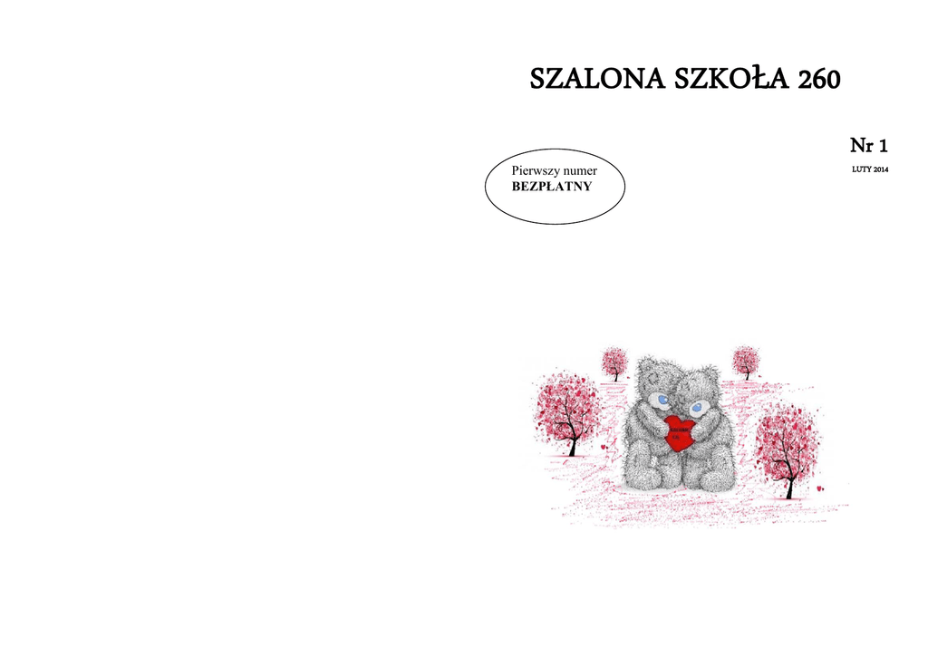 SZALONA SZKOŁA 260 Nr 1 Pierwszy numer BEZPŁATNY LUTY 2014 REDAKTOR NACZELNY p. Agnieszka Dymińska Zespoły i współpracownicy: PIERWSZA STRONA Alicja Szymańska DZIAŁ ROZRYWKA Zofia Oleksiak Katarzyna Tomaszewska Uwaga! Uwaga! DZIAŁ O SPORCIE Lubisz pisać i tworzyć ciekawe materiały? Myślisz o zawodzie dziennikarza Oliwia Płaska DZIAŁ O MODZIE Julia Gołdyn DZIAŁ ARTYKUŁY Alicja Kowalska Monika Bochenek lub po prostu chcesz się wypowiedzieć w ważnej sprawie? Chciałbyś wejść w skład redakcji „Szalonej Szkoły 260”? Jeśli Twoja odpowiedź brzmi „tak” – nie wahaj się i dołącz do Nas! Czekamy na Ciebie w każdy poniedziałek o godz. 13:30 w s. 24! To pierwsze wydanie Naszej szkolnej gazetki! Życzymy miłego czytania! W następnym numerze:  Dzień Kobiet  Pierwszy Dzień Wiosny  13 pytań do…… Wywiad z Panią Dyrektor Barbarą Rosz  Kącik zwierzęcy  Bliżej gwiazd: Kamil Stoch  Relacja z dyskoteki szkolnej Spis treści Ferie zimowe………………………………… str. 3 Walentynki ………………………………….. str. 4 Horoskop miłosny dla niej i dla niego ……… str. 6 Co warto obejrzeć? …………………………. str. 9 Warto przeczytać…………………………..... str. 11 Opowiadanie pt. „Klotek Kapcia” cz. I …….. str. 12 Bliżej gwiazd: Robert Lewandowki ………... str. 14 Kawały …………..………………………….. str. 16 W następnym numerze …………………….. str. 18 Uwaga! Uwaga! …………………………….. str. 19  Co warto obejrzeć?  Warto przeczytać  Moje hobby: Mitologia grecka  Moje hobby: Motoryzacha  Rebusy  Kawały Alicja Kowalska (IV a) Ferie zimowe ! Ferie - czas wolnego! Odpoczynek od szkoły i nauki, który trwa aż 14 dni! Słyszeliście o wycieczce w góry? Niezła propozycja. Wreszcie pada śnieg i dzieci mogą wyjść. Nie spędzajcie czasu przed komputerem, tabletem i telewizorem - wyjdźcie na świeże powietrze. Wyjdźcie na dwór!:) W województwie mazowieckim ferie zaczynają się 17 lutego. Wtedy każde dziecko, a nawet dorosły chce odpocząć od szkoły lub pracy. Pamiętajcie, żeby podczas ferii być ostrożny! Żeby nie wchodzić na ulicę bez rozglądania się, nie rozmawiać z nieznajomymi i nie brać od nich słodyczy, ciastek, napoi i itp. Proponuje wam jazdę na nartach lub snowboardzie. W Warszawie można wyszaleć się na Górce Szczęśliwickiej . Zachęcam was też do jazdy na łyżwach. Można też oczywiście obrzucać się śnieżkami, budować bałwana lub fortyfikacje. Dobrym pomysłem jest też udział w akcji „Zima w mieście”. Jakiejkolwiek propozycji byście nie wybierali - życzę Wam wspaniałej zabawy!:) K a s i a T o m a s z e w s k a, Z o s i a O l e k s i a k ( I V b ) Krzyżówka Pytania: 1. Zwierzę z rogami, które zamieszkuje kasy mieszane. 2. Pomarańczowa, na Halloween. 3. Dokończ związek frazeologiczny: Wiadomość …………… z palca. 4. Nauczyciel dyktuje je do dzienniczka. 5. ………… - nauka o tym, jak jednostka i społeczeństwo decydują o wykorzystaniu zasobów. 6. Mają je na głowie niektóre owady. 7. Nakrycie głowy, wykonane przeważnie z miękkiego materiału. 8. Ma wiele odmian (gatunków). Może być ziemna, zwykła, rosówka. 9. Bardzo pracowite zwierzęta. 10. Wbija się go do ściany. 11. Mała żabka. K asia Tomaszewska(IVb) Alicja Kowalska(IVa) Kawały Na lekcji pani nauczycielka kazała wszystkim uczniom powiedzieć jakiego zwierzaka mają w domu. Doszło do Jasia, nauczycielka spytała: -Jasiu jakie masz zwierzątko w domu ?? A Jaś na to: -Kurczaka w zamrażalniku! Jasio opowiada o swoich wrażeniach z pobytu w indiańskiej wiosce: - I poznałem wodza Wielkie Światło i jego dwóch synów. - A jak się nazywali??? - Włącznik i Wyłącznik. Jasiu, umiesz liczyć? - Tak, tato mnie nauczył! - To powiedz, co jest po sześciu? - Siedem. - Świetnie, a po siedmiu? - Osiem. - Brawo, nieźle cię tato nauczył, a co jest po dziesięciu? - Walet. Nauczycielka w szkole pyta Jasia. - Jasiu, powiedz co mamy z gąski? - Smalec. - No dobrze Jasiu, ale co jeszcze? - Smalec. -Dobrze, powiedz mi, co masz w poduszce? - Dziurę. - A co jest w tej dziurze? - Pierze. - No to co mamy z gąski? - Smalec. Monika Bochenek(IVa) Walentynki Historia święta Walentynki są obchodzone w południowej i zachodniej Europie od średniowiecza. Europa północna i wschodnia dołączyła do walentynkowego grona znacznie później. Pomimo katolickiego patrona tego święta, czasem wiązane jest ono ze zbieżnym terminowo zwyczajem pochodzącym z Cesarstwa Rzymskiego, polegającym głównie na poszukiwaniu wybranki serca, np. przez losowanie jej imienia ze specjalnej urny. Współczesny dzień zakochanych nie ma jednak bezpośredniego związku z jednym konkretnym świętem starożytnego Rzymu, choć jest kojarzony z takimi postaciami z mitologii jak Kupidyn, Eros, Pan czy Juno Februata. Możliwe, że zwyczaje związane z tym dniem nawiązują do starożytnego święta rzymskiego, zwanego Luperkaliami, obchodzonego 14–15 lutego ku czci Junony, rzymskiej bogini kobiet i małżeństwa, oraz Pana, boga przyrody. Z kolei Brytyjczycy uważają to święto za własne z uwagi na fakt, że rozsławił je na cały świat sir Walter Scott żyjący w XVIII wieku. Walentynki w Polsce Do Polski obchody walentynkowe trafiły w latach 90. XX wieku z kultury francuskiej i krajów anglosaskich, a także wraz z kultem świętego Walentego z Bawarii i Tyrolu. Święto to konkuruje o miano tzw. święta zakochanych z rodzimym świętem słowiańskim zwanym potocznie Nocą Kupały lub Sobótką, obchodzonym w nocy z dnia 21 na 22 czerwca. Zwyczaje Stałym niemalże elementem walentynek jest wzajemnie wręczanie sobie walentynkowych ozdobnych karteczek. Czerwone, najczęściej w kształcie serca, opatrzone walentynkowym wierszykiem, a często i miłosnym wyznaniem. Ze świętem łączy się również zwyczaj obdarowywania partner