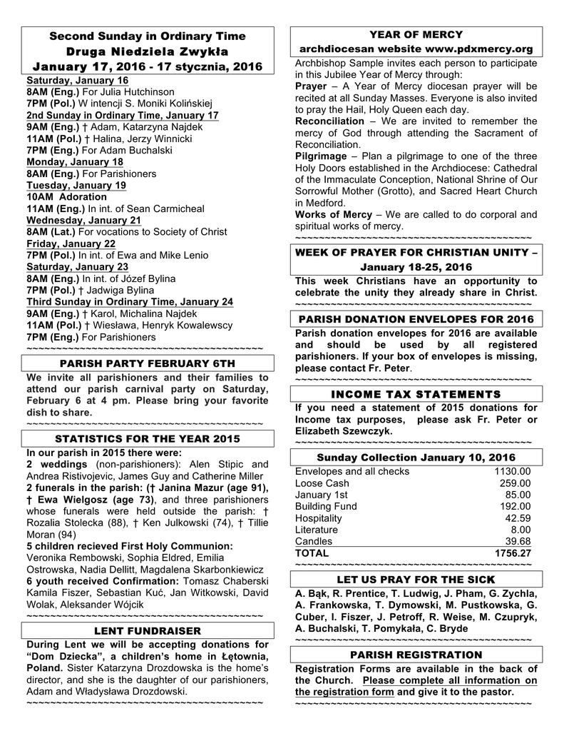Second Sunday in Ordinary Time Druga Niedziela Zwykła January 17, 2016 - 17 stycznia, 2016 Saturday, January 16 8AM (Eng.) For Julia Hutchinson 7PM (Pol.) W intencji S. Moniki Kolińskiej 2nd Sunday in Ordinary Time, January 17 9AM (Eng.) † Adam, Katarzyna Najdek 11AM (Pol.) † Halina, Jerzy Winnicki 7PM (Eng.) For Adam Buchalski Monday, January 18 8AM (Eng.) For Parishioners Tuesday, January 19 10AM Adoration 11AM (Eng.) In int. of Sean Carmicheal Wednesday, January 21 8AM (Lat.) For vocations to Society of Christ Friday, January 22 7PM (Pol.) In int. of Ewa and Mike Lenio Saturday, January 23 8AM (Eng.) In int. of Józef Bylina 7PM (Pol.) † Jadwiga Bylina Third Sunday in Ordinary Time, January 24 9AM (Eng.) † Karol, Michalina Najdek 11AM (Pol.) † Wiesława, Henryk Kowalewscy 7PM (Eng.) For Parishioners ~~~~~~~~~~~~~~~~~~~~~~~~~~~~~~~~~~~~~~~~ PARISH PARTY FEBRUARY 6TH We invite all parishioners and their families to attend our parish carnival party on Saturday, February 6 at 4 pm. Please bring your favorite dish to share. ~~~~~~~~~~~~~~~~~~~~~~~~~~~~~~~~~~~~~~~~ STATISTICS FOR THE YEAR 2015 In our parish in 2015 there were: 2 weddings (non-parishioners): Alen Stipic and Andrea Ristivojevic, James Guy and Catherine Miller 2 funerals in the parish: († Janina Mazur (age 91), † Ewa Wielgosz (age 73), and three parishioners whose funerals were held outside the parish: † Rozalia Stolecka (88), † Ken Julkowski (74), † Tillie Moran (94) 5 children recieved First Holy Communion: Veronika Rembowski, Sophia Eldred, Emilia Ostrowska, Nadia Dellitt, Magdalena Skarbonkiewicz 6 youth received Confirmation: Tomasz Chaberski Kamila Fiszer, Sebastian Kuć, Jan Witkowski, David Wolak, Aleksander Wójcik ~~~~~~~~~~~~~~~~~~~~~~~~~~~~~~~~~~~~~~~~ LENT FUNDRAISER During Lent we will be accepting donations for “Dom Dziecka”, a children’s home in Łętownia, Poland. Sister Katarzyna Drozdowska is the home’s director, and she is the daughter of our parishioners, Adam and Władysława Drozdowski. ~~~~~~~~~~~~~~~~~~~~~~~~~~~~~~~~~~~~~~~~ YEAR OF MERCY archdiocesan website www.pdxmercy.org Archbishop Sample invites each person to participate in this Jubilee Year of Mercy through: Prayer – A Year of Mercy diocesan prayer will be recited at all Sunday Masses. Everyone is also invited to pray the Hail, Holy Queen each day. Reconciliation – We are invited to remember the mercy of God through attending the Sacrament of Reconciliation. Pilgrimage – Plan a pilgrimage to one of the three Holy Doors established in the Archdiocese: Cathedral of the Immaculate Conception, National Shrine of Our Sorrowful Mother (Grotto), and Sacred Heart Church in Medford. Works of Mercy – We are called to do corporal and spiritual works of mercy. ~~~~~~~~~~~~~~~~~~~~~~~~~~~~~~~~~~~~~~~~ WEEK OF PRAYER FOR CHRISTIAN UNITY – January 18-25, 2016 This week Christians have an opportunity to celebrate the unity they already share in Christ. ~~~~~~~~~~~~~~~~~~~~~~~~~~~~~~~~~~~~~~~~ PARISH DONATION ENVELOPES FOR 2016 Parish donation envelopes for 2016 are available and should be used by all registered parishioners. If your box of envelopes is missing, please contact Fr. Peter. ~~~~~~~~~~~~~~~~~~~~~~~~~~~~~~~~~~~~~~~~ IN CO M E TAX STATEM EN T S If you need a statement of 2015 donations for Income tax purposes, please ask Fr. Peter or Elizabeth Szewczyk. ~~~~~~~~~~~~~~~~~~~~~~~~~~~~~~~~~~~~~~~~ Sunday Collection January 10, 2016 Envelopes and all checks 1130.00 Loose Cash 259.00 January 1st 85.00 Building Fund 192.00 Hospitality 42.59 Literature 8.00 Candles 39.68 TOTAL 1756.27 ~~~~~~~~~~~~~~~~~~~~~~~~~~~~~~~~~~~~~~~~ LET US PRAY FOR THE SICK A. Bąk, R. Prentice, T. Ludwig, J. Pham, G. Zychla, A. Frankowska, T. Dymowski, M. Pustkowska, G. Cuber, I. Fiszer, J. Petroff, R. Weise, M. Czupryk, A. Buchalski, T. Pomykała, C. Bryde ~~~~~~~~~~~~~~~~~~~~~~~~~~~~~~~~~~~~~~~~ PARISH REGISTRATION Registration Forms are available in the back of the Church. Please complete all information on the registration form and give it to the pastor. ~~~~~~~~~~~~~~~~~~~~~~~~~~~~~~~~~~~~~~~~ ROK MIŁOSIERDZIA diecezjalny website www.pdxmercy.org Papież Franciszek ogłosił Rok Miłosierdzia, który rozpoczął się uroczystością Niepokalanego Poczęcia, 8 grudnia 2015 i zakończy się w uroczystość Chrystusa Króla, 20 listopada 2016. Arcybiskup Sample prosi o: Modlitwę w każdą niedzielę po Mszy św., specjalną modlitwę w intencji naszej Archidiecezji Modlitwę osobistą i rodzinną, „Pod Twoją Obronę uciekamy się...” (codziennie), koronkę do Miłosierdzia Bożego (raz w tygodniu) Kościoły pielgrzymkowe w naszej Archidiecezji: Cathedral of the Immaculate Conception National Shrine of Our Sorrowful Mother (Grotto) Sacred Heart Church in Medford Spowiedź: sacrament pokuty jest głównym elementem świętowania Roku Miłosierdzia – korzystanie z Miłosierdzia Bożego przez spowiedź Dzieła Miłosierdzia: przez praktykę aktów miłosierdzia wględem ciała i duszy mamy realizować Miłosierdzie Boże pośród nas ~~~~~~~~~~~~~~~~~~~~~~~~~~~~~~~~~~~~~~~~ TYDZIEŃ MODLITW O JEDNOŚĆ CHRZEŚCIJAN – 18-25 stycznia 2016 Chrześcijaństwo jest religią tych, którzy wyznają wiarę w Jezusa Chrystusa, uznając Go za Syna Bożego, który przyniósł światu powszechne orędzie zbawienia, kontynuując i wypełniając przymierze zawarte między Bogiem a Jego ludem. Fundamentalną kwestią jest wspólnotowy wymiar chrześcijaństwa: chrześcijanie mają bezpośrednio uczestniczyć w życiu wspólnoty, jaką jest Kościół - Mistyczne Ciało Chrystusa. Poszukiwanie jedności wśród chrześcijan (katolicy, protestanci, anglikanie, prawosławni oraz kościoły autonomiczne) nazywamy ekumenizmem. ~~~~~~~~~~~~~~~~~~~~~~~~~~~~~~~~~~~~~~~~ HEJ, KOLĘDA, KOLĘDA Noworoczne duszpasterskie odwiedziny rodzin z błogosławieństwem domów rozpoczeły się. Prosimy zgłaszać się do Ks. Piotra w celu ustalenia terminu kolędy. ~~~