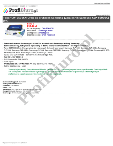 Informacje o produkcie Utworzono 02-03-2017 Toner CW-S500CN Cyan do drukarek Samsung (Zamiennik Samsung CLP-500D5C) [5k] Cena : 255,10 zł ● ● ● ● ● ● ● ● Zamiennik toneru Samsung CLP-500D5C do drukarek laserowych firmy Samsung. Zamiennik nowy, fabrycznie wykonany w 100% znowych elmenentów - nie regenerowany. Toner CLP500D5C dedykowany jest do kolorowych drukarek laserowych Samsung CLP-500, Samsung CLP-500N, Samsung CLP-550, Samsung CLP-550N; Samsung CLP500, Samsung CLP500N, Samsung CLP550, Samsung CLP550N; Samsung CLP 500, Samsung CLP 500N, Samsung CLP 550, Samsung CLP 550 Błękitny toner CLP-500D5C - zamiennik marki Cartridge Web. Kod OEM: CLP-500D5C Kod Producenta: CW-S500CN Kolor: Cyan Wydajność: ok. 5.000 stron A4 przy pokryciu 5% strony Ilość w opakowaniu - 1 szt. iu r ● o. pl Nr katalogowy : CW-S500CN Producent : Cartridge Web Dostępność : Dostępny Średnia ocena : brak recenzji iB Tonery tajwańskiej firmy General Plastic Industrial Co., Ltd oferującycm tonery pod marką Cartridge Web TM to wysoka niezawodność wynikająca z ponad 30 lat doświadczeń w produkcji alternatywnych materiałów eksploatacyjnych do drukarek oraz kopiarek. Pr of Zamiennik/Oryginał: Zamiennik Rodzaj zamiennika: NOWY Kod OEM: CLP-500D5C Kolor: Cyan Wydajność: ok. 5.000 stron A4 przy pokryciu 5% strony Kompatybilność: Samsung CLP-500D5C Gwarancja: 24 miesiące lub do wyczerpania wkładu Wygenerowano w programie www.oscGold.com