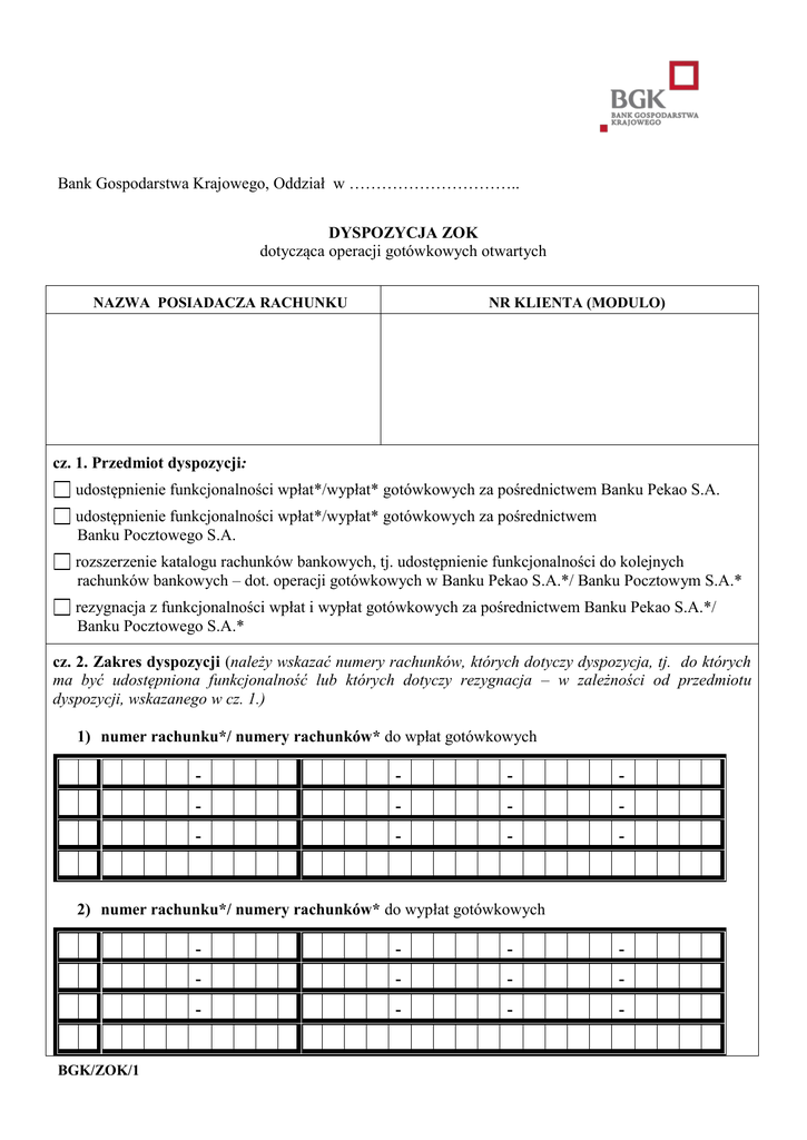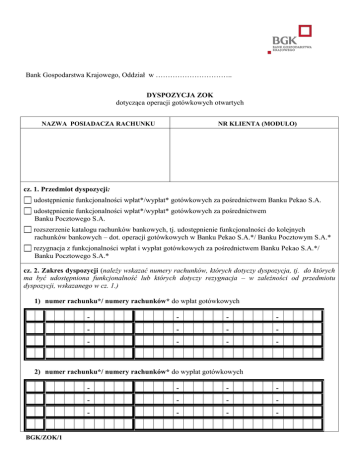 Bank Gospodarstwa Krajowego, Oddział w ………………………….. DYSPOZYCJA ZOK dotycząca operacji gotówkowych otwartych NAZWA POSIADACZA RACHUNKU NR KLIENTA (MODULO) cz. 1. Przedmiot dyspozycji: udostępnienie funkcjonalności wpłat*/wypłat* gotówkowych za pośrednictwem Banku Pekao S.A. udostępnienie funkcjonalności wpłat*/wypłat* gotówkowych za pośrednictwem Banku Pocztowego S.A. rozszerzenie katalogu rachunków bankowych, tj. udostępnienie funkcjonalności do kolejnych rachunków bankowych – dot. operacji gotówkowych w Banku Pekao S.A.*/ Banku Pocztowym S.A.* rezygnacja z funkcjonalności wpłat i wypłat gotówkowych za pośrednictwem Banku Pekao S.A.*/ Banku Pocztowego S.A.* cz. 2. Zakres dyspozycji (należy wskazać numery rachunków, których dotyczy dyspozycja, tj. do których ma być udostępniona funkcjonalność lub których dotyczy rezygnacja – w zależności od przedmiotu dyspozycji, wskazanego w cz. 1.) 1) numer rachunku*/ numery rachunków* do wpłat gotówkowych - - - - - - - - - - - - 2) numer rachunku*/ numery rachunków* do wypłat gotówkowych - - - - - - - - - - - - BGK/ZOK/1/ZOBGKK cz. 3. Oświadczenia (dot. udostępnienia funkcjonalności lub rozszerzenia katalogu rachunków) Oświadczamy, że: 1) upoważniamy Bank Gospodarstwa Krajowego do realizacji dyspozycji związanych z dokonywaniem wpłat i wypłat gotówkowych otwartych w placówce Pośrednika kasowego, w tym do obciążania lub uznawania rachunków, których katalog określamy powyżej, zgodnie z otrzymanymi od nas dyspozycjami; 2) upoważniamy Bank do obciążania prowadzonych na naszą rzecz rachunków bankowych kwotami opłat i prowizji należnych za realizowanie operacji gotówkowych w placówce Pośrednika kasowego; 3) przed złożeniem niniejszej Dyspozycji ZOK zapoznaliśmy się z Regulaminem zastępczej obsługi kasowej w Banku Gospodarstwa Krajowego i Zasadami realizowania operacji gotówkowych w Banku Pekao S.A.*/Zasadami realizowania operacji gotówkowych w Banku Pocztowym S.A.*, stanowiącymi załącznik do tego Regulaminu, zwanymi dalej łącznie Regulaminem, udostępnionym na stronie internetowej BGK pod adresem: www.bgk.pl i akceptujmy zawarte w nim postanowienia. miejscowość i data pieczęć firmowa i podpisy osób uprawnionych do otwarcia rachunku i składania oświadczeń w zakresie praw i obowiązków majątkowych Posiadacza rachunku WYPEŁNIA BANK stempel dzienny pieczęć imienna i podpis pracownika Banku przyjmującego dyspozycję wyrażam zgodę na udostępnienie funkcjonalności nie wyrażam zgody na udostępnienie funkcjonalności, z powodu ………………………....................................................................................................................................... miejscowość i data pieczęć imienna i podpis pracownika Banku podejmującego decyzję - odpowiednie zaznaczyć *) niepotrzebne skreślić 2/2 /ZOBGKK