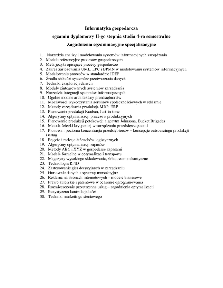 Informatyka gospodarcza egzamin dyplomowy II-go stopnia studia 4-ro semestralne Zagadnienia egzaminacyjne specjalizacyjne 1. Narzędzia analizy i modelowania systemów informacyjnych zarządzania 2. Modele referencyjne procesów gospodarczych 3. Meta-języki opisujące procesy gospodarcze 4. Zakres zastosowania UML, EPC i BPMN w modelowaniu systemów informacyjnych 5. Modelowanie procesów w standardzie IDEF 6. Źródła słabości systemów przetwarzania danych 7. Techniki eksploracji danych 8. Moduły zintegrowanych systemów zarządzania 9. Narzędzia integracji systemów informatycznych 10. Ogólne modele architektury przedsiębiorstw 11. Możliwości wykorzystania serwisów społecznościowych w reklamie 12. Metody zarządzania produkcją MRP, ERP 13. Planowanie produkcji Kanban, Just-in-time 14. Algorytmy optymalizacji procesów produkcyjnych 15. Planowanie produkcji potokowej: algorytm Johnsona, Bucket Brigades 16. Metoda ścieżki krytycznej w zarządzaniu przedsięwzięciami 17. Pionowa i pozioma koncentracja przedsiębiorstw – koncepcje outsourcingu produkcji i usług 18. Pojęcie i rodzaje łańcuchów logistycznych 19. Algorytmy optymalizacji zapasów 20. Metody ABC i XYZ w gospodarce zapasami 21. Modele formalne w optymalizacji transportu 22. Magazyny wysokiego składowania, składowanie chaotyczne 23. Technologia RFID 24. Zastosowanie gier decyzyjnych w zarządzaniu 25. Hurtownie danych a systemy transakcyjne 26. Reklama na stronach internetowych – modele biznesowe 27. Prawo autorskie i patentowe w ochronie oprogramowania 28. Rozmieszczenie przestrzenne usług – zagadnienia optymalizacji 29. Statystyczna kontrola jakości 30. Techniki marketingu sieciowego