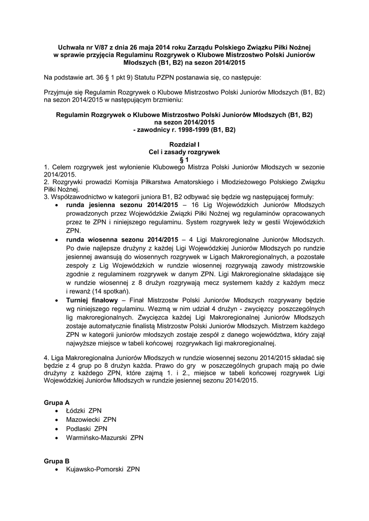 Uchwała nr V/87 z dnia 26 maja 2014 roku Zarządu Polskiego Związku Piłki Nożnej w sprawie przyjęcia Regulaminu Rozgrywek o Klubowe Mistrzostwo Polski Juniorów Młodszych (B1, B2) na sezon 2014/2015 Na podstawie art. 36 § 1 pkt 9) Statutu PZPN postanawia się, co następuje: Przyjmuje się Regulamin Rozgrywek o Klubowe Mistrzostwo Polski Juniorów Młodszych (B1, B2) na sezon 2014/2015 w następującym brzmieniu: Regulamin Rozgrywek o Klubowe Mistrzostwo Polski Juniorów Młodszych (B1, B2) na sezon 2014/2015 - zawodnicy r. 1998-1999 (B1, B2) Rozdział I Cel i zasady rozgrywek §1 1. Celem rozgrywek jest wyłonienie Klubowego Mistrza Polski Juniorów Młodszych w sezonie 2014/2015. 2. Rozgrywki prowadzi Komisja Piłkarstwa Amatorskiego i Młodzieżowego Polskiego Związku Piłki Nożnej. 3. Współzawodnictwo w kategorii juniora B1, B2 odbywać się będzie wg następującej formuły: runda jesienna sezonu 2014/2015 – 16 Lig Wojewódzkich Juniorów Młodszych prowadzonych przez Wojewódzkie Związki Piłki Nożnej wg regulaminów opracowanych przez te ZPN i niniejszego regulaminu. System rozgrywek leży w gestii Wojewódzkich ZPN. runda wiosenna sezonu 2014/2015 – 4 Ligi Makroregionalne Juniorów Młodszych. Po dwie najlepsze drużyny z każdej Ligi Wojewódzkiej Juniorów Młodszych po rundzie jesiennej awansują do wiosennych rozgrywek w Ligach Makroregionalnych, a pozostałe zespoły z Lig Wojewódzkich w rundzie wiosennej rozgrywają zawody mistrzowskie zgodnie z regulaminem rozgrywek w danym ZPN. Ligi Makroregionalne składające się w rundzie wiosennej z 8 drużyn rozgrywają mecz systemem każdy z każdym mecz i rewanż (14 spotkań). Turniej finałowy – Finał Mistrzostw Polski Juniorów Młodszych rozgrywany będzie wg niniejszego regulaminu. Wezmą w nim udział 4 drużyn - zwycięzcy poszczególnych lig makroregionalnych. Zwycięzca każdej Ligi Makroregionalnej Juniorów Młodszych zostaje automatycznie finalistą Mistrzostw Polski Juniorów Młodszych. Mistrzem każdego ZPN w kategorii juniorów młodszych zostaje zespół z danego województwa, który zajął najwyższe miejsce w tabeli końcowej rozgrywkach ligi makroregionalnej. 4. Liga Makroregionalna Juniorów Młodszych w rundzie wiosennej sezonu 2014/2015 składać się będzie z 4 grup po 8 drużyn każda. Prawo do gry w poszczególnych grupach mają po dwie drużyny z każdego ZPN, które zajmą 1. i 2., miejsce w tabeli końcowej rozgrywek Ligi Wojewódzkiej Juniorów Młodszych w rundzie jesiennej sezonu 2014/2015. Grupa A Łódzki ZPN Mazowiecki ZPN Podlaski ZPN Warmińsko-Mazurski ZPN Grupa B Kujawsko-Pomorski ZPN Pomorski ZPN Wielkopolski ZPN Zachodniopomorski ZPN Grupa C Dolnośląski ZPN Lubuski ZPN Opolski ZPN Śląski ZPN Grupa D Lubelski ZPN Małopolski ZPN Podkarpacki ZPN Świętokrzyski ZPN 5. Rozgrywki poszczególnych grup Ligi Makroregionalnej Juniorów Młodszych w sezonie 2014/2015 będą prowadzone przez Związki wskazane przez Komisję Piłkarstwa Amatorskiego i Młodzieżowego PZPN. 6. Rozgrywki w poszczególnych grupach muszą zakończyć się do 10 czerwca 2015 r. Związki Piłki Nożnej prowadzące rozgrywki, w terminie do dnia 13 czerwca 2015 r. mają obowiązek przesłać do Komisji Piłkarstwa Amatorskiego i Młodzieżowego PZPN weryfikacje rozgrywek. §2 1. W przypadku rezygnacji z udziału w rozgrywkach Ligi Makroregionalnej Juniorów Młodszych przez drużynę lub drużyny zajmujące w tabeli końcowej po rundzie jesiennej Ligi Wojewódzkiej Juniorów Młodszych miejsca 1. i 2., prawo udziału w rozgrywkach Ligi Makroregionalnej Juniorów Młodszych uzyska drużyna (drużyny) zajmujące kolejne najwyższe miejsce w rozgrywkach danej Ligi Wojewódzkiej Juniorów Młodszych. 2. W przypadku, gdy z danego województwa liczba drużyn, które zrezygnują z udziału w rozgrywkach Ligi Makroregionalnej Juniorów Młodszych spowoduje, że z danego województwa udział w rozgrywkach weźmie mniej niż 2 drużyny „wolne” miejsce zostanie rozlosowane pomiędzy pozostałe (z danej grupy) Wojewódzkie ZPN. Rozdział II Postanowienia ogólne §3 Rozgrywki Ligi Makroregionalnej prowadzone są we wszystkich tzw. „makroregionach” w rundzie wiosennej sezonu 2014/2015. Rozgrywki prowadzone są na podstawie niniejszego regulaminu i terminarza rozgrywek oraz w oparciu o: Przepisy gry w piłkę nożną; Uchwałę Zarządu PZPN z dni 3 i 7.07.2008 roku w sprawie organizacji rozgrywek w piłkę nożną (z późniejszymi zmianami); Uchwałę Zarządu PZPN z dnia 14.07.2006 roku w sprawie statusu zawodników, występujących w polskich klubach piłkarskich oraz zasad zmian przynależności klubowej (z późniejszymi zmianami); Regulamin Dyscyplinarny PZPN - Uchwała Walnego Zgromadzenia PZPN z dnia 21 czerwca 2013 roku; Ustawę o bezpieczeństwie imprez masowych z dnia 20.03.2009 roku.; Uchwałę Zarządu PZPN z dnia 6.05.2009 roku w sprawie licencji trenerskich; Uchwałę Zarządu PZPN nr IX/169 z dnia 31.08.2010 roku w sprawie współzawodnictwa dzieci i młodzieży piłkarskiej w Polsce. Organizacja, nadzór i kontrola przestrzegania obowiązujących przepisów gry i postanowień niniejszego regulaminu – należy do właściwych organów Związku prowadzącego rozgrywki w danym sezonie . Kluby biorące udział w rozgrywkach przekazują informacje za pomocą poczty elektronicznej. Za skuteczne dostarczenie takiej wiadomości należy uznać pismo, na które klub otrzymał odpowiedź lub tzw. „potwierdzenie dostarczenia wiadomości”. Rozgrywki Lig Makroregionalnych Juniorów prowadzone są w systemie Extranet – terminarz, wyniki, rejestracja zawodników, wypełnianie sprawozdań sędziowskich i ewidencja kar odbywają się za pośrednictwem niniejszego systemu. Rozdział III Boiska §4 W rozgrywkach Ligi Makroregionalnej Juniorów Młodszych minimalny wymiar boisk wynosi 100m x 64m. §5 1. Spotkania mistrzowskie muszą być rozgrywane na boiskach trawiastych lub na boiskach ze sztuczną