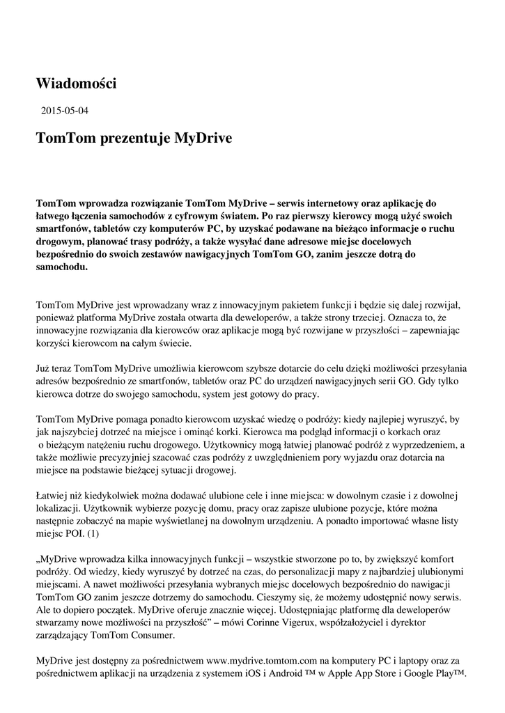 Wiadomości 2015-05-04 TomTom prezentuje MyDrive TomTom wprowadza rozwiązanie TomTom MyDrive – serwis internetowy oraz aplikację do łatwego łączenia samochodów z cyfrowym światem. Po raz pierwszy kierowcy mogą użyć swoich smartfonów, tabletów czy komputerów PC, by uzyskać podawane na bieżąco informacje o ruchu drogowym, planować trasy podróży, a także wysyłać dane adresowe miejsc docelowych bezpośrednio do swoich zestawów nawigacyjnych TomTom GO, zanim jeszcze dotrą do samochodu. TomTom MyDrive jest wprowadzany wraz z innowacyjnym pakietem funkcji i będzie się dalej rozwijał, ponieważ platforma MyDrive została otwarta dla deweloperów, a także strony trzeciej. Oznacza to, że innowacyjne rozwiązania dla kierowców oraz aplikacje mogą być rozwijane w przyszłości – zapewniając korzyści kierowcom na całym świecie. Już teraz TomTom MyDrive umożliwia kierowcom szybsze dotarcie do celu dzięki możliwości przesyłania adresów bezpośrednio ze smartfonów, tabletów oraz PC do urządzeń nawigacyjnych serii GO. Gdy tylko kierowca dotrze do swojego samochodu, system jest gotowy do pracy. TomTom MyDrive pomaga ponadto kierowcom uzyskać wiedzę o podróży: kiedy najlepiej wyruszyć, by jak najszybciej dotrzeć na miejsce i ominąć korki. Kierowca ma podgląd informacji o korkach oraz o bieżącym natężeniu ruchu drogowego. Użytkownicy mogą łatwiej planować podróż z wyprzedzeniem, a także możliwie precyzyjniej szacować czas podróży z uwzględnieniem pory wyjazdu oraz dotarcia na miejsce na podstawie bieżącej sytuacji drogowej. Łatwiej niż kiedykolwiek można dodawać ulubione cele i inne miejsca: w dowolnym czasie i z dowolnej lokalizacji. Użytkownik wybierze pozycję domu, pracy oraz zapisze ulubione pozycje, które można następnie zobaczyć na mapie wyświetlanej na dowolnym urządzeniu. A ponadto importować własne listy miejsc POI. (1) „MyDrive wprowadza kilka innowacyjnych funkcji – wszystkie stworzone po to, by zwiększyć komfort podróży. Od wiedzy, kiedy wyruszyć by dotrzeć na czas, do personalizacji mapy z najbardziej ulubionymi miejscami. A nawet możliwości przesyłania wybranych miejsc docelowych bezpośrednio do nawigacji TomTom GO zanim jeszcze dotrzemy do samochodu. Cieszymy się, że możemy udostępnić nowy serwis. Ale to dopiero początek. MyDrive oferuje znacznie więcej. Udostępniając platformę dla deweloperów stwarzamy nowe możliwości na przyszłość” – mówi Corinne Vigerux, współzałożyciel i dyrektor zarządzający TomTom Consumer. MyDrive jest dostępny za pośrednictwem www.mydrive.tomtom.com na komputery PC i laptopy oraz za pośrednictwem aplikacji na urządzenia z systemem iOS i Android ™ w Apple App Store i Google Play™. MyDrive wprowadzany jest wraz z nowymi nawigacjami TomTom GO 510, GO 610, GO 5100 i GO 6100. Jest też dostępny dla wcześniejszych urządzeń TomTom GO (2) dzięki aktualizacji oprogramowania. Źródło:TomTom Źródło: http://www.paliwa.pl/strona-startowa/archiwum/tomtom-prezentuje-mydrive Powered by TCPDF (www.tcpdf.org)