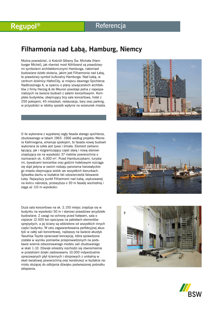 Regupol® Referencja Filharmonia nad Łabą, Hamburg, Niemcy Można powiedzieć, iż Kościół Główny Św. Michała (Hamburger Michel), jak również most Köhlbrand są prawdziwymi symbolami architektonicznymi Hamburga, natomiast budowlane dzieło stulecia, jakim jest Filharmonia nad Łabą, to prawdziwy symbol kulturalny Hamburga. Nad Łabą, w centrum dzielnicy HafenCity, w miejscu dawnego Spichlerza Nadbrzeżnego A, w oparciu o plany szwajcarskich architektów z firmy Herzog & de Meuron powstaje jedna z najwspanialszych na świecie budowli z salami koncertowymi. Kompleks budynków, obejmujący trzy sale koncertowe, hotel z 250 pokojami, 45 mieszkań, restauracje, bary oraz parking, w przyszłości w istotny sposób wpłynie na wizerunek miasta. O ile wykonana z wypalanej cegły fasada starego spichlerza, zbudowanego w latach 1963 -1966 według projektu Wernera Kallmorgena, emanuje spokojem, to fasada nowej budowli wykonana ze szkła jest żywa i śmiała. Element zarówno łączący, jak i rozgraniczający część starą i nową stanowi znajdująca sie na wysokości 37 metrów powierzchnia o rozmiarach ok. 4.000 m2. Przed Hamburczykami, turystami, bywalcami koncertów oraz gośćmi hotelowymi rozciąga się stąd jedyna w swoim rodzaju panorama hanzeatyckiego miasta obejmująca widok we wszystkich kierunkach. Sylwetka dachu w kształcie fali odzwierciedla falowanie Łaby. Najwyższy punkt Filharmonii nad Łabą, usytuowanej na końcu nabrzeża, przewyższa o 30 m fasadę wschodnią i sięga aż 110 m wysokości. Duża sala koncertowa na ok. 2.150 miejsc znajduje się w budynku na wysokości 50 m i stanowi prawdziwe arcydzieło budowlane. Z uwagi na ochronę przed hałasem, sala o ciężarze 12.500 ton spoczywa na pakietach elementów sprężystych, a jej ściany są oddzielone od wszystkich innych części budynku. W celu zagwarantowania perfekcyjnej akustyki w całej sali koncertowej, najlepszy na świecie akustyk Yasuhisa Toyota opracował koncepcję, która sprawdzona została w wyniku pomiarów przeprowadzonych na podstawie wiernie odwzorowanego modelu sali zbudowanego w skali 1:10. Dźwięk orkiestry rozchodzi się równomiernie w przestrzeni dzięki zastosowaniu 10.000 indywidualnie opracowanych płyt ściennych i stropowych z unikalną w skali światowej powierzchnią oraz konstrukcji w kształcie namiotu służącej do odbijania dźwięku podwieszonej pośrodku sklepienia. Regupol® Referencja Nie tylko w przypadku Dużej Sali planiści zwracali uwagę na perfekcyjną akustykę. Również w przypadku Małej Sali i Studia Nadbrzeżnego, pomieszczeń muzycznych przewidzianych dla muzyki kameralnej, współczesnej i eksperymentalnej, koncertów dla dzieci i prób chóru, spełnione zostały wszelkie akustyczne wymagania sal koncertowych. Dzięki zastosowaniu mat służących do izolacji dźwięków uderzeniowych produkcji firmy BSW, podczas budowy konstrukcji stropów między piętrami zapewnione zostało minimalne przenoszenie dźwięku. W Studiu Nadbrzeżnym – w celu dopasowania do wymaganej wysokości budowli – zamontowano, leżące jedna na drugiej, dwie warstwy mat Regupol® BA oraz jedną warstwę maty Regupol® E48. Regupol® E48 Ponieważ Studio Nadbrzeżne znajduje się bezpośrednio nad garażem podziemnym oraz ze względu na konieczność zmniejszenia dźwięków powietrznych zamontowana została płyta jastrychowa o grubości ok. 100 mm na matach tłumiących Regupol®. Maty tłumiące wykonane z włókien gumowych wiązanych za pomocą PU, posiadające Europejską Aprobatę Techniczną (ETA), dzięki wysokiemu udźwigowi charakteryzują się minimalną ściśliwością i wysoką zdolnością do przywracania pierwotnego kształtu. W Studiu Nadbrzeżnym Filharmonii nad Łabą, przed rozpoczęciem montażu płyt tłumiących, na wznoszących się ku górze częściach konstrukcyjnych ułożono brzegowe pasy tłumiące Regupol®. Po ułożeniu na styk do czoła wykonane zostało sklejenie za pomocą taśmy klejącej i wykończenie z wykorzystaniem folii polietylenowej o grubości 0,2 mm. Folia polietylenowa zapobiega wnikaniu jastrychu do porowatej struktury Regupol®, a tym samym tworzeniu się mostków dźwiękowych i związanego z tym przenoszenia dźwięków materiałowych. www.bswwibroakustyka .pl Kontakt: BSW Polska • [email protected] • materiały do pobrania na stronie www.bsw-wibroakustyka.pl Online Version December 2011 Dalsze referencje znajdują się na naszej stronie internetowej Regupol® BA