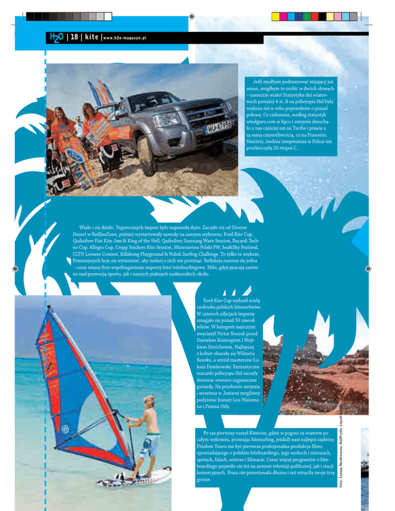 | 18 | kite |www.h2o-magazyn.pl Jeśli miałbym podsumować mijający już sezon, mógłbym to zrobić w dwóch słowach – nareszcie wiało! Statystyka dni wiatrowych powyżej 4 st. B na półwyspie Hel była większa niż w roku poprzednim o ponad połowę. Co ciekawsze, według statystyk windguru.com w lipcu i sierpniu dmuchało u nas częściej niż na Tarifie i prawie z tą samą częstotliwością, co na Prasonisi. Niestety, średnia temperatura w Polsce nie przekroczyła 20 stopni C… Ford Kite Cup wyłonił ścisłą czołówkę polskich kitesurferów. W czterech edycjach imprezy zmagało się ponad 50 zawodników. W kategorii mężczyzn zwyciężył Victor Borsuk przed Danielem Kozirogiem i Wojtkiem Streicherem. Najlepszą z kobiet okazała się Wiktoria Boszko, a wśród mastersów Łukasz Dymkowski. Fantastyczne warunki półwyspu Hel zaczęły doceniać również zagraniczne gwiazdy. Na przełomie sierpnia i września w Jastarni mogliśmy podziwiać kunszt Lou Wainmana i Franza Orly. Po raz pierwszy ruszył Kitetour, gdzie w pogoni za wiatrem po całym wybrzeżu, promując kitesurfing, jeździli nasi najlepsi rajderzy. Finałem Touru ma być pierwsza profesjonalna produkcja filmu opowiadającego o polskim kiteboardingu, jego urokach i minusach, spotach, falach, wietrze i klimacie. Coraz więcej programów o kiteboardingu pojawiło się też na antenie telewizji publicznej, jak i stacji komercyjnych. Prasa nie pozostawała dłużna i też wtrąciła swoje trzy grosze. foto: Łukasz Nazdraczew, NeilPryde, Liquid Force Wiało i się działo. Tegorocznych imprez było naprawdę dużo. Zaczęło się od Diverse Desert w RedSeaZone, później wystartowały zawody na naszym wybrzeżu: Ford Kite Cup, Quiksilver Fiat Kite Jam & King of the Hell, Quiksilver Samsung Wave Session, Bacardi Techno Cup, Allegro Cup, Cropp Snickers Kite Session, Mistrzostwa Polski FW, Sea&Sky Festiwal, CLTN Loosers Contest, Billabong Playground & Polish Surfing Challenge. To tylko te większe. Pomniejszych boję się wymieniać, aby żadnej z nich nie pominąć. Refleksja nasuwa się jedna – coraz więcej firm współorganizuje imprezy kite/windsurfingowe. Miło, gdyż pracują zarówno nad promocją sportu, jak i naszych pięknych nadmorskich okolic. www.h2o-magazyn.pl Le pi ej | kite | 19 | ni ż… Niestety, pomimo pojawiających się wcześniej plotek nie wprowadzono żadnych rewolucyjnych konstrukcji latawców. Ogólnie zaobserwowane tendencje to odejście od bloczków na barze, co zaowocowało zmniejszeniem sił działających na bar. W większości modeli kite’ów poprawiono również pływanie na wiatr oraz startowanie latawca z wody. Miejmy nadzieję, że przyszły rok okaże się tak samo wietrzny jak ten. Jeśli słonko grzałoby u nas częściej, niewątpliwie byłby to najlepszy sezon ostatniej dekady. Najwyższa pora zaplanować, gdzie popływać zimą, ale o tym w następnym numerze… ❚❚❚❚❚ Mariusz Korlak