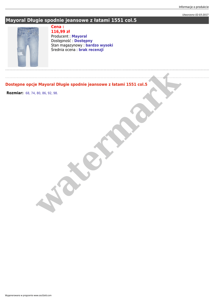 Informacje o produkcie Utworzono 02-03-2017 Mayoral Długie spodnie jeansowe z łatami 1551 col.5 Cena : 116,99 zł Producent : Mayoral Dostępność : Dostępny Stan magazynowy : bardzo wysoki Średnia ocena : brak recenzji w at Rozmiar: 68, 74, 80, 86, 92, 98. er m ar k Dostępne opcje Mayoral Długie spodnie jeansowe z łatami 1551 col.5 Wygenerowano w programie www.oscGold.com
