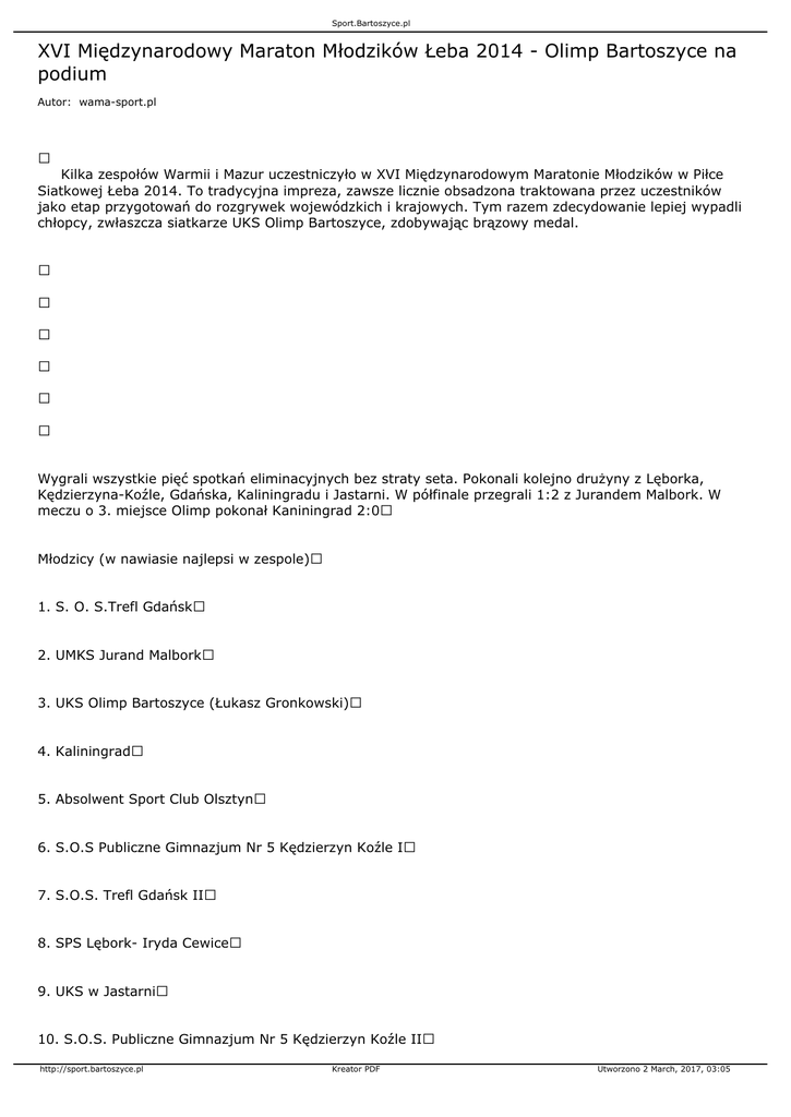 Sport.Bartoszyce.pl XVI Międzynarodowy Maraton Młodzików Łeba 2014 - Olimp Bartoszyce na podium Autor: wama-sport.pl Kilka zespołów Warmii i Mazur uczestniczyło w XVI Międzynarodowym Maratonie Młodzików w Piłce Siatkowej Łeba 2014. To tradycyjna impreza, zawsze licznie obsadzona traktowana przez uczestników jako etap przygotowań do rozgrywek wojewódzkich i krajowych. Tym razem zdecydowanie lepiej wypadli chłopcy, zwłaszcza siatkarze UKS Olimp Bartoszyce, zdobywając brązowy medal. Wygrali wszystkie pięć spotkań eliminacyjnych bez straty seta. Pokonali kolejno drużyny z Lęborka, Kędzierzyna-Koźle, Gdańska, Kaliningradu i Jastarni. W półfinale przegrali 1:2 z Jurandem Malbork. W meczu o 3. miejsce Olimp pokonał Kaniningrad 2:0 Młodzicy (w nawiasie najlepsi w zespole) 1. S. O. S.Trefl Gdańsk 2. UMKS Jurand Malbork 3. UKS Olimp Bartoszyce (Łukasz Gronkowski) 4. Kaliningrad 5. Absolwent Sport Club Olsztyn 6. S.O.S Publiczne Gimnazjum Nr 5 Kędzierzyn Koźle I 7. S.O.S. Trefl Gdańsk II 8. SPS Lębork- Iryda Cewice 9. UKS w Jastarni 10. S.O.S. Publiczne Gimnazjum Nr 5 Kędzierzyn Koźle II http://sport.bartoszyce.pl Kreator PDF Utworzono 2 March, 2017, 03:05 Sport.Bartoszyce.pl 11. Omega Gdynia Najlepsi zawodnicy turnieju: 1.Stolc Tomasz -S.O.S Trefl Gdańsk 2.Jędrzejczyk Marcin- S.O.S. UMKS Jurand Malbork 3.Dorosz Michał UKS Olimp Bartoszyce Skład UKS Olimp Bartoszyce Michał Doroz kapitan, Maciej Trzciński, Konrad Bachanowicz, Adam Bachanowicz, Łukasz Gronkowski, Michał Narkowicz, Rafał Potapienko, Olaf Wasilewski, Maciej Zawadzki, Sebastian Lech, Maksymilian Kapusto, Bartłomiej Krzeminski, Bartłomiej Bartnicki, Kacper Urbańczyk Sebastian Zawada. Trener Sylswester Nowokuński http://sport.bartoszyce.pl Kreator PDF Utworzono 2 March, 2017, 03:05