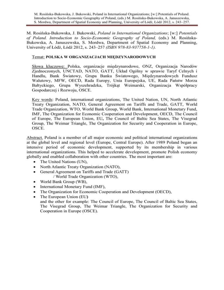 M. Rosińska-Bukowska, J. Bukowski, Poland in International Organizations; [w:] Potentials of Poland. Introduction to Socio-Economic Geography of Poland, (eds.) M. Rosińska-Bukowska, A. Januszewska, S. Mordwa, Department of Spatial Economy and Planning, University of Łódź, Łódź 2012, s. 243–257. M. Rosińska-Bukowska, J. Bukowski, Poland in International Organizations; [w:] Potentials of Poland. Introduction to Socio-Economic Geography of Poland, (eds.) M. RosińskaBukowska, A. Januszewska, S. Mordwa, Department of Spatial Economy and Planning, University of Łódź, Łódź 2012, s. 243–257 (ISBN 978-83-937758-1-1). Temat: POLSKA W ORGANIZACJACH MIĘDZYNARODOWYCH Słowa kluczowe: Polska, organizacje międzynarodowe, ONZ, Organizacja Narodów Zjednoczonych, UNCTAD, NATO, GATT, Układ Ogólny w sprawie Taryf Celnych i Handlu, Bank Światowy, Grupa Banku Światowego, Międzynarodowych Fundusz Walutowy, MFW, OECD, Rada Europy, Unia Europejska, UE, Rada Państw Morza Bałtyckiego, Grupa Wyszehradzka, Trójkąt Weimarski, Organizacja Współpracy Gospodarczej i Rozwoju, OSCE. Key words: Poland, international organizations, The United Nation, UN, North Atlantic Treaty Organization, NATO, General Agreement on Tariffs and Trade, GATT, World Trade Organization, WTO, World Bank Group, World Bank, International Monetary Fund, IMF, The Organization for Economic Cooperation and Development, OECD, The Council of Europe, The European Union, EU, The Council of Baltic Sea States, The Visegrad Group, The Weimar Triangle, The Organization for Security and Cooperation in Europe, OSCE. Abstract. Poland is a member of all major economic and political international organizations at the global level and regional level (Europe, Central Europe). After 1989 Poland began an intensive period of economic development, supported by its membership in various international organizations. This helped to accelerate development, promote Polish economy globally and enabled collaboration with other countries. The most important are: The United Nations (UN), North Atlantic Treaty Organization (NATO), General Agreement on Tariffs and Trade (GATT) / World Trade Organization (WTO), World Bank Group (WB), International Monetary Fund (IMF), The Organization for Economic Cooperation and Development (OECD), The European Union (EU) and the other for example: The Council of Europe, The Council of Baltic Sea States, The Visegrad Group, The Weimar Triangle, The Organization for Security and Cooperation in Europe (OSCE).