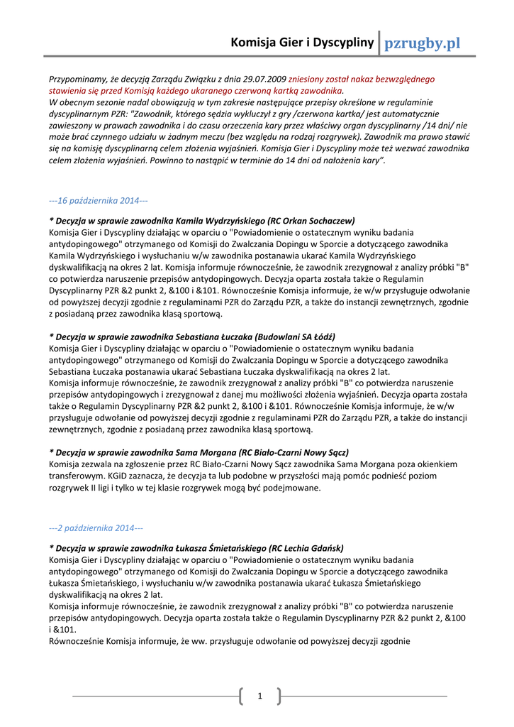 Komisja Gier i Dyscypliny pzrugby.pl Przypominamy, że decyzją Zarządu Związku z dnia 29.07.2009 zniesiony został nakaz bezwzględnego stawienia się przed Komisją każdego ukaranego czerwoną kartką zawodnika. W obecnym sezonie nadal obowiązują w tym zakresie następujące przepisy określone w regulaminie dyscyplinarnym PZR: "Zawodnik, którego sędzia wykluczył z gry /czerwona kartka/ jest automatycznie zawieszony w prawach zawodnika i do czasu orzeczenia kary przez właściwy organ dyscyplinarny /14 dni/ nie może brać czynnego udziału w żadnym meczu (bez względu na rodzaj rozgrywek). Zawodnik ma prawo stawić się na komisję dyscyplinarną celem złożenia wyjaśnień. Komisja Gier i Dyscypliny może też wezwać zawodnika celem złożenia wyjaśnień. Powinno to nastąpić w terminie do 14 dni od nałożenia kary”. ---16 października 2014--* Decyzja w sprawie zawodnika Kamila Wydrzyńskiego (RC Orkan Sochaczew) Komisja Gier i Dyscypliny działając w oparciu o "Powiadomienie o ostatecznym wyniku badania antydopingowego" otrzymanego od Komisji do Zwalczania Dopingu w Sporcie a dotyczącego zawodnika Kamila Wydrzyńskiego i wysłuchaniu w/w zawodnika postanawia ukarać Kamila Wydrzyńskiego dyskwalifikacją na okres 2 lat. Komisja informuje równocześnie, że zawodnik zrezygnował z analizy próbki "B" co potwierdza naruszenie przepisów antydopingowych. Decyzja oparta została także o Regulamin Dyscyplinarny PZR &2 punkt 2, &100 i &101. Równocześnie Komisja informuje, że w/w przysługuje odwołanie od powyższej decyzji zgodnie z regulaminami PZR do Zarządu PZR, a także do instancji zewnętrznych, zgodnie z posiadaną przez zawodnika klasą sportową. * Decyzja w sprawie zawodnika Sebastiana Łuczaka (Budowlani SA Łódź) Komisja Gier i Dyscypliny działając w oparciu o "Powiadomienie o ostatecznym wyniku badania antydopingowego" otrzymanego od Komisji do Zwalczania Dopingu w Sporcie a dotyczącego zawodnika Sebastiana Łuczaka postanawia ukarać Sebastiana Łuczaka dyskwalifikacją na okres 2 lat. Komisja informuje równocześnie, że zawodnik zrezygnował z analizy próbki "B" co potwierdza naruszenie przepisów antydopingowych i zrezygnował z danej mu możliwości złożenia wyjaśnień. Decyzja oparta została także o Regulamin Dyscyplinarny PZR &2 punkt 2, &100 i &101. Równocześnie Komisja informuje, że w/w przysługuje odwołanie od powyższej decyzji zgodnie z regulaminami PZR do Zarządu PZR, a także do instancji zewnętrznych, zgodnie z posiadaną przez zawodnika klasą sportową. * Decyzja w sprawie zawodnika Sama Morgana (RC Biało-Czarni Nowy Sącz) Komisja zezwala na zgłoszenie przez RC Biało-Czarni Nowy Sącz zawodnika Sama Morgana poza okienkiem transferowym. KGiD zaznacza, że decyzja ta lub podobne w przyszłości mają pomóc podnieść poziom rozgrywek II ligi i tylko w tej klasie rozgrywek mogą być podejmowane. ---2 października 2014--* Decyzja w sprawie zawodnika Łukasza Śmietańskiego (RC Lechia Gdańsk) Komisja Gier i Dyscypliny działając w oparciu o "Powiadomienie o ostatecznym wyniku badania antydopingowego" otrzymanego od Komisji do Zwalczania Dopingu w Sporcie a dotyczącego zawodnika Łukasza Śmietańskiego, i wysłuchaniu w/w zawodnika postanawia ukarać Łukasza Śmietańskiego dyskwalifikacją na okres 2 lat. Komisja informuje równocześnie, że zawodnik zrezygnował z analizy próbki "B" co potwierdza naruszenie przepisów antydopingowych. Decyzja oparta została także o Regulamin Dyscyplinarny PZR &2 punkt 2, &100 i &101. Równocześnie Komisja informuje, że ww. przysługuje odwołanie od powyższej decyzji zgodnie 1 Komisja Gier i Dyscypliny pzrugby.pl z regulaminami PZR do Zarządu PZR, a także do instancji zewnętrznych, zgodnie z posiadaną przez zawodnika klasą sportową. * Decyzja w sprawie zawodników wykluczonych definitywnie w meczu II ligi: Chaos Poznań – RC BiałoCzarni Nowy Sącz Komisja po zapoznaniu się z dokumentami meczowymi dotyczącą meczu Chaos Poznań - RC Biało-Czarni Nowy Sącz rozegranego w dniu 21.09.2014, działając na podstawie regulaminów PZR postanawia: 1) ukarać zawodnika Chaosu Poznań Rafała Bartoszewskiego ukaranego czerwoną kartką w w/w meczu odsunięciem od udziału w 2 meczach. 2) ukarać zawodnika RC Biało-Czarni Nowy Sącz Adama Kubisza ukaranego czerwoną kartką w w/w meczu odsunięciem od udziału w 2 meczach. ---29 września 2014--W piątek, 26 września br. Komisja Gier i Dyscypliny podjęła decyzje w poniższych sprawach. * Interpretacja przepisu dotyczącego koniecznych przerw w występach na boisku W związku z pytaniami Klubów, których zawodnicy uczestniczą w turnieju rugby 7 w Monachium, Komisja Gier i Dyscypliny zdecydowała, że przepisy PZR nie regulują w sposób jednoznaczny zachowania 48 godzinnej przerwy pomiędzy końcem turnieju rugby 7, a meczem ligowym w rugby 15-osobowym. Przepis ten dotyczy wyłącznie rugby 15. Tym samym decyzja o ewentualnym udziale w meczu ligowym tych zawodników pozostaje w zakresie odpowiedzialności Klubów i samych graczy. * Decyzja w sprawie zawodnika Dawida Plichty (RC Orkan Sochaczew) Komisja po zapoznaniu się z dokumentami meczowymi (dotyczą meczu Juvenia Kraków - Orkan Sochaczew, 20.09.2014), działając na podstawie regulaminów PZR, postanawia ukarać zawodnika Orkana Sochaczew Dawida Plichtę (ukarany czerwoną kartką w/w meczu) odsunięciem od udziału w 3 meczach. * Decyzja w sprawie zawodnika Dawida Banaszka (RC Arka Gdynia) Komisja po zapoznaniu się z dokumentami meczowymi, materiałami video, wysłuchaniu zawodnika Arki Gdynia Dawida Banaszka, postanawia ukarać w/w odsunięciem od udziału w 4 meczach. Kara jest wynikiem nałożenia na gracza czerwonej kartki w meczu przeciwko Lechii Gdańsk (13.09.2014). * Decyzja w sprawie zawodnika Arkadiusza Zdunka (RC Arka Gdynia) Komisja po zapoznaniu się materiałem video z meczu Arka Gdynia - Lechia Gdańsk (13.09.2014) postanawia ukarać zawo