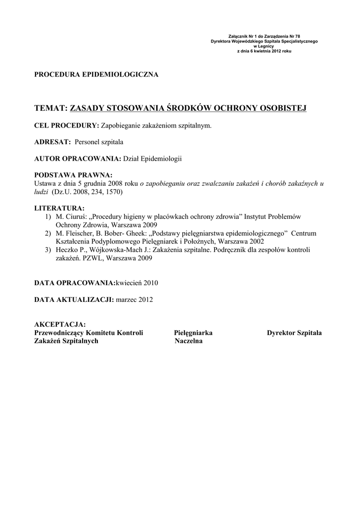 Załącznik Nr 1 do Zarządzenia Nr 78 Dyrektora Wojewódzkiego Szpitala Specjalistycznego w Legnicy z dnia 6 kwietnia 2012 roku PROCEDURA EPIDEMIOLOGICZNA TEMAT: ZASADY STOSOWANIA ŚRODKÓW OCHRONY OSOBISTEJ CEL PROCEDURY: Zapobieganie zakażeniom szpitalnym. ADRESAT: Personel szpitala AUTOR OPRACOWANIA: Dział Epidemiologii PODSTAWA PRAWNA: Ustawa z dnia 5 grudnia 2008 roku o zapobieganiu oraz zwalczaniu zakażeń i chorób zakaźnych u ludzi (Dz.U. 2008, 234, 1570) LITERATURA: 1) M. Ciuruś: „Procedury higieny w placówkach ochrony zdrowia” Instytut Problemów Ochrony Zdrowia, Warszawa 2009 2) M. Fleischer, B. Bober- Gheek: „Podstawy pielęgniarstwa epidemiologicznego” Centrum Kształcenia Podyplomowego Pielęgniarek i Położnych, Warszawa 2002 3) Heczko P., Wójkowska-Mach J.: Zakażenia szpitalne. Podręcznik dla zespołów kontroli zakażeń. PZWL, Warszawa 2009 DATA OPRACOWANIA:kwiecień 2010 DATA AKTUALIZACJI: marzec 2012 AKCEPTACJA: Przewodniczący Komitetu Kontroli Zakażeń Szpitalnych Pielęgniarka Naczelna Dyrektor Szpitala ŚRODKI OCHRONY OSOBISTEJ RĘKAWICZKI: Rękawice ochronne nie zastępują mycia i dezynfekcji rąk! Przed założeniem rękawic i po ich zdjęciu ręce należy umyć/zdezynfekować. 1) jednorazowe jałowe (sterylne) rękawice – stosować zawsze wtedy, gdy przewiduje się kontakt rękawiczki z uszkodzoną tkanką (skórą lub błonami śluzowymi) przy procedurach wykonywanych w warunkach aseptycznych. Przed założeniem, ręce umyć higienicznie lub chirurgicznie. Rękawice po użyciu usuwać do czerwonego worka a ręce umyć/zdezynfekować po zdjęciu rękawic. 2) jednorazowe czyste rękawice – stosowane w trakcie wszystkich zabiegów, w których ma miejsce kontakt z krwią, płynami ustrojowymi, wydalinami i wydzielinami, gdzie występuje ryzyko zakażenia pracownika a aseptyka nie jest konieczna. Po użyciu rękawice usuwać do czerwonego worka ręce umyć/zdezynfekować. Rękawice używane do procedur niskiego ryzyka epidemiologicznego (np: mycie chorego, zmiana pieluchomajtek u chorych bez choroby zakaźnej i bez nosicielstwa drobnoustrojów alarmowych) usuwać do worka przeznaczonego na odpady komunalne, ręce umyć. Rękawice ochronne jednorazowe nakładać przy pacjencie, dla każdego pacjenta używać nowych rękawic, przy procedurach wieloetapowych u tego samego pacjenta: po wykonaniu procedury brudnej, zdjąć rękawice, umyć/zdezynfekować ręce i nałożyć czyste rękawice przed przejściem do czynności czystej. 3) rękawice ochronne wielorazowego użytku – stosować podczas zabiegów dekontaminacji (mycia, dezynfekcji, czyszczenia) otoczenia. Po każdym użyciu rękawice umyć/zdezynfekować/wysuszyć. Zniszczone usuwać do do worka przeznaczonego na odpady komunalne. Po zdjęciu rękawic ręce należy umyć. OCHRONA TWARZY: MASKI – maska zalecana jest gdy istnieje ryzyko przeniesienia czynnika zakaźnego drogą kropelkową. Jeżeli stosuje się maski, powinny one być używane tylko raz i zmieniane, gdy stają się wilgotne lub znacznie skażone. Maski należy zdejmować trzymając za tasiemki, tak aby nie dotykać części zakrywającej twarz, która jest skażona drobnoustrojami. Przy dłuższym użyciu maski chirurgiczne zapewniają niewielką ochronę przed zakażeniami przenoszonymi drogą kropelkową. Po kontakcie z częścią twarzową maski ręce należy umyć/zdezynfekować. OKULARY OCHRONNE – zalecane są przy zabiegach z dużym prawdopodobieństwem rozpryśnięcia krwi lub płynów ustrojowych. Po użyciu okulary należy umyć i wysuszyć. Jeżeli doszło do skażenia materiałem zakaźnym okulary należy poddać dezynfekcji zgodnie z instrukcją. FARTUCHY: ODZIEŻ ROBOCZA - pracowników powinna być utrzymana w należytej czystości, prać w pralni szpitalnej co najmniej 1x w tygodniu i częściej jeżeli zajdzie taka potrzeba. JEDNORAZOWE PAPIEROWE, FOLIOWE, TEKSTYLNE – wiązane do tyłu tak aby strona robocza była ochraniana, zakładać na odzież roboczą podczas zabiegów z dużym prawdopodobieństwem opryskania krwią lub płynami ustrojowymi. PROCEDURA ZASADY STOSOWANIA ŚRODKÓW OCHRONY OSOBISTEJ Potwierdzenie przyjęcia procedury do wiadomości i stosowania: data Imię i nazwisko /litery drukowane/ stanowisko „Przyjęłam/łem do wiadomości i stosowania” - podpis pracownika