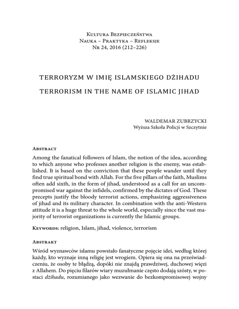 Kultura Bezpieczeństwa Nauka – Praktyka – Refleksje Nr 24, 2016 (212–226) TERRORYZM W IMIĘ ISLAMSKIEGO DŻIHADU TERRORISM IN THE NAME OF ISLAMIC JIHAD Waldemar Zubrzycki Wyższa Szkoła Policji w Szczytnie Abstract Among the fanatical followers of Islam, the notion of the idea, according to which anyone who professes another religion is the enemy, was established. It is based on the conviction that these people wander until they find true spiritual bond with Allah. For the five pillars of the faith, Muslims often add sixth, in the form of jihad, understood as a call for an uncompromised war against the infidels, confirmed by the dictates of God. These precepts justify the bloody terrorist actions, emphasizing aggressiveness of jihad and its military character. In combination with the anti-Western attitude it is a huge threat to the whole world, especially since the vast majority of terrorist organizations is currently the Islamic groups. Keywords: religion, Islam, jihad, violence, terrorism Abstrakt Wśród wyznawców islamu powstało fanatyczne pojęcie idei, według której każdy, kto wyznaje inną religię jest wrogiem. Opiera się ona na przeświadczeniu, że osoby te błądzą, dopóki nie znajdą prawdziwej, duchowej więzi z Allahem. Do pięciu filarów wiary muzułmanie często dodają szósty, w postaci dżihadu, rozumianego jako wezwanie do bezkompromisowej wojny TERRORYZM W IMIĘ ISLAMSKIEGO DŻIHADU • 213 z niewiernymi, potwierdzone nakazami Boga. Te właśnie nakazy usprawiedliwiają krwawe działania terrorystów, podkreślając agresywność dżihadu i jego militarny charakter. W połączeniu z antyzachodnią postawą stanowi on ogromne zagrożenie dla całego świata, zwłaszcza, że znakomita większość organizacji terrorystycznych to aktualnie ugrupowania islamskie. Słowa kluczowe: religia, islam, dżihad, przemoc, terroryzm. Wstęp Islam narodził się w VI wieku na półwyspie arabskim. Spośród innych religii wyróżnia się tym, że obok nakazów ściśle religijnych, zawiera normy moralne i normy prawne stanowiące podstawę organizacji wszystkich aspektów życia muzułmanów – społecznego, gospodarczego i politycznego. Święta Księga Koranu zawiera m.in. przykazania dotyczące etyki życia. Jedno z nich mówi o prawie odwetu (oko za oko, ząb za ząb) i śmierci dla niewiernych. Wśród wyznawców islamu powstało fanatyczne pojęcie idei, według której każdy, kto wyznaje inną religię jest wrogiem. Opiera się ona na przeświadczeniu, które dzieli ludzi na tych posiadających monopol na prawdę i na tych, którzy błądzą, nie mając prawdziwej, duchowej więzi z Allahem. Ci, którzy potrafią odczytać tę jedyną prawdę są prawdziwymi wiernymi, a cała reszta to zagrożenie1. W imię tej fanatycznej teorii zrodził się specyficzny rodzaj terroryzmu, którego sprawcy działają na rzecz ekspansji swojej religii i eliminowania niewiernych, postępując – w swoim przekonaniu – zgodnie z prawami Koranu. Wyraża się on w dążeniu do spełnienia posłanniczej rzekomo misji, wskazanej przez Boga, zmierzającej do wprowadzenia – przy użyciu siły – prawa opartego na dogmatach własnej religii. W ten sposób terroryzm nabiera wymiaru transcendentalnego, a jego sprawców nie obowiązują żadne polityczne, moralne czy praktyczne ograniczenia. Liczy się dla nich tylko boski nakaz i nieograniczona żądza jego spełnienia oraz akceptacja wśród współwyznawców2. Podstawę wiary w islamie stanowi pięć dogmatów: wiara w jednego Boga, wiara w anioły i szatana, wiara w święte pisma (Tora, Ewangelia, Koran), wiara w wysłanników Boga – od Adama do Mahometa oraz wiara M. Madej, Międzynarodowy terroryzm polityczny, Ministerstwo Spraw Zagranicznych, Warszawa 2001, s. 24. 2 Ibidem, s. 23. 1 214 • Waldemar Zubrzycki w dzień Sądu Ostatecznego3. Wyznający je muzułmanin podporządkować się musi pięciu podstawowym obowiązkom, zwanych także filarami wiary. Należą do nich: wyznanie wiary w jednego Boga – szahada, modlitwa – salat, post – saum, jałmużna – zakat i pielgrzymka – hadżdż4. Niekiedy dodaje się do nich szósty – dżihad, przez wielu rozumiany jako wezwanie do bezkompromisowej wojny z niewiernymi, potwierdzone nakazami Boga. Według Hassana Ali Jamsheera5, dżihad jest jedną z ważniejszych kategorii myśli politycznej islamu, według niektórych interpretatorów tej religii głównym filarem tej wiary6. Dżihad – narzędzie w rękach fundamentalistów islamskich Dżihad (święta wojna w islamie) jest obecnie, podobnie jak fundamentalizm islamski, źle rozumiany i przeważnie negatywnie odbierany przez państwa zachodnie. Spowodowane jest to głównie przez światowe media, które jednoznacznie interpretują dżihad jako wojnę religijną, kojarzoną wyłącznie ze złem, brutalnością i agresją. Według Janusza Daneckiego7, polskiego arabisty, jest to najbardziej zawiły i źle tłumaczony termin w cywilizacji europejskiej. Podobnego zdania jest Seyyed Hossein Nasr8 – szyita, który również uważa, że słowo to jest niewłaściwie pojmowane. Niektórzy badacze uznają dżihad tylko za zbrojną walkę z niewiernymi i próbę szerzenia islamu, nadając mu militarny charakter. Z kolei inni uważają, że jest to duchowa walka z samym sobą, aby stać się lepszym. Zgadzają się oni z koranicznym określeniem pojęcia jako dążenie ścieżką Boga (fi safil Allah), dążenia w sensie duchowym. Słowo to, w aspekcie historycznym, różnie było tłumaczone. Termin dżihad jest rzeczownikiem odsłownym od słowa gahada i oznacza dokładanie starań, podejmowanie wysiłku, wysilanie się9. Miała to być swoista walka z własnymi słabościami, wewnętrzna walka z samym sobą. Począt J. Bury, J. Kasprzak, Prawo karne islamu, Wydawnictwo Difin, Warszawa 2007, s. 49. S. Wit-Witkowski, Wprowadzenie do prawa muzułmańskiego: wybrane instytucje; Fundacja Promocji Prawa Europejskiego, Warszawa