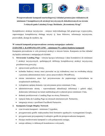 Przeprowadzenie kampanii marketingowej i działań promocyjno-reklamowych minimum 3 kompleksowych atrakcji turystycznych zlokalizowanych na terenie 3 różnych gmin Lokalnej Grupy Działania „Krzemienny Krąg” Kompleksowe atrakcje turystyczne – miejsce indywidualnego lub grupowego wypoczynku, zapewniające kompleksową obsługę turysty tj. kasa biletowa, informacja turystyczna, przewodnik, dostęp do mediów, itp. W ramach kampanii przeprowadzone zostaną następujące zadania: ZADANIE 1. KAMPANIA ON LINE - minimum 5% całości budżetu kampanii Kampania prowadzona w celu promocji atrakcji w okresie letnim. Kampania on-line składać się będzie minimum z następujących działań: 1. Stworzenie Landing Page - witryna łącząca informacje i dane kontaktowe do minimum 3 atrakcji turystycznych, spełniających definicję kompleksowej atrakcji turystycznej przedstawioną powyżej: opracowanie graficzne strony, technika budowy strony musi pozwalać na jej rozbudowę oraz na swobodną edycję z poziomu administratora treści przez pracowników (WordPress), strona internetowa musi być przystosowana do poprawnego wyświetlania na urządzeniach mobilnych, wykupienie spójnej domeny i jej utrzymanie przez minimum 2 lata, administrowanie stroną - wprowadzanie aktualizacji informacji i galerii zdjęć, dodawanie informacji na temat nadchodzących wydarzeń przez minimum 2 lata, 2. dodanie przekierowań z Landing Page na strony Partnerów, wpięcie linka do Landing Page na stronach internetowych Partnerów, integracja strony z profilami FaceBook Partnerów. Kampania Google Display Network czas trwania kampanii - minimum 2 tygodnie, przygotowanie grafik: maksymalna ilość formatów zgodnych z wymaganiami Google, przygotowanie przynajmniej 6 rodzajów grafik do przeprowadzenia kampanii, bieżące moderowanie kampanii w celu polepszenia zasięgu, emisja reklamy w dobranych kontekstowo witrynach, targetowanie kampanii na minimum 5 województw: województwo świętokrzyskie, mazowieckie, łódzkie, lubelskie i małopolskie, przygotowanie raportu działań po zakończeniu kampanii. 3. Mailing minimum dwa e-mailingi do bazy minimum 30 tys. adresów - z przedstawieniem oferty atrakcji, przygotowanie raportu z wysyłki e-maili. 4. Google Search czas trwania kampanii - minimum 2 tygodnie, reklama - linki sponsorowane po frazach związanych z tematyką turystyki rodzinnej, parki rozrywki, parki dinozaurów, 5. optymalizacja działań pod najlepiej konwertujące frazy, przygotowanie raportu działań po zakończeniu kampanii. Retargeting Display czas trwania kampanii - minimum 2 tygodnie, dotarcie do użytkowników strony www atrakcji objętych kampanią (m.in. 1 atrakcja), którzy ją odwiedzili i opuścili, 6. dotarcie do użytkowników, którzy odwiedzili Landing Page i ją opuścili. Działania w Social Media FaceBook stworzenie grafik spójnych dla minimum 3 atrakcji turystycznych, spełniających definicję kompleksowej atrakcji turystycznej przedstawioną powyżej, stworzenie grafik dedykowanych dla minimum 1 atrakcji, budowanie pozytywnego wizerunku minimum 3 atrakcji poprzez dodawanie postów - przynajmniej 1 tygodniowo na każdym z profili atrakcji / obiektów (treści, zdjęcia, organizacja konkursów) przez okres minimum 2 miesięcy, pozyskiwanie nowych fanów, budowanie zasięgu poprzez sponsorowanie postów, promocja treści atrakcji, targetowanie reklam na FaceBooku (geotargetowanie na minimum 5 województw: mazowieckie, świętokrzyskie, lubelskie, łódzkie, małopolskie; min. osoby w wieku od 25 - 45 lat kobiety i mężczyźni). ZADANIE 2. KAMPANIA ON LINE - minimum 5% całości budżetu kampanii Kampania prowadzona w celu promocji atrakcji w okresie zimowym: Kampania on-line składać się będzie minimum z następujących działań: 1. Kampania Google Display Network czas trwania kampanii - minimum 2 tygodnie, przygotowanie grafik - maksymalna ilość formatów zgodnych z wymaganiami Google, przygotowanie przynajmniej 6 rodzajów grafik potrzebnych do przeprowadzenia kampanii, targetowanie reklam na minimum 3 województwa: świętokrzyskie, lubelskie, mazowieckie, bieżące moderowane kampanii w celu polepszenia zasięgu, emisja reklamy w dobranych kontekstowo witrynach, przygotowanie raportu działań po zakończeniu kampanii. 2. Mailing minimum dwa e-mailingi do bazy minimum 30 tys. adresów - z przedstawieniem oferty atrakcji, 3. przygotowanie raportu z wysyłki e-maili. Google Search czas trwania kampanii minimum 2 tygodnie, reklama - linki sponsorowane po frazach związanych z tematyką zimowego wypoczynku, nart, ferii rodzinnych, optymalizacja działań pod najlepiej konwertujące frazy, przygotowanie raportu działań po zakończeniu kampanii. 4. Retargeting Display czas trwania kampanii minimum 2 tygodnie, dotarcie do użytkowników strony www atrakcji objętych kampanią (m.in. 1 atrakcja) przygotowanie raportu działań po zakończeniu min. kampanii. Działania w Social Media 5. FaceBook stworzenie grafik dla minimum 1 atrakcji służącej do promocji, stworzenie reklamy karuzelowej minimum 1 atrakcji, FaceBook Display, faceBook Remarketing, budowanie pozytywnego wizerunku minimum 1 atrakcji poprzez dodawanie postów - przynajmniej 1 tygodniowo na każdym z profili minimum 3 atrakcji (treści, zdjęcia, organizacja konkursów), pozyskiwanie nowych fanów poprzez sponsorowanie postów, promocja treści, targetowanie reklam na FaceBooku. ZADANIE 3. KAMPANIA W TELEWIZJI O ZASIĘGU OGÓLNOPOLSKIM – minimum 35% całości budżetu kampanii Kampania składać się będzie minimum z następujących działań: 1. Przygotowanie scenariusza billboardu sponsorskiego 8". 2. Produkcja billboardu sponsorskiego 8", z przeznaczeniem do emisji w telewizji ogólnopolskiej, regionalnej oraz w Internecie, 3. Przygotowanie scenariusza spotu 30", 4. Produkcja spotu 30" z przeznaczeniem do emisji w Internecie, 5. Emisja billboardu sponsorskiego w telewizji ogólnopolskiej w ilości nie mniej