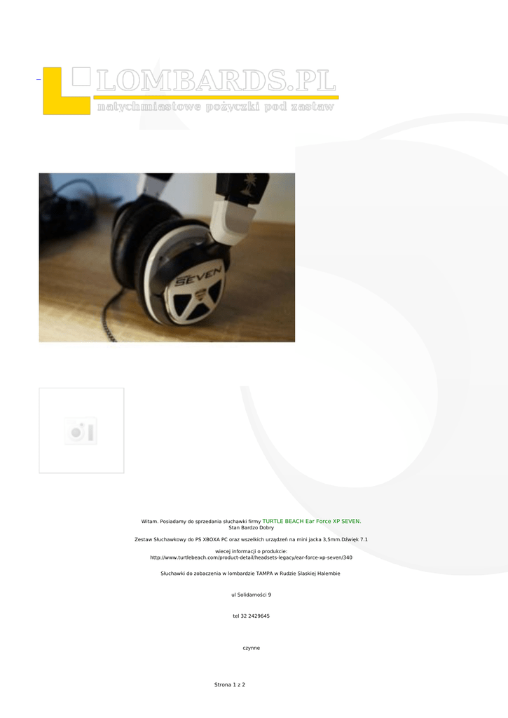 Witam. Posiadamy do sprzedania słuchawki firmy TURTLE BEACH Ear Force XP SEVEN. Stan Bardzo Dobry Zestaw Słuchawkowy do PS XBOXA PC oraz wszelkich urządzeń na mini jacka 3,5mm.Dźwięk 7.1 wiecej informacji o produkcie: http://www.turtlebeach.com/product-detail/headsets-legacy/ear-force-xp-seven/340 Słuchawki do zobaczenia w lombardzie TAMPA w Rudzie Slaskiej Halembie ul Solidarności 9 tel 32 2429645 czynne Strona 1 z 2 pn-pt 8.00 -18.00 sobota 8.00-14.00 możliwość wystawienia Faktury VAT-MARŻA Zapraszamy Strona 2 z 2