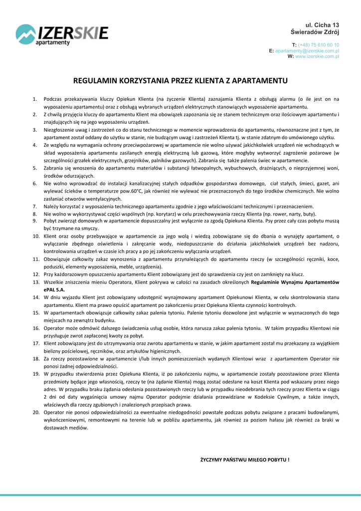 ul. Cicha 13 Świeradów Zdrój T: (+48) 75 610 60 10 E: [email protected] W: www.izerskie.com.pl REGULAMIN KORZYSTANIA PRZEZ KLIENTA Z APARTAMENTU 1. 2. 3. 4. 5. 6. 7. 8. 9. 10. 11. 12. 13. 14. 15. 16. 17. 18. 19. 20. Podczas przekazywania kluczy Opiekun Klienta (na życzenie Klienta) zaznajamia Klienta z obsługą alarmu (o ile jest on na wyposażeniu apartamentu) oraz z obsługą wybranych urządzeń elektrycznych stanowiących wyposażenie apartamentu. Z chwilą przyjęcia kluczy do apartamentu Klient ma obowiązek zapoznania się ze stanem technicznym oraz ilościowym apartamentu i znajdujących się na jego wyposażeniu urządzeń. Niezgłoszenie uwag i zastrzeżeń co do stanu technicznego w momencie wprowadzenia do apartamentu, równoznaczne jest z tym, że apartament został oddany do użytku w stanie, nie budzącym uwag i zastrzeżeń Klienta tj. w stanie zdatnym do umówionego użytku. Ze względu na wymagania ochrony przeciwpożarowej w apartamencie nie wolno używać jakichkolwiek urządzeń nie wchodzących w skład wyposażenia apartamentu zasilanych energią elektryczną lub gazową, które mogłyby wytworzyć zagrożenie pożarowe (w szczególności grzałek elektrycznych, grzejników, palników gazowych). Zabrania się także palenia świec w apartamencie. Zabrania się wnoszenia do apartamentu materiałów i substancji łatwopalnych, wybuchowych, drażniących, o nieprzyjemnej woni, środków odurzających. Nie wolno wprowadzać do instalacji kanalizacyjnej stałych odpadków gospodarstwa domowego, ciał stałych, śmieci, gazet, ani wylewać ścieków o temperaturze pow.60°C, jak również nie wylewać nie przeznaczonych do tego środków chemicznych. Nie wolno zasłaniać otworów wentylacyjnych. Należy korzystać z wyposażenia technicznego apartamentu zgodnie z jego właściwościami technicznymi i przeznaczeniem. Nie wolno w wykorzystywać części wspólnych (np. korytarz) w celu przechowywania rzeczy Klienta (np. rower, narty, buty). Pobyt zwierząt domowych w apartamencie dopuszczalny jest wyłącznie za zgodą Opiekuna Klienta. Psy przez cały czas pobytu muszą być trzymane na smyczy. Klient oraz osoby przebywające w apartamencie za jego wolą i wiedzą zobowiązane się do dbania o wynajęty apartament, o wyłączanie zbędnego oświetlenia i zakręcanie wody, niedopuszczanie do działania jakichkolwiek urządzeń bez nadzoru, kontrolowania urządzeń w czasie ich pracy a po jej zakończeniu wyłączania urządzeń. Obowiązuje całkowity zakaz wynoszenia z apartamentu przynależących do apartamentu rzeczy (w szczególności ręczniki, koce, poduszki, elementy wyposażenia, meble, urządzenia). Przy każdorazowym opuszczeniu apartamentu Klient zobowiązany jest do sprawdzenia czy jest on zamknięty na klucz. Wszelkie zniszczenia mieniu Operatora, Klient pokrywa w całości na zasadach określonych Regulaminie Wynajmu Apartamentów ePAL S.A. W dniu wyjazdu Klient jest zobowiązany udostępnić wynajmowany apartament Opiekunowi Klienta, w celu skontrolowania stanu apartamentu. Klient ma prawo opuścić apartament po zakończeniu przez Opiekuna Klienta czynności kontrolnych. W apartamentach obowiązuje całkowity zakaz palenia tytoniu. Palenie tytoniu dozwolone jest wyłącznie w wyznaczonych do tego miejscach na zewnątrz budynku. Operator może odmówić dalszego świadczenia usług osobie, która narusza zakaz palenia tytoniu. W takim przypadku Klientowi nie przysługuje zwrot zapłaconej kwoty za pobyt. Klient zobowiązany jest do utrzymywania oraz zwrotu apartamentu w stanie, w jakim apartament został mu przekazany za wyjątkiem bielizny pościelowej, ręczników, oraz artykułów higienicznych. Za rzeczy pozostawione w apartamencie i/lub innych pomieszczeniach wydanych Klientowi wraz z apartamentem Operator nie ponosi żadnej odpowiedzialności. W przypadku stwierdzenia przez Opiekuna Klienta, iż po zakończeniu najmu, w apartamencie zostały pozostawione przez Klienta przedmioty będące jego własnością, rzeczy te (na żądanie Klienta) mogą zostać odesłane na koszt Klienta pod wskazany przez niego adres. W przypadku braku żądania odesłania pozostawionych rzeczy lub w przypadku nieodebrania tych rzeczy przez Klienta w ciągu 2 dni od daty wygaśnięcia umowy najmu Operator podejmie działania przewidziane w Kodeksie Cywilnym, a także innych, właściwych dla rzeczy zgubionych i znalezionych przepisach prawa. Operator nie ponosi odpowiedzialności za ewentualne niedogodności powstałe podczas pobytu związane z pracami budowlanymi, wykończeniowymi, remontowymi na terenie lub w pobliżu apartamentu, jak również za poziom hałasu jak również za braki w dostawach mediów. ŻYCZYMY PAŃSTWU MIŁEGO POBYTU !