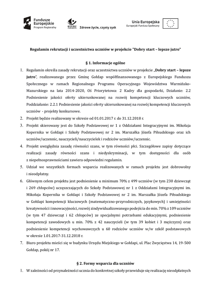 Regulamin rekrutacji i uczestnictwa uczniów w projekcie "Dobry start – lepsze jutro" § 1. Informacje ogólne 1. Regulamin określa zasady rekrutacji oraz uczestnictwa uczniów w projekcie „Dobry start – lepsze jutro”, realizowanego przez Gminę Gołdap współfinansowanego z Europejskiego Funduszu Społecznego w ramach Regionalnego Programu Operacyjnego Województwa WarmińskoMazurskiego na lata 2014-2020, Oś Priorytetowa: 2 Kadry dla gospodarki, Działanie: 2.2 Podniesienie jakości oferty ukierunkowanej na rozwój kompetencji kluczowych uczniów, Poddziałanie: 2.2.1 Podniesienie jakości oferty ukierunkowanej na rozwój kompetencji kluczowych uczniów - projekty konkursowe. 2. Projekt będzie realizowany w okresie od 01.01.2017 r. do 31.12.2018 r. 3. Projekt skierowany jest do Szkoły Podstawowej nr 1 z Oddziałami Integracyjnymi im. Mikołaja Kopernika w Gołdapi i Szkoły Podstawowej nr 2 im. Marszałka Józefa Piłsudskiego oraz ich uczniów/uczennic, nauczycieli/nauczycielek i rodziców uczniów/uczennic. 4. Projekt uwzględnia zasadę równości szans, w tym równości płci. Szczegółowe zapisy dotyczące realizacji zasady równości szans i niedyskryminacji, w tym dostępności dla osób z niepełnosprawnościami zawiera odpowiedni regulamin. 5. Udział we wszystkich formach wsparcia realizowanych w ramach projektu jest dobrowolny i nieodpłatny. 6. Głównym celem projektu jest podniesienie u minimum 70% z 499 uczniów (w tym 230 dziewcząt i 269 chłopców) uczęszczających do Szkoły Podstawowej nr 1 z Oddziałami Integracyjnymi im. Mikołaja Kopernika w Gołdapi i Szkoły Podstawowej nr 2 im. Marszałka Józefa Piłsudskiego w Gołdapi kompetencji kluczowych (matematyczno-przyrodniczych, językowych) i umiejętności kreatywności i innowacyjności, rozwój zindywidualizowanego podejścia do min. 70% z 109 uczniów (w tym 47 dziewcząt i 62 chłopców) ze specjalnymi potrzebami edukacyjnymi, podniesienie kompetencji zawodowych u min. 70% z 42 nauczycieli (w tym 39 kobiet i 3 mężczyzn) oraz podniesienie kompetencji wychowawczych u 60 rodziców uczniów w/w szkół podstawowych w okresie 1.01.2017-31.12.2018 r. 7. Biuro projektu mieści się w budynku Urzędu Miejskiego w Gołdapi, ul. Plac Zwycięstwa 14, 19-500 Gołdap, pokój nr 17. § 2. Formy wsparcia dla uczniów 1. W zależności od przynależności ucznia do konkretnej szkoły przewiduje się realizację nieodpłatnych zajęć dodatkowych dla uczniów wymienionych poniżej: 1) zajęcia mające na celu podnoszenie kompetencji kluczowych oraz właściwych umiejętności na rynku pracy u 376 uczniów (w tym 173 dziewcząt i 203 chłopców) w Szkole Podstawowej nr 1: a) zajęcia przyrodniczo-ekologiczne "To mi się przyda" w wymiarze 20 godzin dydaktycznych w semestrze szkolnym dla 14 uczniów klas I-VI, b) zajęcia z przedsiębiorczości z wykorzystaniem metod projektu innowacyjnego "DiAMEnT – Dostrzec i Aktywizować Możliwości, Energię, Talent" w wymiarze 20 godzin dydaktycznych w semestrze szkolnym dla 16 uczniów klas IV-VI, c) zajęcia rozwijające myślenie matematyczne "Wesoła matematyka" w wymiarze 20 godzin w semestrze szkolnym dla 17 uczniów klas I-VI, d) zajęcia "Interaktywni matematycy" w wymiarze 20 godzin dydaktycznych w semestrze szkolnym dla 8 uczniów klas I-VI, e) zajęcia "Szkolne Studio Nagrań" w wymiarze 30 godzin dydaktycznych w semestrze szkolnym dla 20 uczniów klas I-VI, f) zajęcia z języka angielskiego w wymiarze 60 godzin dydaktycznych w semestrze szkolnym dla 28 uczniów klas I-VI, g) zajęcia "Trening kreatywności w wymiarze 20 godzin dydaktycznych w semestrze szkolnym dla 14 uczniów, 2) zajęcia mające na celu podnoszenie kompetencji kluczowych oraz właściwych umiejętności na rynku pracy u 122 uczniów (w tym 57 dziewcząt i 66 chłopców) w Szkole Podstawowej nr 2: a) zajęcia przyrodniczo-ekologiczne "To mi się przyda" w wymiarze 20 godzin dydaktycznych w semestrze szkolnym dla 14 uczniów klas I-VI, b) zajęcia z przedsiębiorczości z wykorzystaniem metod projektu innowacyjnego "DiAMEnT – Dostrzec i Aktywizować Możliwości, Energię, Talent" w wymiarze 20 godzin dydaktycznych w semestrze szkolnym dla 16 uczniów klas IV-VI, c) zajęcia matematyczne z wykorzystaniem klocków LEGO w wymiarze 20 godzin dydaktycznych w semestrze szkolnym dla 14 uczniów klas I-VI, d) zajęcia "Akademia Chemika" w wymiarze 20 godzin dydaktycznych w semestrze szkolnym dla 14 uczniów klas I-VI, e) zajęcia z języka angielskiego w wymiarze 60 godzin dydaktycznych w semestrze szkolnym dla 24 uczniów klas I-VI, f) zajęcia "Trening kreatywności w wymiarze 20 godzin dydaktycznych w semestrze szkolnym dla 14 uczniów, 3) zajęcia specjalistyczne indywidualne i grupowe dla 109 uczniów (w tym 47 dziewcząt i 62 chłopców) ze specjalnymi potrzebami edukacyjnymi: a) w Szkole Podstawowej nr 1: - zajęcia z psychologiem, - zajęcia z pedagogiem, - zajęcia z logopedą, - zajęcia z tyflopedagogiem, - zajęcia dydaktyczno-wyrównawcze z języka polskiego, języka angielskiego i matematyki, - zajęcia z gimnastyki korekcyjnej, - zajęcia z socjoterapii, - zajęcia z wczesnego wspomagania, - zajęcia z terapii SI, b) w Szkole Podstawowej nr 2: - zajęcia z psychologiem, - zajęcia z pedagogiem, - zajęcia z logopedą, - zajęcia dydaktyczno-wyrównawcze z języka polskiego, języka angielskiego i matematyki, - zajęcia biofeedback. 2. W ramach niżej wymienionych zajęć przewiduje się wyjazdy edukacyjne: 1) zajęcia przyrodniczo-ekologiczne "To mi się przyda" – wyjazd edukacyjny do Parku Krajobrazowego Puszczy Rominckiej, wyjazd edukacyjny do sortowni odpadów w Ełku, wyjazd edukacyjny do oczyszczalni ścieków w Kośmidrach, 2) zajęcia przedsiębiorczości z wykorzystaniem metod projektu innowacyjnego "DiAMEnT – Dostrzec i Aktywizować Możliwości, Energię, Talent" – wyjazd edukacyjny do Warszawy, 3) zajęcia "Szkolne Studio Nagrań" – wyjazd edukacyjny do Wrocławia