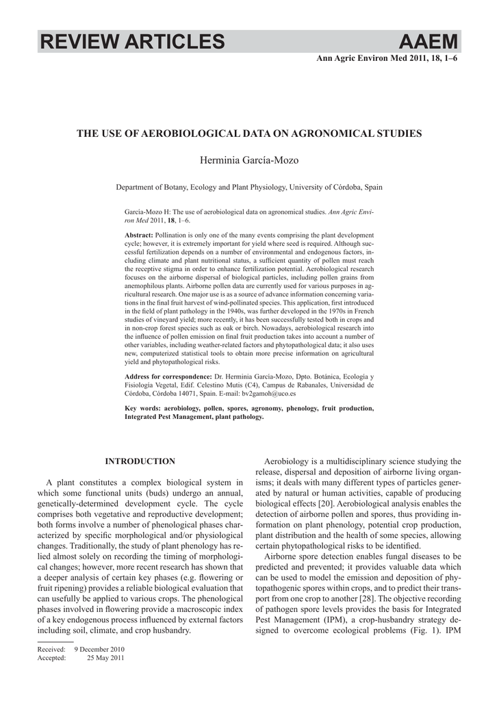 REVIEW ARTICLES AAEM Ann Agric Environ Med 2011, 18, 1–6 THE USE OF AEROBIOLOGICAL DATA ON AGRONOMICAL STUDIES Herminia García-Mozo Department of Botany, Ecology and Plant Physiology, University of Córdoba, Spain García-Mozo H: The use of aerobiological data on agronomical studies. Ann Agric Environ Med 2011, 18, 1–6. Abstract: Pollination is only one of the many events comprising the plant development cycle; however, it is extremely important for yield where seed is required. Although successful fertilization depends on a number of environmental and endogenous factors, including climate and plant nutritional status, a sufficient quantity of pollen must reach the receptive stigma in order to enhance fertilization potential. Aerobiological research focuses on the airborne dispersal of biological particles, including pollen grains from anemophilous plants. Airborne pollen data are currently used for various purposes in agricultural research. One major use is as a source of advance information concerning variations in the final fruit harvest of wind-pollinated species. This application, first introduced in the field of plant pathology in the 1940s, was further developed in the 1970s in French studies of vineyard yield; more recently, it has been successfully tested both in crops and in non-crop forest species such as oak or birch. Nowadays, aerobiological research into the influence of pollen emission on final fruit production takes into account a number of other variables, including weather-related factors and phytopathological data; it also uses new, computerized statistical tools to obtain more precise information on agricultural yield and phytopathological risks. Address for correspondence: Dr. Herminia García-Mozo, Dpto. Botánica, Ecología y Fisiología Vegetal, Edif. Celestino Mutis (C4), Campus de Rabanales, Universidad de Córdoba, Córdoba 14071, Spain. E-mail: [email protected] Key words: aerobiology, pollen, spores, agronomy, phenology, fruit production, Integrated Pest Management, plant pathology. INTRODUCTION A plant constitutes a complex biological system in which some functional units (buds) undergo an annual, genetically-determined development cycle. The cycle comprises both vegetative and reproductive development; both forms involve a number of phenological phases characterized by specific morphological and/or physiological changes. Traditionally, the study of plant phenology has relied almost solely on recording the timing of morphological changes; however, more recent research has shown that a deeper analysis of certain key phases (e.g. flowering or fruit ripening) provides a reliable biological evaluation that can usefully be applied to various crops. The phenological phases involved in flowering provide a macroscopic index of a key endogenous process influenced by external factors including soil, climate, and crop husbandry. Received: Accepted: 9 December 2010 25 May 2011 Aerobiology is a multidisciplinary science studying the release, dispersal and deposition of airborne living organisms; it deals with many different types of particles generated by natural or human activities, capable of producing biological effects [20]. Aerobiological analysis enables the detection of airborne pollen and spores, thus providing information on plant phenology, potential crop production, plant distribution and the health of some species, allowing certain phytopathological risks to be identified. Airborne spore detection enables fungal diseases to be predicted and prevented; it provides valuable data which can be used to model the emission and deposition of phytopathogenic spores within crops, and to predict their transport from one crop to another [28]. The objective recording of pathogen spore levels provides the basis for Integrated Pest Management (IPM), a crop-husbandry strategy designed to overcome ecological problems (Fig. 1). IPM 2 García-Mozo H Monitoring Evaluation and decisions Record keeping Thresholds INTEGRATED PEST MANAGEMENT Meteorological forecasting Biological control Soil preparation Chemical control Figure 1. Integrated Pest Management Scheme. is a sustainable method of managing pests by combining biological, cultural, physical and chemical tools in a way that minimizes economic, health and environmental risks. These new methods must be implemented in three stages: prevention, observation, and intervention. The main goal is to eliminate or significantly reduce pesticide use while at the same time maintaining pest populations at acceptable levels. Recent studies using Aerobiology Modeling System (AMS) simulations in conjunction with meteorological information have provided the basis for communications and alerts from plant pathologists to farmers. Another major application of aerobiological data in agricultural research is the forecasting of crop production on the basis of airborne pollen data. Pollination is only one of the many events taking place in the plant development cycle; however, it is extremely important for yield where seed is required. Although successful fertilization depends on a number of environmental and endogenous factors, including climate and plant nutritional status, a sufficient quantity of pollen must reach the receptive stigma in order to enhance fertilization potential [28]. Moreover, in anemophilous plants a larger number of pollen grains are required to ensure pollination. Even at a distance of hundreds of kilometers, pollen incidence may be sufficient to effect at least some fertilization [22]. Long-distance pollen dispersal is of great importance for pollination and seed-setting in isolated specimens, and also for the long-distance transport of genes [22]. Wind pollination involves an indiscriminate, inefficient dispersal mechanism, and requires very large amounts of pollen in order to ensure proper pollination in many crops [28]. If a stigmatic surface measures 1 mm2, then 1 million pollen grains distributed evenly over an area