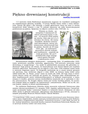 Artykuł ukazał się w miesięczniku Polskiej Izby Inżynierów Budownictwa „INŻYNIER BUDOWNICTWA” nr 9/2008 Piękno drewnianej konstrukcji Andrzej Jarczewski 111-metrowa wieża Radiostacji niezmiennie wygrywa we wszelkich rankingach na najpiękniejszą gliwicką modelkę. 73-letnią Wielką Damę widać z wielu kilometrów, pozuje dla gazet i dla telewizji, a każdy gliwiczanin stara się mieć w swoim komputerze fotkę właśnie z nią! Tu jednak zajmiemy się tylko konstrukcyjnymi podstawami jej piękna. Spójrzmy na zdjęcie z jesieni roku 1935 (fot. 1). Fot. 1 Trójnóg Właśnie za chwilę – po niespełna 5 miesiącach od wbicia pierwszej łopaty w ziemię – na szczycie wieży pojawi się wiecha. Dziś nikt mi w te 5 miesięcy nie wierzy. Ale mamy świadków. Budowie towarzyszyli dziennikarze, którzy systematycznie odnotowywali każdy postęp. Zaczęło się 20 maja 1935, gdy – po wykonaniu pierwszych metrów wykopu pod fundamenty – pojawiła się woda gruntowa. Ale już 9 października (tego samego roku!) gazety donosiły o zakończeniu robót. Fot. 2 Niesamowitym zbiegiem okoliczności – następnego dnia, 10 października 1935, trąba powietrzna powaliła nowiutką, gigantyczną, 160-metrową antenową wieżę drewnianą w Langenbergu1. Czy miało to jakiekolwiek znaczenie dla gliwickiej radiostacji? Tego jeszcze nie wiemy, bo koincydencja tych dwóch faktów jest zupełnie świeżym odkryciem. Natomiast już na zdjęciu z lata roku 1936 widzimy naszą wieżę w znacznie bogatszej szacie. Ta fotografia zachowała się w stanie jeszcze gorszym niż pierwsza, więc wybieram zdjęcie z roku 2008, na którym lepiej widać nowy układ belek (fot. 2). Pisząc „nowy” mam na myśli rok 1936. Od tego czasu w drewnianej tkance wieży nie zmieniło się prawie nic. Przybyło tylko siedemdziesiąt siedem współczesnych anten telekomunikacyjnych (z belkami wsporczymi), a stara, wisząca w środku, pionowa antena średniofalowa zamieniła się w najwyższy w okolicy piorunochron. Na drugim zdjęciu wieża jest trochę bardziej pękata, bo musiałem podejść bliżej ze względu na zadrzewienie i zabudowania. Widać też na 80. metrze podest, dodany w latach sześćdziesiątych. Do niedawna Radiostacja Gliwicka miała znaczenie wyłącznie historyczne jako miejsce słynnej prowokacji z 31 sierpnia 1939. Aspekty radiotechniczne i konstrukcyjne zaczynamy badać i poznawać dopiero w ostatnich latach. Zwłaszcza od roku 2005, kiedy to gliwicki samorząd, odkupiwszy całą Radiostację o TP SA, otworzył tu zalążek przyszłego Muzeum Historii Radia i Sztuki Mediów. 1 O Langenbergu i kilku innych wielkich konstrukcjach drewnianych pisze Katarzyna Adamczyk w pracy magisterskiej „Analiza statyczno-wytrzymałościowa drewnianej wieży Radiostacji Gliwickiej z uwzględnieniem imperfekcji”. Promotorem tej pracy, z roku 2006, jest prof. dr inż. Andrzej Ajdukiewicz, kierownik Katedry Inżynierii Budowlanej Politechniki Śląskiej, która sprawuje naukowy nadzór nad naszą wieżą. Tak więc o samej przebudowie nic jeszcze nie wiemy. Widzimy tylko skutki: na trzech dolnych piętrach, czyli do połowy wysokości wieży, pojawiły się rygle, które lepiej widać na trzecim zdjęciu, zrobionym spod samej wieży. Oryginalna konstrukcja zachowała się w górnej partii, widocznej na zdjęciu 4. Fot. 3 Fot. 4 U samej góry widzimy maszt piorunochronu i cztery sześciometrowe belki z odciągami, pod którymi kiedyś wisiało tzw. sztuczne przedłużenie, dodające antenie ok. 20 metrów, co było ważne ze względów radiotechnicznych (antena półfalowa, optymalna). Widać też w środku dwie drabiny, które jednak nie są aż tak przyjazne dla wspinacza, jak na to wyglądają. Przekrój poziomy jest w każdym punkcie kwadratem, natomiast obwiednią przekroju pionowego jest parabola o równaniu x = 0,0007192z2 – 0,1585z +10 przy czym z – to wysokość w metrach, a x – odległość krzywej w prawo od środka przekroju pionowego, prowadzonego równolegle do odpowiednich krawędzi przekroju poziomego. Na razie wszystko to wygląda ładnie i zrozumiale. Matematyków, inżynierów mechaników i statyków pytam jednak zawsze, gdzie jest ekstremum tej funkcji. I tu najpierw lekka konsternacja, a po chwili olśnienie. Tak! Właśnie tam! Równanie jest oczywiście pewnym przybliżeniem, na podstawie 200-punktowych pomiarów, wykonanych przez firmę Precyzja z Katowic. Rozstaw nóg tylko w przybliżeniu wynosi 20 metrów. W istocie każda noga stoi trochę inaczej względem teoretycznego środka. Przyjąłem 10 do równania, żeby na 110 metrze zbliżyć się do długości boku najwyższego podestu: 2,53 m. Na tym podeście stoi jeszcze półtorametrowy dębowy stół (fot. 5), stanowiący podstawę porcelanowego izolatora, z którego na dół spływa antena. Razem nieco ponad 111 metrów drewna. Fot. 5 Paraboliczny kształt skłania obserwatorów do traktowania naszej wieży jako drewnianej kopii wieży Eiffla. Ale to wolno powiedzieć poetom (Adam Zagajewski). Inżynierowie wiedzą, że takie są wymagania statyki. Dokładniejsze informacje podają autorzy ekspertyz z Politechniki Śląskiej – dr inż. Andrzej Malczyk i dr inż. Marek Właszczuk: słupy mają przekrój czterogałęziowy, złożony z prętów 200x200 mm o rozstawie 100 mm. Na wysokości 25,9 m przekrój słupa nadal jest czterogałęziowy, lecz wymiary poprzeczne gałęzi są mniejsze i wynoszą 190x190 mm. Dalej jest podobnie. Wszystkie belki mają przekrój kwadratowy. Od 34,2 m – bok kwadratu wynosi 180 mm; od 42,9 m – 160; Od 52 m: 150; od 69,7 – 140. Wyżej już są słupy jednogałęziowe. Od 79,1 m – 250 mm; od 86,3 – 200; od 96 – 160 i od 104 metra – przekrój słupa to 120x120 mm. Na zdjęciu pierwszym wskazałem niewielki trójnóg. W rzeczywistości – była to 12-metrowa konstrukcja drewniana, na szczycie której kręcił się wielki „kogut” z czerwonym kloszem. Na samej wieży nie mo