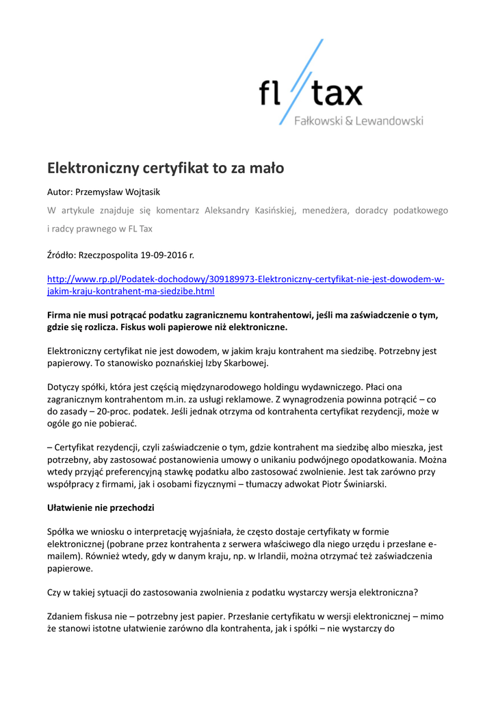 Elektroniczny certyfikat to za mało Autor: Przemysław Wojtasik W artykule znajduje się komentarz Aleksandry Kasińskiej, menedżera, doradcy podatkowego i radcy prawnego w FL Tax Źródło: Rzeczpospolita 19-09-2016 r. http://www.rp.pl/Podatek-dochodowy/309189973-Elektroniczny-certyfikat-nie-jest-dowodem-wjakim-kraju-kontrahent-ma-siedzibe.html Firma nie musi potrącać podatku zagranicznemu kontrahentowi, jeśli ma zaświadczenie o tym, gdzie się rozlicza. Fiskus woli papierowe niż elektroniczne. Elektroniczny certyfikat nie jest dowodem, w jakim kraju kontrahent ma siedzibę. Potrzebny jest papierowy. To stanowisko poznańskiej Izby Skarbowej. Dotyczy spółki, która jest częścią międzynarodowego holdingu wydawniczego. Płaci ona zagranicznym kontrahentom m.in. za usługi reklamowe. Z wynagrodzenia powinna potrącić – co do zasady – 20-proc. podatek. Jeśli jednak otrzyma od kontrahenta certyfikat rezydencji, może w ogóle go nie pobierać. – Certyfikat rezydencji, czyli zaświadczenie o tym, gdzie kontrahent ma siedzibę albo mieszka, jest potrzebny, aby zastosować postanowienia umowy o unikaniu podwójnego opodatkowania. Można wtedy przyjąć preferencyjną stawkę podatku albo zastosować zwolnienie. Jest tak zarówno przy współpracy z firmami, jak i osobami fizycznymi – tłumaczy adwokat Piotr Świniarski. Ułatwienie nie przechodzi Spółka we wniosku o interpretację wyjaśniała, że często dostaje certyfikaty w formie elektronicznej (pobrane przez kontrahenta z serwera właściwego dla niego urzędu i przesłane emailem). Również wtedy, gdy w danym kraju, np. w Irlandii, można otrzymać też zaświadczenia papierowe. Czy w takiej sytuacji do zastosowania zwolnienia z podatku wystarczy wersja elektroniczna? Zdaniem fiskusa nie – potrzebny jest papier. Przesłanie certyfikatu w wersji elektronicznej – mimo że stanowi istotne ułatwienie zarówno dla kontrahenta, jak i spółki – nie wystarczy do udowodnienia miejsca siedziby podatnika w świetle przepisów ustawy o podatku dochodowym od osób prawnych (interpretacja Izby Skarbowej w Poznaniu nr ILPB3/4510-1-281/16-4/ŁM). Przepisy nie określają formy – To kontrowersyjne stanowisko – mówi Beata Hudziak, doradca podatkowy, partner zarządzający w kancelarii 8Tax. – Przepisy nie określają formy certyfikatu. Niewątpliwie łatwiej uzyskać elektroniczny. Wymaganie od zagranicznych kontrahentów papierowych zaświadczeń to dodatkowa komplikacja. Wielu nie zdaje sobie sprawy, że taki dokument jest potrzebny. Beata Hudziak dodaje, że w niektórych krajach, np. Francji czy Hiszpanii, nie ma w ogóle papierowych certyfikatów. Wtedy fiskus dopuszcza formę elektroniczną. Problem jest jednak, tak jak pokazuje opisana interpretacja, z państwami, w których dopuszczalne są obie formy. Ważny przez 12 miesięcy – Aby uniknąć niepotrzebnych kłopotów ze skarbówką, trzeba zadać sobie w takiej sytuacji dodatkowy trud i próbować uzyskać od kontrahenta certyfikat papierowy – mówi Piotr Świniarski. – Zajmuje to często, niestety, dużo czasu. Piotr Świniarski dodaje, że jeszcze dwa lata temu były wątpliwości, jaki jest okres ważności wystawianych przez zagraniczne urzędy certyfikatów. Od 1 stycznia 2015 r. w przepisach zapisano, że jeśli certyfikat nie zawiera okresu ważności, może być stosowany przez 12 miesięcy od dnia wydania. Jeśli zmieni się rezydencja kontrahenta, należy uzyskać nowy. Opinia Aleksandra Kasińska, doradca podatkowy i radca prawny w kancelarii FL Tax Trudno zrozumieć, dlaczego fiskus nie chce honorować elektronicznych certyfikatów, zmuszając przedsiębiorców do uzyskiwania od kontrahentów papierowych. Elektroniczne powinny mieć taki sam status jak papierowe. Krajowa administracja dąży do cyfryzacji kontaktów z podatnikami: wprowadza elektroniczne podpisy, deklaracje, Jednolity Plik Kontrolny, planuje e-paragony. Uniemożliwia jednak korzystanie z elektronicznych dokumentów uzyskanych za granicą. Takie podejście cofa nas do zamierzchłych czasów. W praktyce uzyskanie oryginału certyfikatu rezydencji od kontrahenta, bez względu na jego formę, jest często niełatwe i czasochłonne. Dlatego skarbówka nie powinna dodatkowo utrudniać życia podatnikom. utrudniać życia podatnikom.