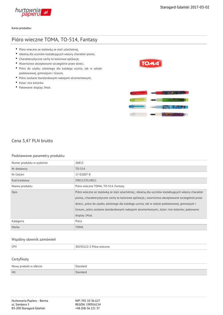 Starogard Gdański 2017-03-02 Karta produktu: Pióro wieczne TOMA, TO-514, Fantasy Pióro wieczne ze stalówką ze stali szlachetnej, Idealną dla uczniów kształtujących własny charakter pisma, Charakterystyczne cechy to kolorowe aplikacje, Wzornictwo akceptowane szczególnie przez dzieci, Pióro do użytku szkolnego dla każdego ucznia, tak w szkole podstawowej, gimnazjum i liceum, Pióro zasilane standardowymi nabojami atramentowymi, Kolor: mix kolorów Pakowane: display 24szt. Cena 3,47 PLN brutto Podstawowe parametry produktu Numer produktu w systemie 26813 Nr dostawcy TO-514 Nr Celcen 17-02007-8 Kod kreskowy 5901133514011 Nazwa produktu Pióro wieczne TOMA, TO-514, Fantasy Opis Pióro wieczne ze stalówką ze stali szlachetnej,; idealną dla uczniów kształtujących własny charakter pisma,; charakterystyczne cechy to kolorowe aplikacje,; wzornictwo akceptowane szczególnie przez dzieci,; pióro do użytku szkolnego dla każdego ucznia, tak w szkole podstawowej, gimnazjum i liceum,; pióro zasilane standardowymi nabojami atramentowymi,; kolor: mix kolorów; pakowane: display 24szt. Kategoria Pióra Marka TOMA Wspólny słownik zamówień CPV 30192122-2 Pióra wieczne Certyfikaty Nowy produkt w ofercie Standard Hit Standard Hurtowania Papieru - Borma ul. Sambora 3 83-200 Starogard Gdański NIP: 592 10 36 627 REGON: 190916154 +48 (58) 56 221 37 Starogard Gdański 2017-03-02 Karta katalogowa produktu cd. Pióro wieczne TOMA, TO-514, Fantasy Cecha Produkt Pióro wieczne Kolor Kolor Mix kolorów Serdecznie zapraszamy do współpracy Hurtowania Papieru - Borma zespół. Hurtowania Papieru - Borma ul. Sambora 3 83-200 Starogard Gdański NIP: 592 10 36 627 REGON: 190916154 +48 (58) 56 221 37