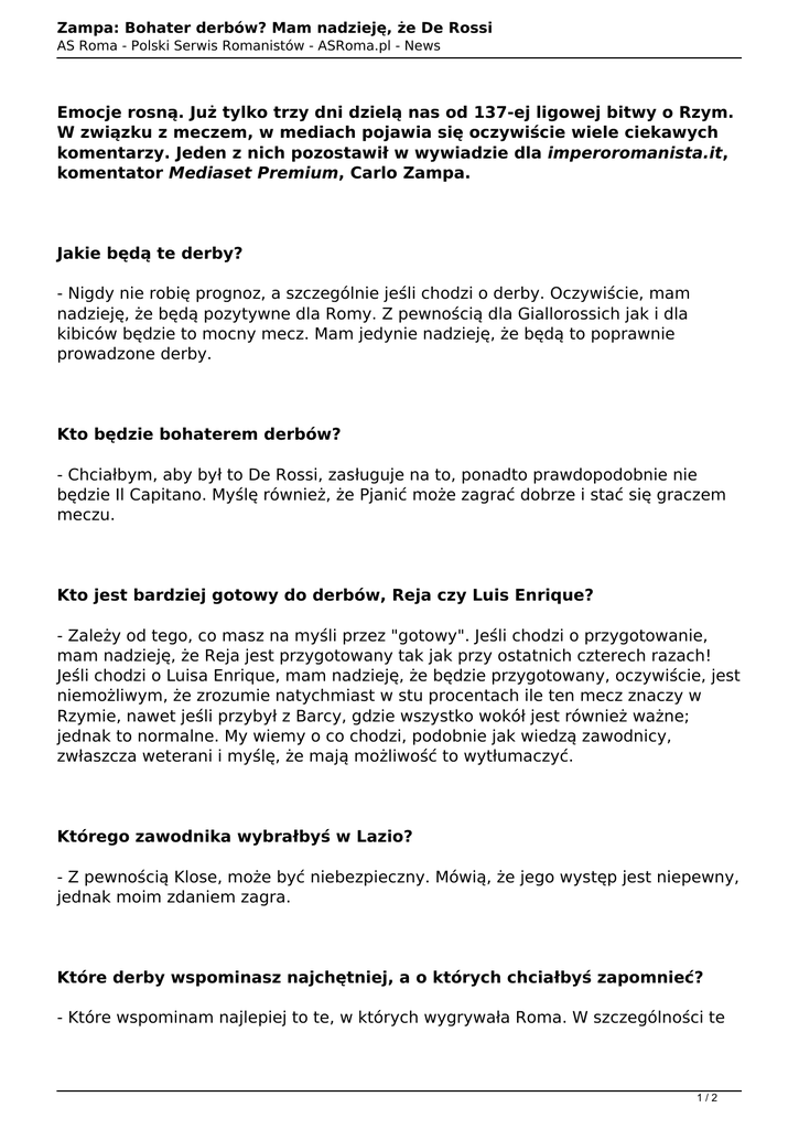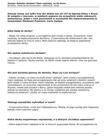 Zampa: Bohater derbów? Mam nadzieję, że De Rossi AS Roma - Polski Serwis Romanistów - ASRoma.pl - News Emocje rosną. Już tylko trzy dni dzielą nas od 137-ej ligowej bitwy o Rzym. W związku z meczem, w mediach pojawia się oczywiście wiele ciekawych komentarzy. Jeden z nich pozostawił w wywiadzie dla imperoromanista.it, komentator Mediaset Premium, Carlo Zampa. Jakie będą te derby? - Nigdy nie robię prognoz, a szczególnie jeśli chodzi o derby. Oczywiście, mam nadzieję, że będą pozytywne dla Romy. Z pewnością dla Giallorossich jak i dla kibiców będzie to mocny mecz. Mam jedynie nadzieję, że będą to poprawnie prowadzone derby. Kto będzie bohaterem derbów? - Chciałbym, aby był to De Rossi, zasługuje na to, ponadto prawdopodobnie nie będzie Il Capitano. Myślę również, że Pjanić może zagrać dobrze i stać się graczem meczu. Kto jest bardziej gotowy do derbów, Reja czy Luis Enrique? - Zależy od tego, co masz na myśli przez "gotowy". Jeśli chodzi o przygotowanie, mam nadzieję, że Reja jest przygotowany tak jak przy ostatnich czterech razach! Jeśli chodzi o Luisa Enrique, mam nadzieję, że będzie przygotowany, oczywiście, jest niemożliwym, że zrozumie natychmiast w stu procentach ile ten mecz znaczy w Rzymie, nawet jeśli przybył z Barcy, gdzie wszystko wokół jest również ważne; jednak to normalne. My wiemy o co chodzi, podobnie jak wiedzą zawodnicy, zwłaszcza weterani i myślę, że mają możliwość to wytłumaczyć. Którego zawodnika wybrałbyś w Lazio? - Z pewnością Klose, może być niebezpieczny. Mówią, że jego występ jest niepewny, jednak moim zdaniem zagra. Które derby wspominasz najchętniej, a o których chciałbyś zapomnieć? - Które wspominam najlepiej to te, w których wygrywała Roma. W szczególności te 1/2 Zampa: Bohater derbów? Mam nadzieję, że De Rossi AS Roma - Polski Serwis Romanistów - ASRoma.pl - News 5-1 z czterema golami Montelli i jednym Tottiego. Następnie te z 1998 roku, zakończone wynikiem 3-3, z pewnością jedne z najpiękniejszych derbów, jak również z najgorszych, gdyż powinniśmy byli wygrać, a skończyło się na remisie. Jednakże wspominam je, gdyż był to bardzo intensywny mecz. Derby, które przegraliśmy usunąłem automatycznie z pamięci. Autor: abruzzi 2/2 Powered by TCPDF (www.tcpdf.org)