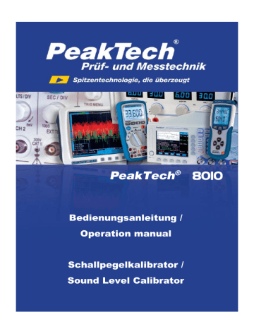 PeakTech® 8010 Bedienungsanleitung / Operation manual Schallpegelkalibrator / Sound Level Calibrator 1. Sicherheitshinweise zum Betrieb des Gerätes Dieses Gerät erfüllt die EU-Bestimmungen 2004/108/EG (elektromagnetische Kompatibilität) entsprechend der Festlegung im Nachtrag 2004/22/EG (CE-Zeichen). Verschmutzungsgrad 2. Zur Betriebssicherheit des Gerätes sind nachfolgend aufgeführte Sicherheitshinweise zum Betrieb des Gerätes zu beachten. Schäden, die durch Nichtbeachtung dieser Hinweise entstehen, sind von Ansprüchen jeglicher Art ausgeschlossen. * * * * * * * * * Gerät keinen extremen Temperaturen, direkter Sonneneinstrahlung, extremer Luftfeuchtigkeit oder Nässe aussetzen Vor Aufnahme des Betriebes sollte das Gerät auf die Umgebungstemperatur stabilisiert sein. Wichtig beim Transport von kalten in warme Räume und umgekehrt. Das hierbei entstehende Kondenswasser kann unter Umständen Ihr Gerät beschädigen. Das Gerät ausgeschaltet auf Zimmertemperatur klimatisieren lassen. Warnhinweise am Gerät unbedingt beachten Gerät nicht in der Nähe starker magnetischer Felder (Motoren, Transformatoren usw.) betreiben Starke Erschütterungen des Gerätes vermeiden Ein Betrieb in explosionsgefährdeten Bereichen bzw. die Anwendung bei Menschen und Tieren ist nicht zulässig. Keine technischen Veränderungen am Gerät vornehmen Öffnen des Gerätes sowie Wartungs- und Reparaturarbeiten dürfen nur von qualifizierten Service-Technikern durchgeführt werden Messgeräte gehören nicht in Kinderhände! -1- Reinigung des Gerätes Gerät nur mit einem feuchten, fusselfreien Tuch reinigen. Nur handelsübliche Spülmittel verwenden. Beim Reinigen unbedingt darauf achten, das keine Flüssigkeit in das Innere des Gerätes gelangt. Dies könnten zu einem Kurschluss und zur Zerstörung des Gerätes führen. 2. Allgemeines Der Schallpegelkalibrator PeakTech® 8010 erfüllt die Anforderungen nach EN 60942:2003 Klasse2 und dient zur Überprüfung der Genauigkeit von Schallpegelmessgeräten. Der Kalibrator erzeugt ein definiertes Schallpegelsignal mit einem Schallpegel von 94 dB (Dezibel) oder 114 dB bei einer Tonfrequenz von 1000Hz. Es können Schallpegelmessgeräte, welche über ein Mikrofon mit einem Durchmesser von ½“ (12,7mm) verfügen, in die Kalibrieröffnung des Kalibrators gesteckt werden. Die spezifizierten Genauigkeiten sind bei einem atmosphärischen Druck von 1013 hPa, einer Umgebungstemperatur von 23°C und einer Luftfeuchtigkeit von 65% RH gegeben. -2- 3. Anschlüsse und Bedienelemente am Gerät 1 2 3 1. 2. 3. Eingang für Mikrofon Wahlschalter OFF / 94 dB / 114 dB Batteriefach -3- 4. Messbetrieb 1. Führen Sie das Mikrofon Ihres Schallpegelmessgerätes in die Kalibrieröffnung des PeakTech 8010. Achten Sie darauf, dass das Mikrofon vollständig in die Kalibrieröffnung eingesteckt ist. 2. Wählen Sie mit Hilfe des Wahlschalters (2) den benötigten Schallpegel aus; 94 oder 114 dB. 3. Lesen Sie nun den Messwert in der Anzeige Ihres Schallpgelmessgerätes ab. 4. Sollte der Messwert nicht mit dem voreingestellten Kalibriersignal übereinstimmen, können Sie das Schallpegelmessgerät neu abgleichen. Sehen Sie hierzu in die Bedienungsanleitung Ihres Schallpegelmessgerätes oder fragen Sie bei Ihrem Händler nach. 5. Nach erfolgter Messung sollte der Schallpegelkalibrator immer ausgeschaltet werden. Wählen Sie hierzu die „OFF“Position des Wahlschalters. 5. Technische Daten Ausgangssignal Ausgangsfrequenz Referenzbedingungen Genauigkeit Batteriezustandstest Diese Gerät erfüllt die Standards Abmessungen (BxHxT) Gewicht 94 dB oder 114 dB Schallpegel 1000 Hz; +/-4% Temperatur: 23°C (73°F) Druck: 1013 mbar Luftfeuchte: 65% RH +/- 0,5 dB Der Kalibrator stoppt die Ausgabe eines Schallpegels, wenn die Batteriespannung unter die Mindestanforderung fällt. EN 60942:2003 Klasse 2 CE: EN 61326-1, EN 61326-2-1 51 x 120 x 43mm 130 g -4- 6. Auswechseln der Batterie Wird kein Schalldruckpegel ausgegeben, dann muss die Batterie ausgewechselt werden Dazu wie beschrieben vorgehen: 1. Schraube der Batteriefachabdeckung auf der Rückseite lösen und Abdeckung vom Batteriefach entfernen, 2. verbrauchte Batterie aus dem Batteriefach entfernen und vom Batteriekabel abziehen, 3. neue 9 V Batterie an das Batteriekabel anschließen und Batterie in das Batteriefach einsetzen 4. Batteriefachdeckel wieder auflegen und mit der Schraube wieder befestigen. -5- Gesetzlich vorgeschriebene Hinweise zur Batterieverordnung Im Lieferumfang vieler Geräte befinden sich Batterien, die z. B. zum Betrieb von Fernbedienungen dienen. Auch in den Geräten selbst können Batterien oder Akkus fest eingebaut sein. Im Zusammenhang mit dem Vertrieb dieser Batterien oder Akkus sind wir als Importeur gemäß Batterieverordnung verpflichtet, unsere Kunden auf folgendes hinzuweisen: Bitte entsorgen Sie Altbatterien, wie vom Gesetzgeber - die Entsorgung im Hausmüll ist laut Batterieverordnung ausdrücklich verboten-, an einer kommunalen Sammelstelle oder geben Sie sie im Handel vor Ort kostenlos ab. Von uns erhaltene Batterien können Sie nach Gebrauch bei uns unter der auf der letzten Seite angegeben Adresse unentgeltlich zurückgeben oder ausreichend frankiert per Post an uns zurücksenden. Batterien, die Schadstoffe enthalten, sind mit dem Symbol einer durchgekreuzten Mülltonne gekennzeichnet, ähnlich dem Symbol in der Abbildung links. Unter dem Mülltonnensymbol befindet sich die chemische Bezeichnung des Schadstoffes z. B. „CD“ für Cadmium, „Pb“ steht für Blei und „Hg“ für Quecksilber. Weitere Hinweise zur Batterieverordnung finden Sie beim Bundesministerium für Umwelt, Naturschutz und Reaktorsicherheit. -6- Alle Rechte, auch die der Übersetzung, des Nachdruckes und der Vervielfältigung oder Teilen daraus, vorbehalten. Reproduktion jeder Art (Fotokopien, Mikrofilm oder ein anderes Verfahren) nur mit schriftlicher Genehmigung des Herausgebers gestattet. Letzter Stand bei Drucklegung. Technische Änderunge