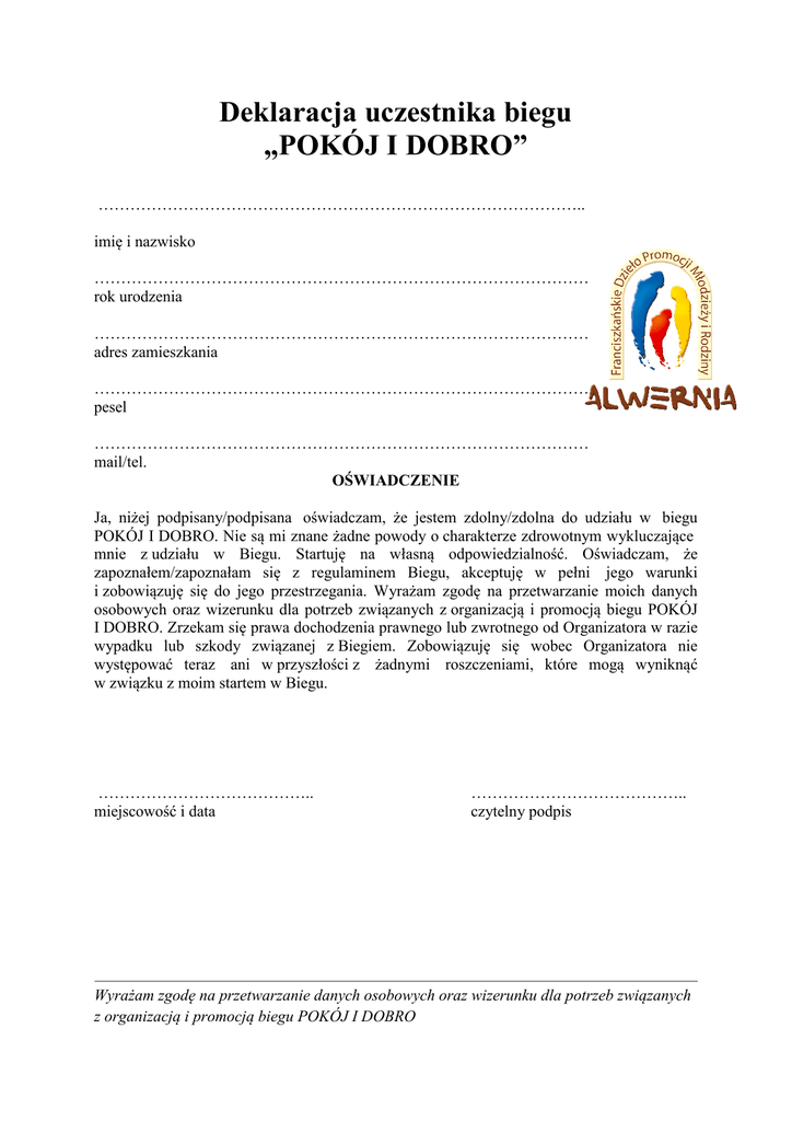 DEKLARACJA dla dorosłych bieg pokój i dobro