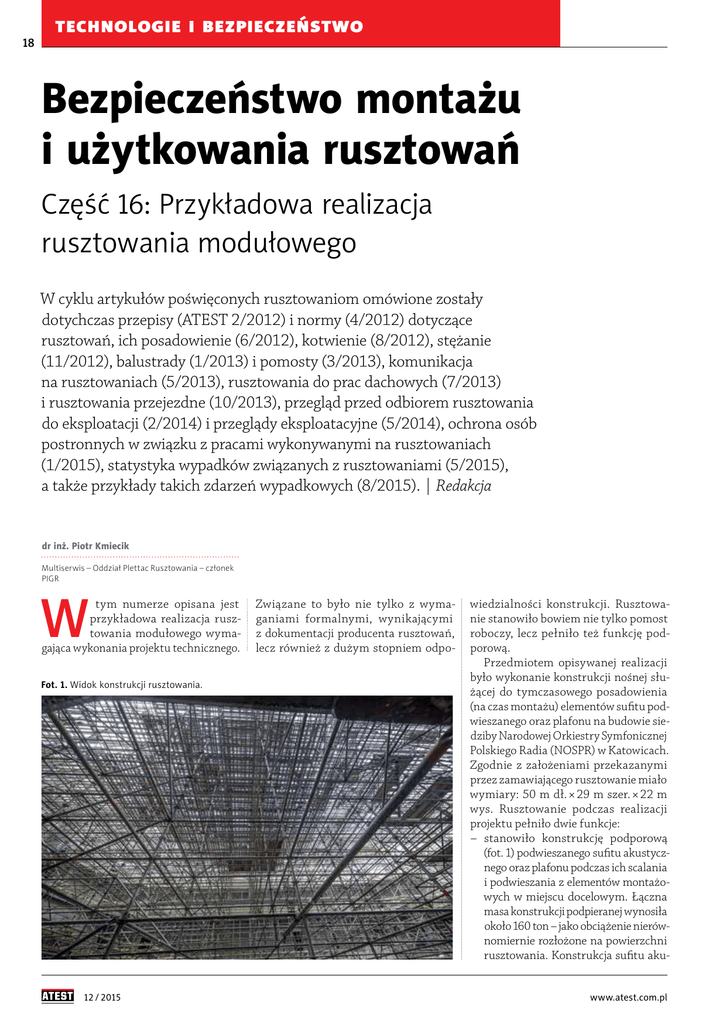 18 technologie i bezpieczeństwo Bezpieczeństwo montażu i użytkowania rusztowań Część 16: Przykładowa realizacja rusztowania modułowego W cyklu artykułów poświęconych rusztowaniom omówione zostały dotychczas przepisy (ATEST 2/2012) i normy (4/2012) dotyczące rusztowań, ich posadowienie (6/2012), kotwienie (8/2012), stężanie (11/2012), balustrady (1/2013) i pomosty (3/2013), komunikacja na rusztowaniach (5/2013), rusztowania do prac dachowych (7/2013) i rusztowania przejezdne (10/2013), przegląd przed odbiorem rusztowania do eksploatacji (2/2014) i przeglądy eksploatacyjne (5/2014), ochrona osób postronnych w związku z pracami wykonywanymi na rusztowaniach (1/2015), statystyka wypadków związanych z rusztowaniami (5/2015), a także przykłady takich zdarzeń wypadkowych (8/2015). | Redakcja dr inż. Piotr Kmiecik Multiserwis – Oddział Plettac Rusztowania – członek PIGR W tym numerze opisana jest przykładowa realizacja rusztowania modułowego wymagająca wykonania projektu technicznego. Fot. 1. Widok konstrukcji rusztowania. 12 / 2015 Związane to było nie tylko z wymaganiami formalnymi, wynikającymi z dokumentacji producenta rusztowań, lecz również z dużym stopniem odpo- wiedzialności konstrukcji. Rusztowanie stanowiło bowiem nie tylko pomost roboczy, lecz pełniło też funkcję podporową. Przedmiotem opisywanej realizacji było wykonanie konstrukcji nośnej służącej do tymczasowego posadowienia (na czas montażu) elementów sufitu podwieszanego oraz plafonu na budowie siedziby Narodowej Orkiestry Symfonicznej Polskiego Radia (NOSPR) w Katowicach. Zgodnie z założeniami przekazanymi przez zamawiającego rusztowanie miało wymiary: 50 m dł. × 29 m szer. × 22 m wys. Rusztowanie podczas realizacji projektu pełniło dwie funkcje: –stanowiło konstrukcję podporową (fot. 1) podwieszanego sufitu akustycznego oraz plafonu podczas ich scalania i podwieszania z elementów montażowych w miejscu docelowym. Łączna masa konstrukcji podpieranej wynosiła około 160 ton – jako obciążenie nierównomiernie rozłożone na powierzchni rusztowania. Konstrukcja sufitu akuwww.atest.com.pl 19 Ryc. 1.Projekt techniczny rusztowania – przekrój poprzeczny. stycznego została podparta przez rusztowanie w 138 miejscach; – było pomostem roboczym do scalania elementów sufitu, znajdującym się około 1,5 m poniżej konstrukcji sufitu, tj. na wysokości 18–19 m od poziomu posadowienia. Sufit w Wielkiej Sali siedziby NOSPR nie jest zwykłym podwieszanym sufitem, a sufitem akustycznym1. Jego specyficzna stalowa konstrukcja jest mocno pofalowana, aby jak najlepiej odbijać dźwięk w kierunku poszczególnych części widowni. Do kratownic dachowych podwieszony jest sufit oraz plafon, czyli obniżona część sufitu, w kształcie wycinka sfery. Znajduje się on bezpośrednio nad estradą i ma odbijać dźwięki emi- towane z estrady, ale w kierunku muzyków. Na plafonie zamontowane zostało także główne oświetlenie orkiestry. Średnica konstrukcji plafonu to 15 m. Między dźwigarami dachowymi a sufitem akustycznym jest wolna przestrzeń, w której znajdują się m.in. pomosty techniczne. Konstrukcja sufitu, plafonu i pomostów technicznych spoczywających Fot. 2. Widok konstrukcji sufitu opartej na rusztowaniu. ATEST – OCHRONA PRACY 12 / 2015 20 a Ryc. 2a i b.Analiza statyczna podparcia konstrukcji. b na rusztowaniach stanowiła niebagatelny ciężar, a mianowicie: – ciężar całkowity sufitu: 100 000 kg (75 000 kg to masa tzw. elementów wysyłkowych oraz 25 000 kg elementów dodatkowych rozłożona na poszczególne segmenty sufitu), – ciężar pomostów znajdujących się nad sufitem podwieszanym: 40 000 kg (łączna powierzchnia pomostów około 300 m 2) – rozmieszczono równomiernie jako siły skupione na każdy element sufitu występujący pod elementem pomostu, 12 / 2015 – ciężar plafonu: 20 000 kg (powierzchnia plafonu: 186 m2). Na etapie przygotowania projektu (ryc. 1) klient przekazał informację, że nie posiada szczegółowych danych dotyczących przekazywania obciążeń z konstrukcji stropu akustycznego na konstrukcję rusztowania podporowego. Analiza wykazała, że obciążenie nie przekazuje się w sposób równomierny (każdy z elementów wysyłkowych ma inną masę i wymiary, ponadto układ przestrzenny sufitu powoduje, że elementy wysyłkowe są zorientowane pod różnym kątem do płaszczyzny poziomej). Z tego powodu należało wykonać szczegółową analizę statyczną (ryc. 2a, b). Pojedyncze elementy montażowe sufitu określono jako elementy opierające się na rusztowaniu – było ich ponad 20. Konstrukcję zwymiarowano korzystając z programu Autodesk Robot Structural Analysis, określając w ten sposób reakcje przekazywane na rusztowanie. Wyniki obliczeń statycznych podparcia elementów stropu akustycznego wskazały, że obciążenie przekazywane na rusztowanie przekracza nośność stojaków w standardowym układzie geometrycznym rusztowania (rozstaw rygli co 2 m na wysokości rusztowania). W miejscu przekazywania znacznych obciążeń skupionych wzmocniono stojaki rusztowania poprzez skrócenie ich długości wyboczeniowych dzięki rozmieszczeniu rygli i stężeń co 1 m wysokości rusztowania. Istotnym problemem wynikającym z posadowienia rusztowań na stropie budynku była ograniczona wielkość reakcji, którą mógł przenieść strop. W fazie projektowania należało tak www.atest.com.pl 21 Fot. 3. Szczegół podparcia konstrukcji na rusztowaniowych podstawkach śrubowych. dostosować rozstaw i liczbę podpór, aby obciążenie przekazywane na posadzkę z pojedynczego stojaka nie przekraczało założonej wartości określonej przez projektanta obiektu. Po zakończeniu fazy projektowania i uzyskaniu akceptacji projektu przez kierownictwo budowy można było przystąpić do montażu rusztowań. W fazie realizacji prace rozpoczęto od wytyczenia lokalizacji stojaków rusztowania. Po wytyczeniu główny