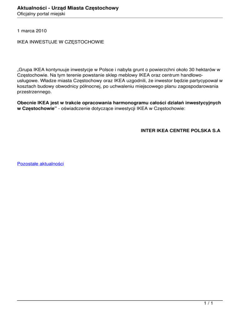 Aktualności - Urząd Miasta Częstochowy Oficjalny portal miejski 1 marca 2010 IKEA INWESTUJE W CZĘSTOCHOWIE „Grupa IKEA kontynuuje inwestycje w Polsce i nabyła grunt o powierzchni około 30 hektarów w Częstochowie. Na tym terenie powstanie sklep meblowy IKEA oraz centrum handlowousługowe. Władze miasta Częstochowy oraz IKEA uzgodnili, że inwestor będzie partycypował w kosztach budowy obwodnicy północnej, po uchwaleniu miejscowego planu zagospodarowania przestrzennego. Obecnie IKEA jest w trakcie opracowania harmonogramu całości działań inwestycyjnych w Częstochowie” - oświadczenie dotyczące inwestycji IKEA w Częstochowie: INTER IKEA CENTRE POLSKA S.A Pozostałe aktualności 1/1 Powered by TCPDF (www.tcpdf.org)