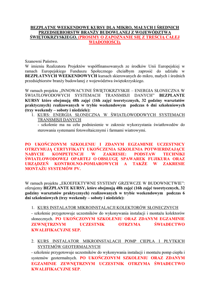 BEZPŁATNE WEEKENDOWE KURSY DLA MIKRO, MAŁYCH I ŚREDNICH PRZEDSIĘBIORSTW BRANŻY BUDOWLANEJ Z WOJEWÓDZTWA ŚWIĘTOKRZYSKIEGO. (PROSIMY O ZAPOZNANIE SIĘ Z TREŚCIĄ CAŁEJ WIADOMOŚCI). Szanowni Państwo. W imieniu Realizatora Projektów współfinansowanych ze środków Unii Europejskiej w ramach Europejskiego Funduszu Społecznego chciałbym zaprosić do udziału w BEZPŁATNYCH WEEKENDOWYCH kursach skierowanych do mikro, małych i średnich przedsiębiorstw branży budowlanej z województwa świętokrzyskiego. W ramach projektu „INNOWACYJNE ŚWIĘTOKRZYSKIE – ENERGIA SŁONECZNA W ŚWIATŁOWODOWYCH SYSTEMACH TRANSMISJI DANYCH” BEZPŁANTE KURSY które obejmują 48h zajęć (16h zajęć teoretycznych, 32 godziny warsztatów praktycznych) realizowanych w trybie weekendowym podczas 6 dni szkoleniowych (trzy weekendy – soboty i niedziele): 1. KURS: ENERGIA SŁONECZNA W ŚWIATŁOWODOWYCH SYSTEMACH TRANSMISJI DANYCH - szkolenie ma na celu podniesienie w zakresie wykorzystania światłowodów do sterowania systemami fotowoltaicznymi i farmami wiatrowymi. PO UKOŃCZONYM SZKOLENIU I ZDANYM EGZAMINIE UCZESTNICY OTRZYMUJĄ CERTYFIKATY UKOŃCZENIA SZKOLENIA POTWIERDZAJĄCE NABYCIE KOMPETENCJI W ZAKRESIE: PODSTAW TECHNIKI ŚWIATŁOWODOWEJ OPARTEJ O OBSŁUGĘ SPAWAREK FUJIKURA ORAZ URZĄDZEŃ KONTROLNO-POMIAROWYCH A TAKŻE W ZAKRESIE MONTAŻU SYSTEMÓW PV. W ramach projektu „EKOEFEKTYWNE SYSTEMY GRZEWCZE W BUDOWNICTWIE”: oferujemy BEZPŁANTE KURSY, które obejmują 48h zajęć (16h zajęć teoretycznych, 32 godziny warsztatów praktycznych) realizowanych w trybie weekendowym podczas 6 dni szkoleniowych (trzy weekendy – soboty i niedziele): 1. KURS INSTALATOR MIKROINSTALACJI KOLEKTORÓW SŁONECZNYCH - szkolenie przygotowuje uczestników do wykonywania instalacji i montażu kolektorów słonecznych. PO UKOŃCZONYM SZKOLENIU ORAZ ZDANYM EGZAMINIE ZEWNĘTRZNYM UCZESTNIK OTRZYMA ŚWIADECTWO KWALIFIKACYJNE SEP. 2. KURS INSTALATOR MIKROINSTALACJI POMP CIEPŁA I PŁYTKICH SYSTEMÓW GEOTERMALNYCH - szkolenie przygotowuje uczestników do wykonywania instalacji i montażu pomp ciepła i systemów geotermalnych. PO UKOŃCZONYM SZKOLENIU ORAZ ZDANYM EGZAMINIE ZEWNĘTRZNYM UCZESTNIK OTRZYMA ŚWIADECTWO KWALIFIKACYJNE SEP. W szkoleniach mogą wziąć udział pracownicy (oddelegowani przez pracodawców) mikro, małych i średnich przedsiębiorstw, bądź osoby prowadzące własną działalność gospodarczą czyli wszystkie firmy które posiadają wpis w CEiDG lub KRS - PKD 2007 - sekcja D, dział F.41, F.42, F.43 - weryfikacja na podstawie KRS/CEIDG) na terenie województwa świętokrzyskiego oraz firma musi spełniać kryteria ubiegania się o pomoc de minimis – w przeciągu ostatnich 3 lat uzyskana pomoc de minimis nie przekroczyła 200 tysiecy euro (w przypadku gdyby firma uzyskała w ostatnich 3 latach pomoc de minimis – firma musi przedstawić zaświadczenia o uzyskanej pomocy de minimis) oraz nie jest w likwidacji oraz żeby działalność gospodarcza nie była zawieszona. ZAPEWNIAMY: wyżywienie, zakwaterowanie na czas szkolenia, dostęp do specjalistycznego sprzętu. SZKOLENIE ENERGETYCZNE MOŻE ZAWIERAĆ ELEMENTY ZAKRESU ELEKTRYCZNEGO (GRUPA G1), ZAKRESU CIEPLNEGO (GRUPA G2) ORAZ GAZOWEGO (GRUPA G3) – PO ZDANYM EGZAMINIE, KTÓREGO KOSZT POKRYWANY JEST W RAMACH PROJEKTU - Z DANEJ GRUPY TEMATYCZNEJ MOŻNA UZYSKAĆ KWALIFIKACJE: Grupa I. Urządzenia , instalacje i sieci elektroenergetyczne wytwarzające, przetwarzające, przesyłające i zużywające energię elektryczną: 1) Urządzenia prądotwórcze przyłączone do krajowej sieci elektroenergetycznej bez względu na wysokość napięcia znamionowego; 2) Urządzenia, instalacje i sieci elektroenergetyczne o napięciu nie wyższym niż 1 kV; 3) Urządzenia, instalacje i sieci o napięciu znamionowym powyżej 1 kV; 4) Zespoły prądotwórcze o mocy powyżej 50 kW; 5) Urządzenie elektrotermiczne; 6) Urządzenia do elektrolizy; 7) Sieci elektrycznego oświetlenia ulicznego; 8) Elektryczna sieć trakcyjna; 9) Elektryczne urządzenia w wykonaniu przeciwwybuchowym; 10) Aparatura kontrolno- pomiarowa oraz urządzenia i instalacje automatycznej regulacji; sterowania i zabezpieczeń urządzeń i instalacji wymienionych w pkt. Grupa II. Urządzenia wytwarzające, przetwarzające, przesyłające i zużywające ciepło oraz inne urządzenia energetyczne: 1) Kotły parowe oraz wodne na paliwa stałe, płynne i gazowe o mocy powyżej 50 kW, wraz z urządzeniami pomocniczymi; 2) Sieci i instalacje cieplne wraz z urządzeniami pomocniczymi, o przesyle ciepła powyżej 50 kW; 3) Turbiny parowe oraz wodne o mocy powyżej 50 kW, wraz z urządzeniami pomocniczymi ; 4) Przemysłowe urządzenia odbiorcze pary i gorącej wody, o mocy powyżej 50 kW; 5) Urządzenia wentylacji, klimatyzacji i chłodnicze, o mocy powyżej 50 kW; 6) Pompy, ssawy, wentylatory i dmuchawy, o mocy powyżej 50 kW; 7) Sprężarki o mocy powyżej 20 kW oraz instalacje sprężonego powietrza i gazów technicznych; 8) Urządzenia do składowania, magazynowania i rozładunku paliw, o pojemności składowania odpowiadającej masie ponad 100 Mg; 9) Piece przemysłowe o mocy powyżej 50 kW; 10) Aparatura kontrolno-pomiarowa i urządzenia automatycznej regulacji do urządzeń i instalacji wymienionych w pkt Grupa III. Urządzenia, instalacje i sieci gazowe wytwarzające, przetwarzające, przesyłające, magazynujące i zużywające paliwa gazowe: 1) Urządzenia do produkcji paliw gazowych, generatory gazu; 2) Urządzenia do przetwarzania i uzdatniania paliw gazowych, rozkładnie paliw gazowych, urządzenia przeróbki gazu ziemnego, oczyszczalnie gazu, rozprężalnie i rozlewnie gazu płynnego, odazotownie, mieszalnie; 3) Urządzenia do magazynowania paliw gazowych; 4) Sieci gazowe rozdzielcze o ciśnieniu nie wyższym niż 0,5 MPa (gazociągi i punkty redukcyjne, stacje gazowe); 5) Sieci gazowe przesyłowe o ciśnieniu powyżej 0,5 MPa (gazociągi, stacje gazowe, tłocznie gazu); 6) Urządz