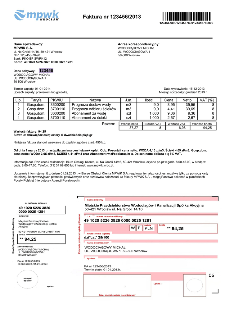 Faktura nr 123456/2013 12345678901234567890123456789000 Dane sprzedawcy: MPWIK S.A. Adres korespondencyjny: WODOCIĄGOWY MICHAŁ UL. WODOCIĄGOWA 1 50-500 Wrocław ul. Na Grobli 14/16, 50-421 Wrocław NIP: 123-456-78-90 Bank: PKO BP SWRK12 Konto: 49 1020 5226 3826 0000 0025 1281 Dane nabywcy: 123456 WODOCIĄGOWY MICHAŁ UL. WODOCIĄGOWA 1 50-500 Wrocław Termin zapłaty: 01-01-2014 Sposób zapłaty: przelewem lub gotówką L.p. 1 2 3 4 Taryfa Gosp.dom. Gosp.dom. Gosp.dom. Gosp.dom. PKWiU 3600200 3700110 3600200 3700110 Data wystawienia: 15-12-2013 Miesiąc sprzedaży: grudzień 2013 r. Nazwa Prognoza dostaw wody Prognoza odbioru ścieków Abonament za wodę Abonament za ścieki Razem: J.m. m3 m3 szt szt Ilość Cena 3,95 4,41 9,36 2,67 9,0 9,0 1,000 1,000 Netto 35,55 39,69 9,36 2,67 VAT [%] 8 8 8 8 Wartść netto Stawka VAT Wartość VAT Wartość brutto 87,27 8 6,98 94,25 Wartość faktury: 94,25 Słownie: dziewięćdziesiąt cztery zł dwadzieścia pięć gr Niniejsza faktura stanowi wezwanie do zapłaty zgodnie z art. 455 k.c. Od dnia 1 marca 2013r. nastąpiła zmiana cen i stawek opłat: Odb. Pozostali cena netto: WODA 4,15 zł/m3, Ścieki 4,69 zł/m3; Gosp.dom. cena netto: WODA 3,95 zł/m3, ŚCIEKI 4,41 zł/m3 oraz Abonament w zł/odbiorcę/m-c. Do cen netto dolicza się 8% VAT. Informacje dot. Rozliczeń i reklamacje: Biuro Obsługi Klienta, ul. Na Grobli 14/16, 50-421 Wrocław, czynne pn-pt w godz. 8.00-15.00, w środę w godz. 8.00-17.00. Telefon: (71) 34 09 655 lub internet: www.mpwik.wroc.pl. Uprzejmie informujemy, iż z dniem 01.02.2013r. w Biurze Obsługi Klienta MPWiK S.A. regulowanie należności jest możliwe tylko za pomocą karty płatniczej. Bezprowizyjnych płatności gotówkowych oraz przelewów należności za faktury MPWiK S.A. , mogą Państwo dokonać w placówkach Poczty Polskiej (nie dotyczy Agencji Pocztowych).